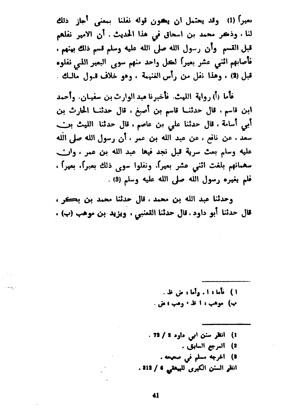 بَعِيرًا وَقَدْ يُحْتَمَلُ أَنْ يَكُونَ قَوْلُهُ نَفَلَنَا بِمَعْنَى أَجَازَ ذَلِكَ لَنَا وَذَكَرَ مُحَمَّدُ بْنُ إِسْحَاقَ فِي هَذَا الْحَدِيثِ أَنَّ الْأَمِيرَ نَفَلَهَمْ قَبْلَ الْقَسْمِ وَأَنَّ رَسُولَ اللَّهِ صَلَّى اللَّهُ عَلَيْهِ وَسَلَّمَ قَسَّمَ ذَلِكَ بَيْنَهُمْ فَأَصَابَهُمُ اثْنَيْ عَشَرَ بَعِيرًا لِكُلِّ وَاحِدٍ مِنْهُمْ سِوَى الْبَعِيرِ الَّذِي نُفِلُوهُ قَبْلُ وَهَذَا نَفْلٌ مِنْ رَأْسِ الْغَنِيمَةِ وَهُوَ خِلَافُ قَوْلِ مَالِكٍ فَأَمَّا رِوَايَةُ اللَّيْثِ فَأَخْبَرَنَا عَبْدُ الْوَارِثِ بْنُ سُفْيَانَ وَأَحْمَدُ بْنُ قَاسِمٍ قَالَ حَدَّثَنَا قَاسِمُ بْنُ أَصْبَغَ قَالَ حَدَّثَنَا الْحَارِثُ بْنُ أَبِي أُسَامَةَ قَالَ حَدَّثَنَا عَلِيُّ بْنُ عَاصِمٍ قَالَ حَدَّثَنَا اللَّيْثُ بْنُ سَعْدٍ عَنْ نَافِعٍ عَنْ عَبْدِ اللَّهِ بْنِ عُمَرَ أَنَّ رَسُولَ اللَّهِ صلى الله عَلَيْهِ وَسَلَّمَ بَعَثَ سَرِيَّةً قِبَلَ نَجْدٍ فِيهَا عَبْدُ اللَّهِ بْنُ عُمَرَ وَأَنَّ سُهْمَانَهُمْ بَلَغَتِ اثْنَيْ عَشَرَ بَعِيرًا وَنُفِلُوا سِوَى ذَلِكَ بَعِيرًا بَعِيرًا فَلَمْ يُغَيِّرْهُ رَسُولِ اللَّهِ صَلَّى اللَّهُ عَلَيْهِ وَسَلَّمَ وَحَدَّثَنَا عَبْدُ اللَّهِ بْنُ مُحَمَّدٍ قَالَ حَدَّثَنَا مُحَمَّدُ بْنُ بَكْرٍ قَالَ حَدَّثَنَا أَبُو دَاوُدَ قَالَ حدثنا القعنبي وَيَزِيدُ بْنُ مَوْهَبٍ
