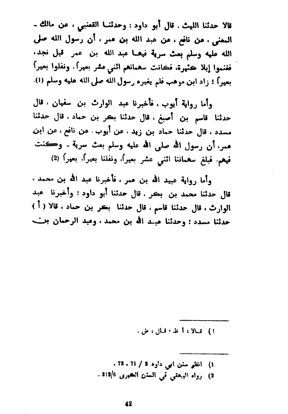 قَالَا حَدَّثَنَا اللَّيْثُ قَالَ أَبُو دَاوُدَ وَحَدَّثَنَا القعنبي عَنْ مَالِكٍ الْمَعْنَى عَنْ نَافِعٍ عَنْ عَبْدِ اللَّهِ بْنِ عُمَرَ أَنَّ رَسُولَ الله صلى اللَّهُ عَلَيْهِ وَسَلَّمَ بَعَثَ سَرِيَّةً فِيهَا عَبْدُ اللَّهِ بْنُ عُمَرَ قِبَلَ نَجْدٍ فَغَنِمُوا إِبِلًا كَثِيرَةً فَكَانَتْ سُهْمَانُهُمُ اثْنَيْ عَشَرَ بَعِيرًا وَنُفِلُوا بَعِيرًا بَعِيرًا زَادَ ابْنُ مَوْهَبٍ فَلَمْ يُغَيِّرْهُ رَسُولِ اللَّهِ صَلَّى اللَّهُ عَلَيْهِ وَسَلَّمَ وَأَمَّا رِوَايَةُ أَيُّوبَ فَأَخْبَرَنَا عَبْدُ الْوَارِثِ بْنُ سُفْيَانَ قَالَ حَدَّثَنَا قَاسِمُ بْنُ أَصْبَغَ قَالَ حَدَّثَنَا بَكْرُ بْنُ حَمَّادٍ قَالَ حَدَّثَنَا مُسَدَّدٌ قَالَ حَدَّثَنَا حَمَّادُ بْنُ زَيْدٍ عَنْ أَيُّوبَ عَنْ نَافِعٍ عَنِ ابْنِ عُمَرَ أَنَّ رَسُولَ اللَّهِ صَلَّى اللَّهُ عَلَيْهِ وَسَلَّمَ بَعَثَ سَرِيَّةً وَكُنْتُ فِيهِمْ فَبَلَغَ سُهْمَانُنَا اثْنَيْ عَشَرَ بَعِيرًا وَنُفِّلْنَا بَعِيرًا بَعِيرًا وَأَمَّا رِوَايَةُ عُبَيْدِ اللَّهِ بْنِ عُمَرَ فَأَخْبَرَنَا عَبْدُ اللَّهِ بْنُ مُحَمَّدٍ قَالَ حَدَّثَنَا مُحَمَّدُ بْنُ بَكْرٍ قَالَ حَدَّثَنَا أَبُو دَاوُدَ وَأَخْبَرَنَا عَبْدُ الْوَارِثِ قَالَ حَدَّثَنَا قَاسِمٌ قَالَ حَدَّثَنَا بَكْرُ بْنُ حَمَّادٍ قَالَا حَدَّثَنَا مُسَدَّدٌ وَحَدَّثَنَا عَبْدُ اللَّهِ بْنُ مُحَمَّدٍ وَعَبْدُ الرحمان بن