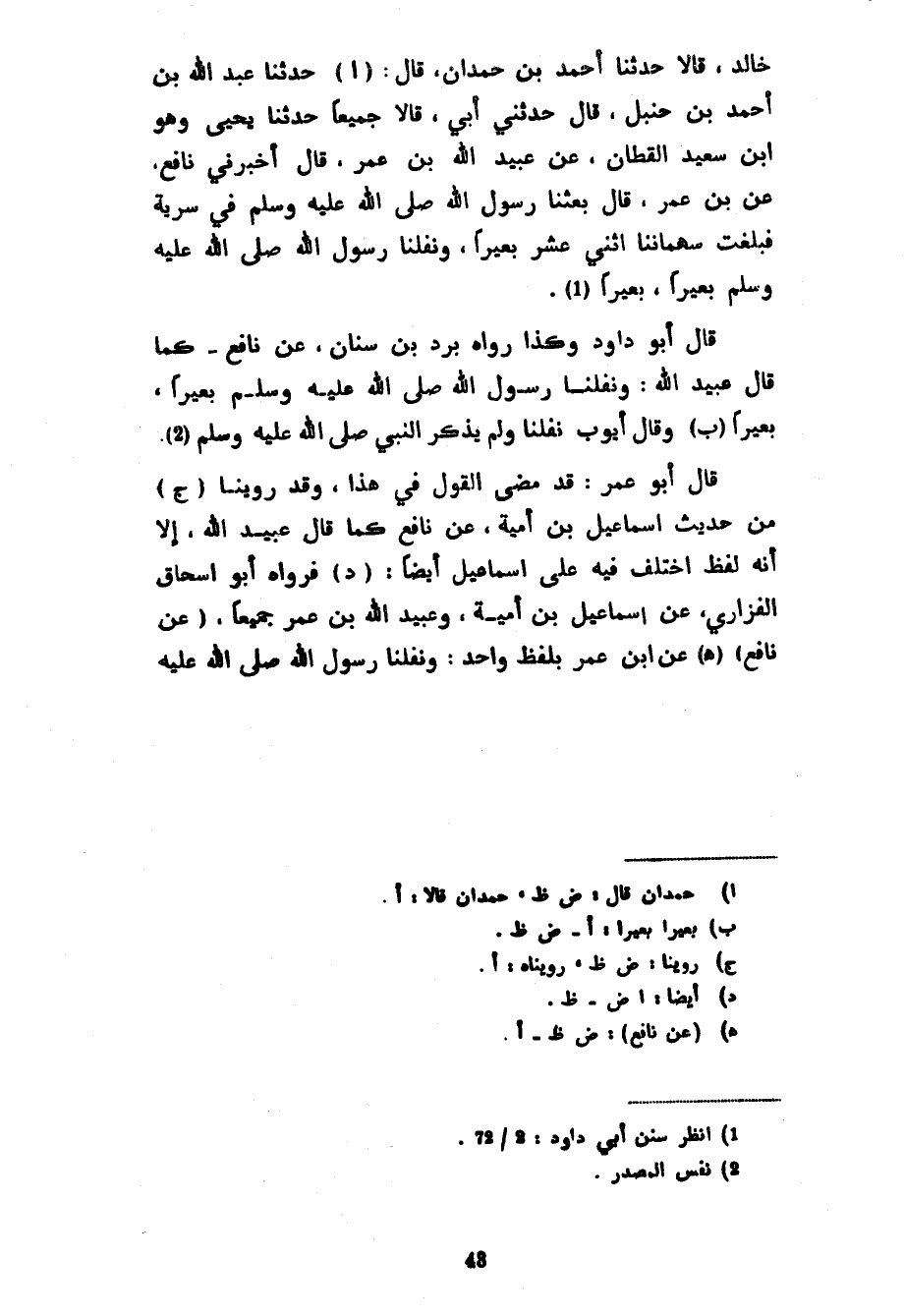 خَالِدٍ قَالَا حَدَّثَنَا أَحْمَدُ بْنِ حَمْدَانَ قَالَ حَدَّثَنَا عَبْدُ اللَّهِ بْنُ أَحْمَدَ بْنِ حَنْبَلٍ قَالَ حَدَّثَنِي أَبِي قَالَا جَمِيعًا حَدَّثَنَا يَحْيَى وَهُوَ ابْنُ سَعِيدٍ الْقَطَّانُ عَنْ عُبَيْدِ اللَّهِ بْنِ عُمَرَ قَالَ أَخْبَرَنِي نَافِعٌ عَنِ ابْنِ عُمَرَ قَالَ بَعَثَنَا رَسُولُ اللَّهِ صَلَّى اللَّهُ عَلَيْهِ وَسَلَّمَ فِي سَرِيَّةٍ فَبَلَغَتْ سُهْمَانُنَا اثْنَيْ عَشَرَ بَعِيرًا وَنَفَلَنَا رَسُولُ اللَّهِ صَلَّى اللَّهُ عَلَيْهِ وَسَلَّمَ بَعِيرًا بَعِيرًا قَالَ أَبُو دَاوُدَ وَكَذَا رَوَاهُ بُرْدُ بْنُ سِنَانٍ عَنْ نَافِعٍ كَمَا قَالَ عُبَيْدُ اللَّهِ وَنَفَلَنَا رَسُولُ اللَّهِ صَلَّى اللَّهُ عَلَيْهِ وَسَلَّمَ بَعِيرًا بَعِيرًا وَقَالَ أَيُّوبُ نَفَلَنَا وَلَمْ يَذْكُرِ النَّبِيِّ صَلَّى اللَّهُ عَلَيْهِ وَسَلَّمَ قَالَ أَبُو عُمَرَ قَدْ مَضَى الْقَوْلُ فِي هَذَا وَقَدْ رَوَيْنَا مِنْ حَدِيثِ إِسْمَاعِيلَ بْنِ أُمَيَّةَ عَنْ نَافِعٍ كَمَا قَالَ عُبَيْدُ اللَّهِ إِلَّا أَنَّهُ لَفْظٌ اخْتُلِفَ فِيهِ عَلَى إِسْمَاعِيلَ أَيْضًا فَرَوَاهُ أَبُو إِسْحَاقَ الْفَزَارِيُّ عَنْ إِسْمَاعِيلَ بْنِ أُمَيَّةَ وَعُبَيْدِ اللَّهِ بْنِ عمر جميعا (عن نافع) (هـ) عَنِ ابْنِ عُمَرَ بِلَفْظٍ وَاحِدٍ وَنَفَلَنَاٍ رَسُولِ اللَّهِ صَلَّى اللَّهُ عَلَيْهِ وَسَلَّمَ