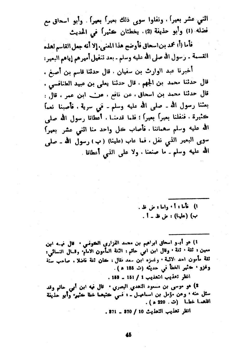 اثْنَيْ عَشَرَ بَعِيرًا وَنُفِلُوا سِوَى ذَلِكَ بَعِيرًا بَعِيرًا وَأَبُو إِسْحَاقَ مَعَ فَضْلِهِ وَأَبُو حُذَيْفَةَ يُخْطِئَانِ كَثِيرًا فِي الْحَدِيثِ فَأَمَّا مُحَمَّدُ بْنُ إِسْحَاقَ فَأَوْضَحَ هَذَا الْمَعْنَى إِلَّا أَنَّهُ جَعَلَ الْقَاسِمَ لِهَذِهِ الْقِسْمَةِ رَسُولِ اللَّهِ صَلَّى اللَّهُ عَلَيْهِ وَسَلَّمَ بَعْدَ تَنْفِيلِ أَمِيرِهِمْ إِيَّاهُمُ الْبَعِيرَ أَخْبَرَنَا عَبْدُ الْوَارِثِ بْنُ سُفْيَانَ قَالَ حَدَّثَنَا قَاسِمُ بْنُ أَصْبَغَ قَالَ حَدَّثَنَا مُحَمَّدُ بْنُ الْجَهْمِ قَالَ حَدَّثَنَا يَعْلَى بْنُ عُبَيْدٍ الطَّنَافِسِيُّ قَالَ حَدَّثَنَا مُحَمَّدُ بْنُ إِسْحَاقَ عَنْ نَافِعٍ عَنِ ابْنِ عُمَرَ قَالَ بَعَثَنَا رَسُولُ اللَّهِ صَلَّى اللَّهُ عَلَيْهِ وَسَلَّمَ فِي سَرِيَّةٍ فَأَصَبْنَا نِعَمًا كَثِيرَةً فَنُفِلْنَا بَعِيرًا بَعِيرًا فَلَمَّا قَدِمْنَا أَعْطَانَا رَسُولُ اللَّهِ صَلَّى اللَّهُ عَلَيْهِ وَسَلَّمَ سُهْمَانَنَا فَأَصَابَ كُلُّ وَاحِدٍ مِنَّا اثْنَيْ عَشَرَ بَعِيرًا سِوَى الْبَعِيرِ الَّذِي نُفِلَ فَمَا عَابَ (علينا) (ب) رسول الله صلى الله عليه وسلم ما صَنَعْنَا وَلَا عَلَى الَّذِي أَعْطَانَا