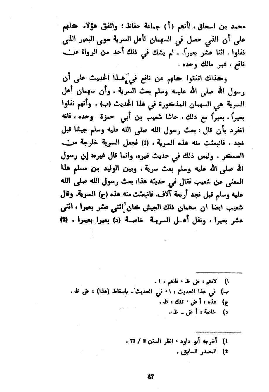 محمد بن إسحاق لأنهم جماعة حفاظ وتفق هَؤُلَاءِ كُلُّهُمْ عَلَى أَنَّ الَّذِي حَصَلَ فِي السُّهْمَانِ لِأَهْلِ السَّرِيَّةِ سِوَى الْبَعِيرِ الَّذِي نُفِلُوا اثْنَا عَشَرَ بَعِيرًا لَمْ يَشُكَّ فِي ذَلِكَ أَحَدٌ مِنَ الرُّوَاةِ عَنْ نَافِعٍ غَيْرَ مَالِكٍ وَحْدَهُ وَكَذَلِكَ اتَّفَقُوا كُلُّهُمْ عَنْ نَافِعٍ فِي هَذَا الْحَدِيثِ عَلَى أَنَّ رَسُولَ اللَّهِ صَلَّى اللَّهُ عَلَيْهِ وَسَلَّمَ بَعَثَ السَّرِيَّةَ وَأَنَّ سُهْمَانَ أَهْلِ السَّرِيَّةِ هِيَ السُّهْمَانُ الْمَذْكُورَةُ فِي هَذَا الْحَدِيثِ وَأَنَّهُمْ نُفِلُوا بَعِيرًا بَعِيرًا مَعَ ذَلِكَ حَاشَا شُعَيْبِ بْنِ أَبِي حَمْزَةَ وَحْدَهُ فَإِنَّهُ انْفَرَدَ بِأَنْ قَالَ بَعَثَ رَسُولُ اللَّهِ صَلَّى اللَّهُ عَلَيْهِ وَسَلَّمَ جَيْشًا قِبَلَ نَجْدٍ فَانْبَعَثَتْ مِنْهُ هَذِهِ السَّرِيَّةُ فَجَعَلَ السَّرِيَّةَ خَارِجَةً مِنَ الْعَسْكَرِ وَلَيْسَ ذَلِكَ فِي حَدِيثِ غَيْرِهِ وَإِنَّمَا قَالَ غَيْرُهُ إِنَّ رَسُولَ اللَّهِ صَلَّى اللَّهُ عَلَيْهِ وَسَلَّمَ بَعَثَ سَرِيَّةً وَبَيَّنَ الْوَلِيدُ بْنُ مُسْلِمٍ هَذَا الْمَعْنَى عَنْ شُعَيْبٍ فَقَالَ فِي حَدِيثِهِ هَذَا بَعَثَ رَسُولُ اللَّهِ صَلَّى اللَّهُ عَلَيْهِ وَسَلَّمَ قِبَلَ نَجْدٍ أَرْبَعَةَ آلَافٍ فَانْبَعَثَتْ مِنْهُ هَذِهِ السَّرِيَّةُ وَقَالَ شُعَيْبٌ أَيْضًا إِنَّ سُهْمَانَ ذَلِكَ الْجَيْشِ كَانَ اثْنَيْ عَشَرَ بَعِيرًا اثْنَيْ عَشَرَ بَعِيرًا وَنُفِلَ أَهْلُ السَّرِيَّةَ خَاصَّةً بعيرا بعيرا