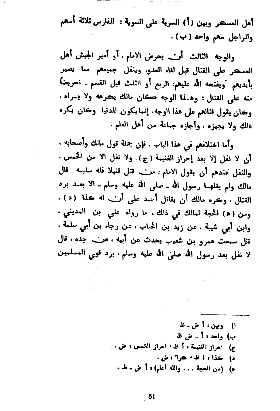 أَهْلِ الْعَسْكَرِ وَبَيْنَ السَّرِيَّةِ عَلَى السَّوِيَّةِ لِلْفَارِسِ ثَلَاثَةُ أَسْهُمٍ وَلِلرَّاجِلِ سَهْمٌ وَاحِدٌ وَالْوَجْهُ الثَّالِثُ أَنْ يُحَرِّضَ الْإِمَامُ أَوْ أَمِيرُ الْجَيْشِ أَهْلَ الْعَسْكَرِ عَلَى الْقِتَالِ قِبَلَ لِقَاءِ الْعَدُوِّ وَيَنْفُلَ جَمِيعَهُمْ مِمَّا يَصِيرُ بِأَيْدِيهِمْ وَيَفْتَحَهُ اللَّهُ عَلَيْهِمْ الرُّبُعَ أَوِ الثُّلُثَ قِبْلَ الْقَسْمِ تَحْرِيضًا مِنْهُ عَلَى الْقِتَالِ وَهَذَا الْوَجْهُ كَانَ مَالِكٌ يَكْرَهُهُ وَلَا يَرَاهُ وَكَانَ يَقُولُ قِتَالُهُمْ عَلَى هَذَا الْوَجْهِ إِنَّمَا يَكُونُ لِلدُّنْيَا وَكَانَ يَكْرَهُ ذَلِكَ وَلَا يُجِيزُهُ وَأَجَازَهُ جَمَاعَةٌ مِنْ أَهْلِ الْعِلْمِ وَأَمَّا اخْتِلَافُهُمْ فِي هَذَا الْبَابِ فَإِنَّ جُمْلَةَ قَوْلِ مَالِكٍ وَأَصْحَابِهِ أَنْ لَا نَفْلَ إِلَّا بَعْدَ إِحْرَازِ الْغَنِيمَةِ وَلَا نَفْلَ إِلَّا مِنَ الْخُمُسِ وَالنَّفْلُ عِنْدَهُمْ أَنْ يَقُولَ الْإِمَامُ مَنْ قَتَلَ قَتِيلًا فَلَهُ سَلْبُهُ قَالَ مَالِكٌ وَلَمْ يَقُلْهَا رَسُولُ اللَّهِ صَلَّى اللَّهُ عَلَيْهِ وَسَلَّمَ إِلَّا بَعْدَ بَرْدِ الْقِتَالِ وَكَرِهَ مَالِكٌ أَنْ يُقَاتِلَ أَحَدٌ عَلَى أَنَّ لَهُ كَذَا وَمِنَ (هـ) الحجة لمالك في ذلك ما رواه علي بن الْمَدِينِيِّ وَابْنُ أَبِي شَيْبَةَ عَنْ زَيْدِ بْنِ الْحُبَابِ عَنْ رَجَاءِ بْنِ أَبِي سَلَمَةَ قَالَ سَمِعْتُ عَمْرَو بْنَ شُعَيْبٍ يُحَدِّثُ عَنْ أَبِيهِ عَنْ جَدِّهِ قَالَ لَا نَفْلَ بَعْدَ رَسُولِ اللَّهِ صَلَّى اللَّهُ عَلَيْهِ وَسَلَّمَ يرد قوي المسلمين