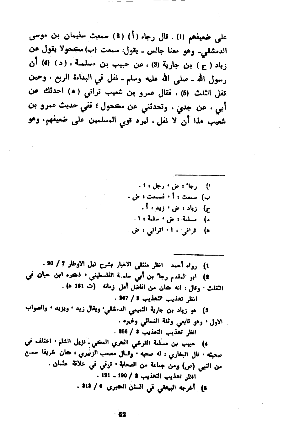 عَلَى ضَعِيفِهِمْ قَالَ رَجَاءٌ سَمِعْتُ سُلَيْمَانَ بْنَ مُوسَى الدِّمَشْقِيَّ وَهُوَ مَعَنَا جَالِسٌ يَقُولُ سَمِعْتُ مَكْحُولًا يَقُولُ عَنْ زِيَادِ بْنِ جَارِيَةَ عَنْ حَبِيبِ بْنِ مَسْلَمَةَ أَنَّ رَسُولَ اللَّهِ صَلَّى اللَّهُ عَلَيْهِ وَسَلَّمَ نَفَلَ فِي الْبَدَاءَةِ الرُّبُعَ وحين قفل الثلث فقال ععمرو بن شعيب تراني (هـ) أَحَدِّثُكَ عَنْ أَبِي عَنْ جِدِّي وَتُحَدِّثُنِي عَنْ مَكْحُولٍ فَفِي حَدِيثِ عَمْرِو بْنِ شُعَيْبٍ هَذَا أَنْ لَا نَفْلَ لِيَرُدَّ قَوِيُّ الْمُسْلِمِينَ عَلَى ضعيفهم وهو