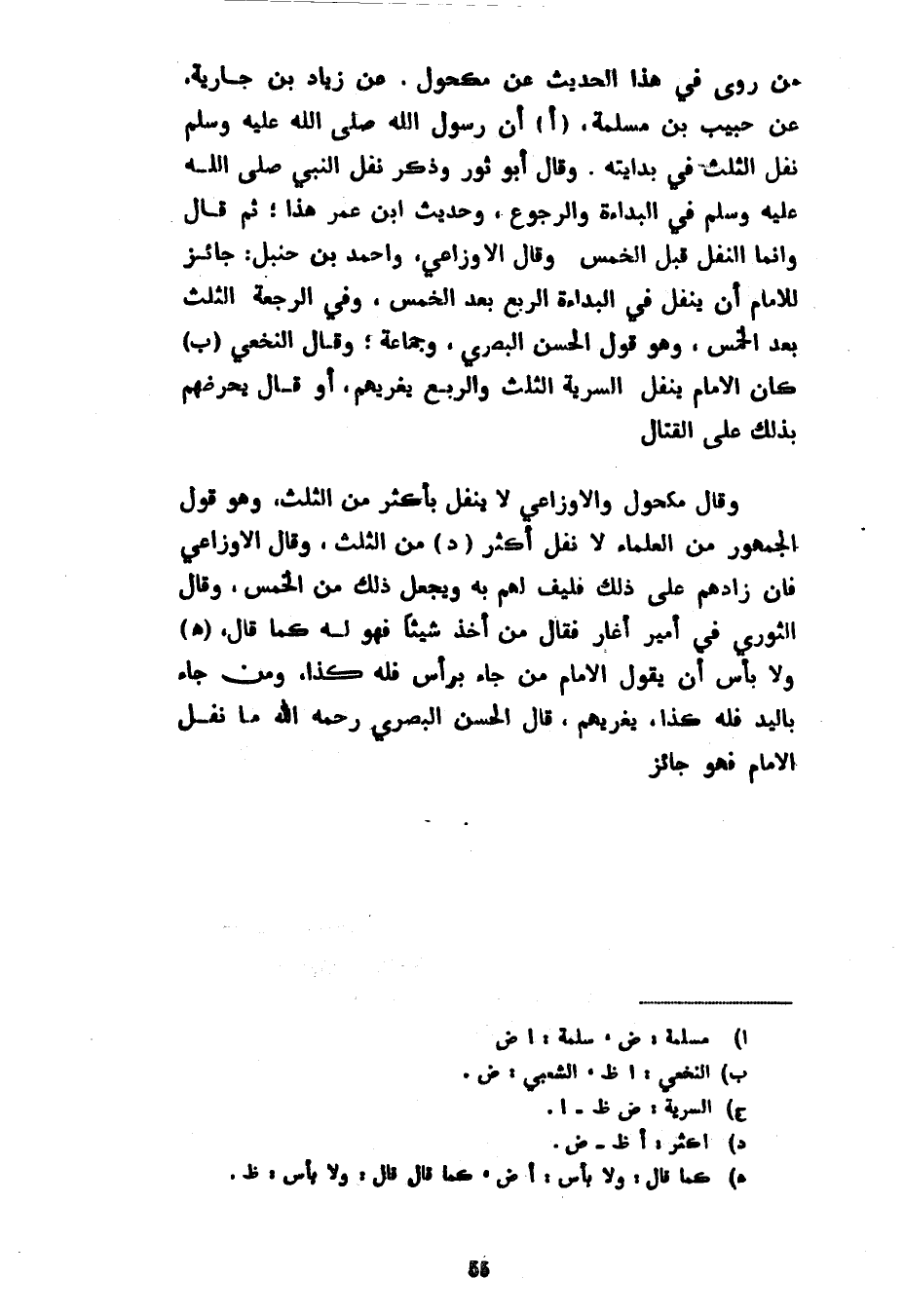 مَنْ رَوَى فِي هَذَا الْحَدِيثِ عَنْ مَكْحُولٍ عَنْ زِيَادِ بْنِ جَارِيَةَ عَنْ حَبِيبِ بْنِ مَسْلَمَةَ أَنَّ رَسُولَ اللَّهِ صَلَّى اللَّهُ عَلَيْهِ وَسَلَّمَ نَفَلَ الثُّلُثَ فِي بِدَايَتِهِ وَقَالَ أَبُو ثَوْرٍ وَذَكَرَ نَفْلَ النَّبِيِّ صَلَّى اللَّهُ عَلَيْهِ وَسَلَّمَ فِي الْبَدَاءَةِ وَالرُّجُوعِ وَحَدِيثُ ابْنِ عُمَرَ هَذَا ثُمَّ قَالَ وَإِنَّمَا النَّفْلُ قَبْلَ الْخُمُسِ وَقَالَ الْأَوْزَاعِيُّ وَأَحْمَدُ بْنُ حَنْبَلٍ جَائِزٌ لِلْإِمَامِ أَنْ يَنْفُلَ فِي الْبَدَاءَةِ الرُّبُعَ بَعْدَ الْخُمُسِ وَفِي الرَّجْعَةِ الثُّلُثَ بَعْدِ الْخُمُسِ وَهُوَ قَوْلُ الْحَسَنِ الْبَصْرِيِّ وَجَمَاعَةٍ وَقَالَ النُّخَعِيُّ كَانَ الْإِمَامُ يَنْفُلُ السَّرِيَّةَ الثُّلُثَ وَالرُّبُعَ يُغْرِيهِمْ أَوْ قَالَ يُحَرِّضُهُمْ بِذَلِكَ عَلَى الْقِتَالِ وَقَالَ مَكْحُولٌ وَالْأَوْزَاعِيُّ لَا يَنْفِلُ بِأَكْثَرَ مِنَ الثُّلْثِ وَهُوَ قَوْلُ الْجُمْهُورِ مِنَ الْعُلَمَاءِ لَا نَفْلَ أَكْثَرُ مِنَ الثُّلْثِ وَقَالَ الْأَوْزَاعِيُّ فَإِنْ زَادَهُمْ عَلَى ذَلِكَ فَلْيَفِ لَهُمْ بِهِ وَيَجْعَلْ ذَلِكَ مِنَ الْخُمُسِ وَقَالَ الثَّوْرِيُّ فِي أَمِيرٍ أَغَارَ فَقَالَ مَنْ أَخَذَ شَيْئًا فَهُوَ لَهُ كَمَا قَالَ وَلَا بَأْسَ أَنْ يَقُولَ الْإِمَامُ مَنْ جَاءَ بِرَأْسٍ فَلَهُ كَذَا وَمَنْ جَاءَ بِالْيَدِ فَلَهُ كَذَا يُغْرِيهِمْ قَالَ الْحَسَنُ الْبَصْرِيُّ رَحِمَهُ اللَّهُ مَا نَفْلَ الْإِمَامُ فَهُوَ جَائِزٌ