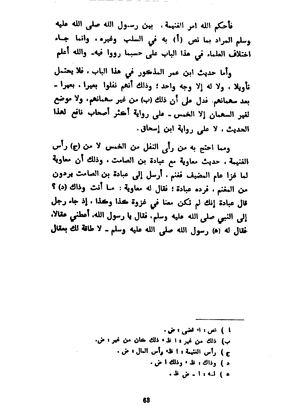 فأحكم الله أمر الغنيمة بَيَّنَ رَسُولُ اللَّهِ صَلَّى اللَّهُ عَلَيْهِ وَسَلَّمَ الْمُرَادَ بِمَا نَصَّ بِهِ فِي السَّلْبِ وَغَيْرِهِ وَإِنَّمَا جَاءَ اخْتِلَافُ الْعُلَمَاءِ فِي هَذَا الْبَابِ عَلَى حسبما رَوَوْا فِيهِ وَاللَّهُ أَعْلَمُ وَأَمَّا حَدِيثُ ابْنِ عمرالمذكور فِي هَذَا الْبَابِ فَلَا يَحْتَمِلُ تَأْوِيلًا وَلَا لَهُ إِلَّا وَجْهٌ وَاحِدٌ وَذَلِكَ أَنَّهُمْ نُفِّلُوا بَعِيرًا بَعِيرًا بَعْدَ سُهْمَانِهِمْ فَدَلَّ عَلَى أَنَّ ذلك من غير سُهْمَانُهُمْ وَلَا مَوْضِعَ لِغَيْرِ السُّهْمَانِ إِلَّا الْخُمُسَ عَلَى رِوَايَةِ أَكْثَرِ أَصْحَابِ نَافِعٍ لِهَذَا الْحَدِيثِ لَا عَلَى رِوَايَةِ ابْنِ إِسْحَاقَ وَمِمَّا احْتَجَّ بِهِ مَنْ رَأَى النَّفْلَ مِنَ الْخُمُسِ لَا مِنْ رَأْسِ الْغَنِيمَةِ حَدِيثُ مُعَاوِيَةَ مَعَ عُبَادَةَ بْنِ الصَّامِتِ وَذَلِكَ أَنَّ مُعَاوِيَةَ لَمَّا غَزَا عَامَ الْمُضِيفِ فَغَنِمَ أَرْسَلَ إِلَى عُبَادَةَ بْنِ الصَّامِتِ يَرُدُّونَ مِنَ الْمَغْنَمِ فَرَدَّهُ عُبَادَةُ فَقَالَ لَهُ مُعَاوِيَةُ مَا أَنْتَ وَذَاكَ قَالَ عُبَادَةُ إِنَّكَ لَمْ تَكُنْ مَعَنَا فِي غَزْوَةِ كَذَا وَكَذَا إِذْ جَاءَ رَجُلٌ إِلَى النَّبِيِّ صَلَّى اللَّهُ عَلَيْهِ وَسَلَّمَ فَقَالَ يَا رَسُولَ اللَّهِ أَعْطِنِي عِقَالًا فَقَالَ لَهُ رَسُولُ اللَّهِ صَلَّى اللَّهُ عَلَيْهِ وَسَلَّمَ لَا طَاقَةَ لَكَ بِعِقَالٍ