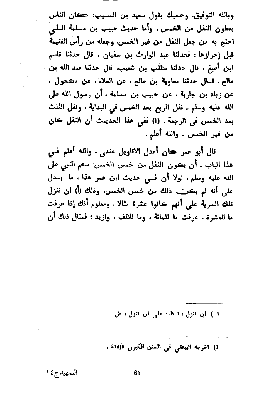 وَبِاللَّهِ التَّوْفِيقُ وَحَسْبُكَ بِقَوْلِ سَعِيدِ بْنِ الْمُسَيِّبِ كَانَ النَّاسُ يُعْطَوْنَ النَّفْلَ مِنَ الْخُمُسِ وَأَمَّا حَدِيثُ حَبِيبِ بْنِ مَسْلَمَةَ الَّذِي احْتَجَّ بِهِ مَنْ جَعَلَ النَّفْلَ مِنْ غَيْرِ الْخُمُسِ وَجَعَلَهُ مِنْ رَأْسِ الْغَنِيمَةِ قَبْلَ إِحْرَازِهَا فَحَدَّثَنَا عَبْدُ الْوَارِثِ بْنُ سُفْيَانَ قَالَ حَدَّثَنَا قَاسِمُ بْنُ أَصْبَغَ قَالَ حَدَّثَنَا مُطَّلِبُ بْنُ شُعَيْبٍ قَالَ حَدَّثَنَا عَبْدُ اللَّهِ بْنُ صَالِحٍ قَالَ حَدَّثَنَا مُعَاوِيَةُ بْنُ صَالِحٍ عَنِ الْعَلَاءِ عَنْ مَكْحُولٍ عَنْ زِيَادِ بْنِ جَارِيَةَ عَنْ حَبِيبِ بْنِ مَسْلَمَةَ أَنَّ رَسُولَ اللَّهِ صَلَّى اللَّهُ عَلَيْهِ وَسَلَّمَ نَفَلَ الرُّبُعَ بَعْدَ الْخُمُسِ فِي الْبِدَايَةِ وَنَفَلَ الثُّلُثَ بَعْدِ الْخُمُسِ فِي الرَّجْعَةِ فَفِي هَذَا الْحَدِيثِ أَنَّ النَّفْلَ كَانَ مِنْ غَيْرِ الْخُمُسِ وَاللَّهُ أَعْلَمُ قَالَ أَبُو عُمَرَ كَانَ أَعْدَلُ الْأَقَاوِيلِ عِنْدِي وَاللَّهُ أَعْلَمُ فِي هَذَا الْبَابِ أَنْ يَكُونَ النَّفْلُ مِنْ خُمُسِ الْخُمُسِ سَهْمُ النَّبِيِّ صَلَّى اللَّهُ عَلَيْهِ وَسَلَّمَ لَوْلَا أَنَّ فِي حَدِيثِ ابْنِ عُمَرَ هَذَا مَا يَدُلُّ عَلَى أَنَّهُ لَمْ يَكُنْ ذَلِكَ مِنْ خُمُسِ الْخُمُسِ وَذَلِكَ أَنْ تُنَزَّلَ تِلْكَ السَّرِيَّةُ عَلَى أَنَّهُمْ كَانُوا عَشَرَةً مِثَالًا وَمَعْلُومٌ أَنَّكَ إِذَا عَرَفْتَ مَا لِلْعَشَرَةِ عَرَفْتَ مَا لِلْمِائَةِ وَمَا لِلْأَلْفِ وَأَزْيَدَ فَمِثَالُ ذَلِكَ أَنْ