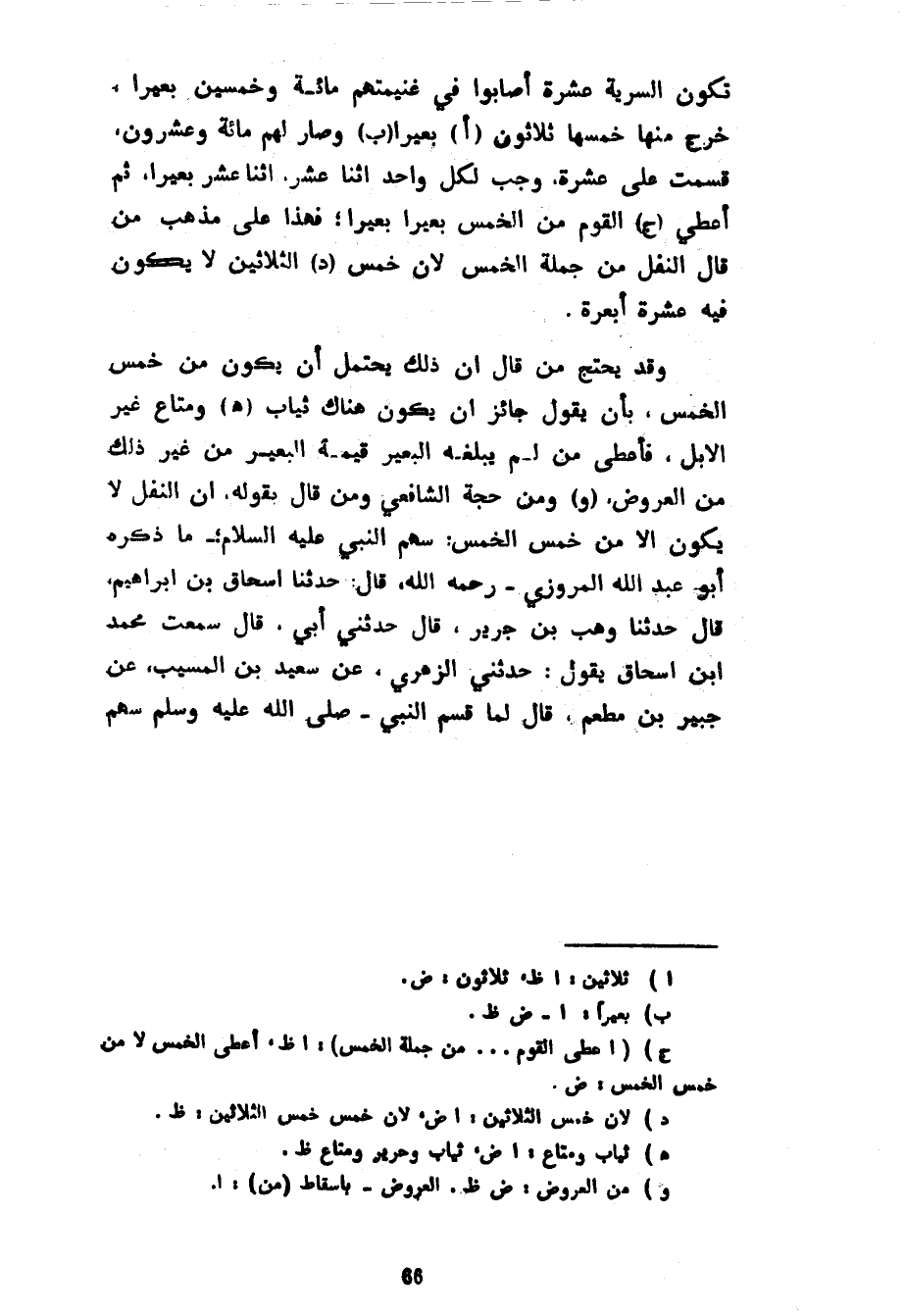 تَكُونُ السَّرِيَّةُ عَشَرَةً أَصَابُوا فِي غَنِيمَتِهِمْ مِائَةً وَخَمْسِينَ بَعِيرًا خَرَجَ مِنْهَا خُمُسُهَا ثَلَاثُونَ بَعِيرًا وَصَارَ لَهُمْ مِائَةٌ وَعِشْرُونَ قُسِّمَتْ عَلَى عَشَرَةٍ وَجَبَ لِكُلِّ وَاحِدٍ اثْنَا عَشَرَ اثْنَا عَشَرَ بَعِيرًا ثُمَّ أُعْطِي الْقَوْمُ مِنَ الْخُمُسِ بَعِيرًا بَعِيرًا فَهَذَا عَلَى مَذْهَبِ مَنْ قَالَ النَّفْلُ مِنْ جُمْلَةِ الْخُمُسِ لِأَنَّ خُمُسَ الثَّلَاثِينِ لَا يَكُونُ فِيهِ عَشَرَةُ أَبْعِرَةٍ وَقَدْ يَحْتَجُّ مَنْ قَالَ أَنَّ ذَلِكَ يُحْتَمَلُ أَنْ يَكُونَ مِنْ خُمُسِ الْخُمُسِ بِأَنْ يَقُولَ جَائِزٌ أَنْ يَكُونَ هُنَاكَ ثِيَابٌ وَمَتَاعٌ غَيْرَ الْإِبِلِ فَأَعْطَى مَنْ لم يبلغه البعير قيمة البعير من غير ذلك من العروض ومن حجةالشافعي وَمَنْ قَالَ بِقَوْلِهِ أَنَّ النَّفْلَ لَا يَكُونُ إِلَّا مِنْ خُمُسِ الْخُمُسِ سَهْمُ النَّبِيِّ عَلَيْهِ السَّلَامُ مَا ذَكَرَهُ أَبُو عَبْدِ اللَّهِ الْمَرْوَزِيُّ رَحِمَهُ اللَّهُ قَالَ حَدَّثَنَا إِسْحَاقُ بْنُ إِبْرَاهِيمَ قَالَ حَدَّثَنَا وَهْبُ بْنُ جَرِيرٍ قَالَ حَدَّثَنِي أَبِي قَالَ سَمِعْتُ مُحَمَّدَ بْنَ إِسْحَاقَ يَقُولُ حَدَّثَنِي الزُّهْرِيُّ عَنْ سَعِيدِ بْنِ الْمُسَيَّبِ عَنْ جُبَيْرِ بْنِ مُطْعِمٍ قَالَ لَمَّا قَسَّمَ النَّبِيُّ صَلَّى اللَّهُ عَلَيْهِ وَسَلَّمَ سَهْمَ