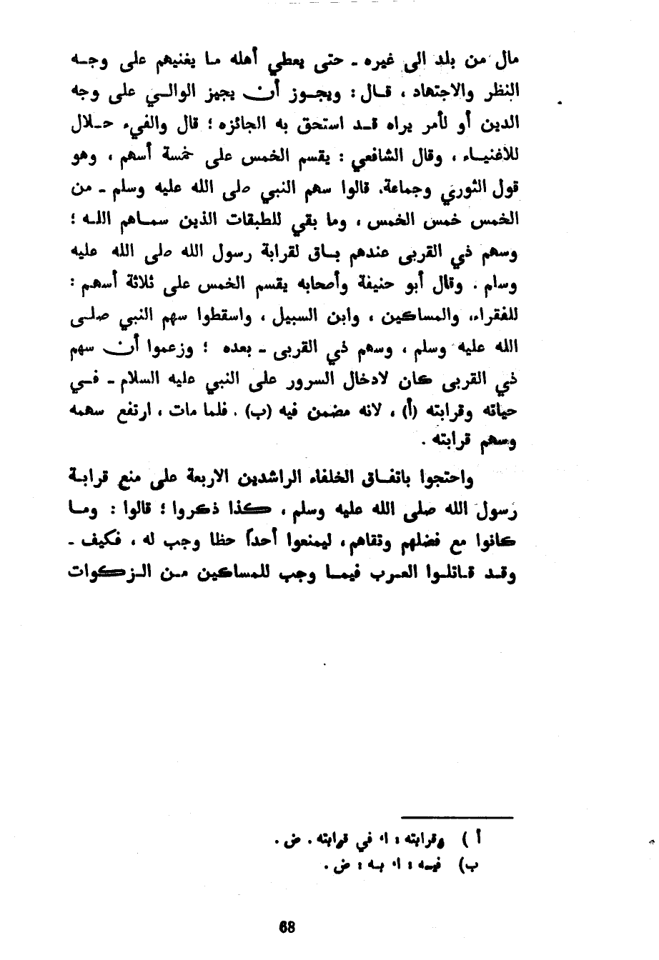 مَالٌ مِنْ بَلَدٍ إِلَى غَيْرِهِ حَتَّى يُعْطَى أَهْلُهُ مَا يُغْنِيهِمْ عَلَى وَجْهِ النَّظَرِ وَالِاجْتِهَادِ قَالَ وَيَجُوزُ أَنْ يُجِيزَ الْوَالِي عَلَى وَجْهِ الدَّيْنِ أَوْ لِأَمْرٍ قَدِ اسْتَحَقَّ بِهِ الْجَائِزَةَ قَالَ وَالْفَيْءُ حَلَّالٌ لِلْأَغْنِيَاءِ وَقَالَ الشَّافِعِيُّ يُقَسَّمُ الْخُمُسُ عَلَى خَمْسَةِ أَسْهُمٍ وَهُوَ قَوْلُ الثَّوْرِيِّ وَجَمَاعَةٍ قَالُوا سَهْمُ النَّبِيِّ صَلَّى اللَّهُ عَلَيْهِ وَسَلَّمَ مِنَ الْخُمُسِ خُمُسُ الْخُمُسِ وَمَا بَقِيَ لِلطَّبَقَاتِ الَّذِينَ سَمَّاهُمُ اللَّهُ وَسَهْمُ ذِي الْقُرْبَى عِنْدَهُمْ بَاقٍ لِقَرَابَةِ رَسُولُ اللَّهِ صَلَّى اللَّهُ عَلَيْهِ وَسَلَّمَ وَقَالَ أَبُو حَنِيفَةَ وَأَصْحَابُهُ يُقَسَّمُ الْخُمُسُ عَلَى ثَلَاثَةِ أَسْهُمٍ لِلْفُقَرَاءِ وَالْمَسَاكِينِ وَابْنِ السَّبِيلِ وَأَسْقَطُوا سَهْمَ النَّبِيِّ صَلَّى اللَّهُ عَلَيْهِ وَسَلَّمَ وَسَهْمَ ذِي الْقُرْبَى بَعْدَهُ وَزَعَمُوا أَنَّ سَهْمَ ذِي الْقُرْبَى كَانَ لِإِدْخَالِ السُّرُورِ عَلَى النَّبِيِّ عَلَيْهِ السَّلَامُ فِي حَيَاتِهِ وَقَرَابَتِهِ لِأَنَّهُ مُضَمَّنٌ فِيهِ فَلَمَّا مَاتَ ارْتَفَعَ سَهْمُهُ وَسَهْمُ قَرَابَتِهِ وَاحْتَجُّوا بِاتِّفَاقِ الْخُلَفَاءِ الرَّاشِدِينَ الْأَرْبَعَةِ عَلَى مَنْعِ قَرَابَةِ رَسُولِ اللَّهِ صَلَّى اللَّهُ عَلَيْهِ وَسَلَّمَ كَذَا ذَكَرُوا قَالُوا وَمَا كَانُوا مَعَ فَضْلِهِمْ وَتُقَاهُمْ لِيَمْنَعُوا أَحَدًا حَظًّا وَجَبَ لَهُ فَكَيْفَ وَقَدْ قَاتَلُوا الْعَرَبَ فِيمَا وَجَبَ لِلْمَسَاكِينِ من الزكوات