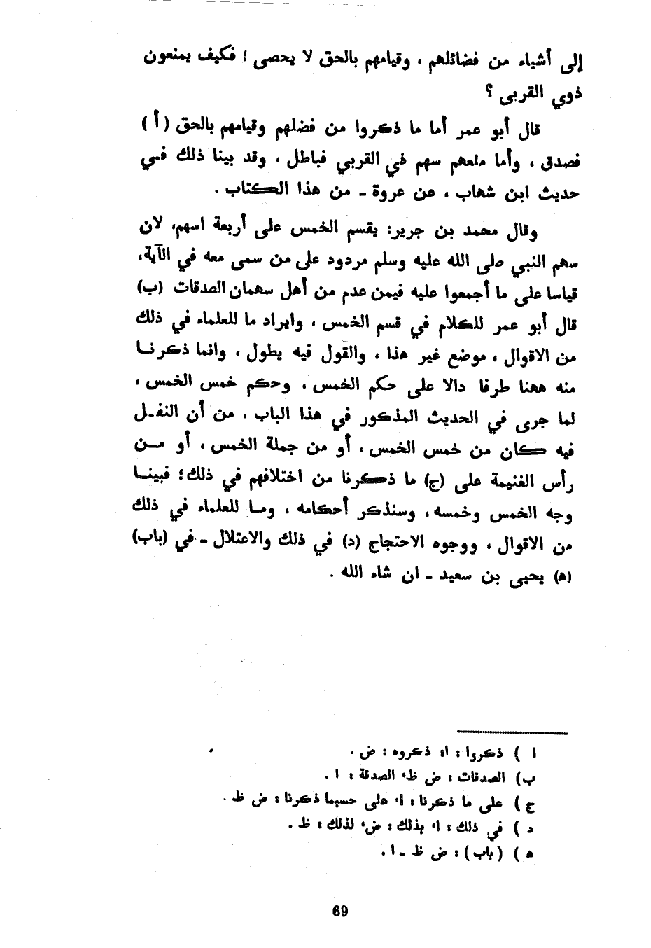 إِلَى أَشْيَاءَ مِنْ فَضَائِلِهِمْ وَقِيَامِهِمْ بِالْحَقِّ لَا يُحْصَى فَكَيْفَ يَمْنَعُونَ ذَوِي الْقُرْبَى قَالَ أَبُو عُمَرَ أَمَّا مَا ذَكَرُوا مِنْ فَضْلِهِمْ وَقِيَامِهِمْ بِالْحَقِّ فَصِدْقٌ وَأَمَّا مَنْعُهُمْ سَهْمَ ذِي الْقُرْبَى فَبَاطِلٌ وَقَدْ بَيَّنَّا ذَلِكَ فِي حَدِيثِ ابْنِ شِهَابٍ عَنْ عُرْوَةَ مِنْ هَذَا الْكِتَابِ وَقَالَ مُحَمَّدُ بْنُ جَرِيرٍ يُقَسَّمُ الْخُمُسُ عَلَى أَرْبَعَةِ أَسْهُمٍ لِأَنَّ سَهْمَ النَّبِيِّ صَلَّى اللَّهُ عَلَيْهِ وَسَلَّمَ مَرْدُودٌ عَلَى مَنْ سَمَّى مَعَهُ فِي الْآيَةِ قِيَاسًا عَلَى مَا أَجْمَعُوا عَلَيْهِ فِيمَنْ عَدِمَ مَنْ أَهْلِ سُهْمَانِ الصَّدَقَاتِ قَالَ أَبُو عُمَرَ لِلْكَلَامِ فِي قَسْمِ الْخُمُسِ وَإِيرَادِ مَا لِلْعُلَمَاءِ فِي ذَلِكَ مِنَ الْأَقْوَالِ مَوْضِعٌ غَيْرُ هَذَا وَالْقَوْلُ فِيهِ يَطُولُ وَإِنَّمَا ذَكَرْنَا مِنْهُ ههنا طَرَفًا دَالًّا عَلَى حُكْمِ الْخُمُسِ وَحُكْمِ خُمُسِ الْخُمُسِ لِمَا جَرَى فِي الْحَدِيثِ الْمَذْكُورِ فِي هَذَا الْبَابِ مِنْ أَنَّ النَّفْلَ فِيهِ كَانَ مِنْ خُمُسِ الْخُمُسِ أَوْ مِنْ جُمْلَةِ الْخُمُسِ أَوْ مِنْ رَأْسِ الْغَنِيمَةِ عَلَى مَا ذَكَرْنَا مِنِ اخْتِلَافِهِمْ فِي ذَلِكَ فَبَيَّنَّا وَجْهَ الْخُمُسِ وَخُمُسَهُ وَسَنَذْكُرُ أَحْكَامَهُ وَمَا لِلْعُلَمَاءِ فِي ذَلِكَ مِنَ الْأَقْوَالِ وَوُجُوهَ الِاحْتِجَاجِ فِي ذَلِكَ وَالِاعْتِلَالِ في (باب) (هـ) يَحْيَى بْنِ سَعِيدٍ إِنْ شَاءَ اللَّهُ