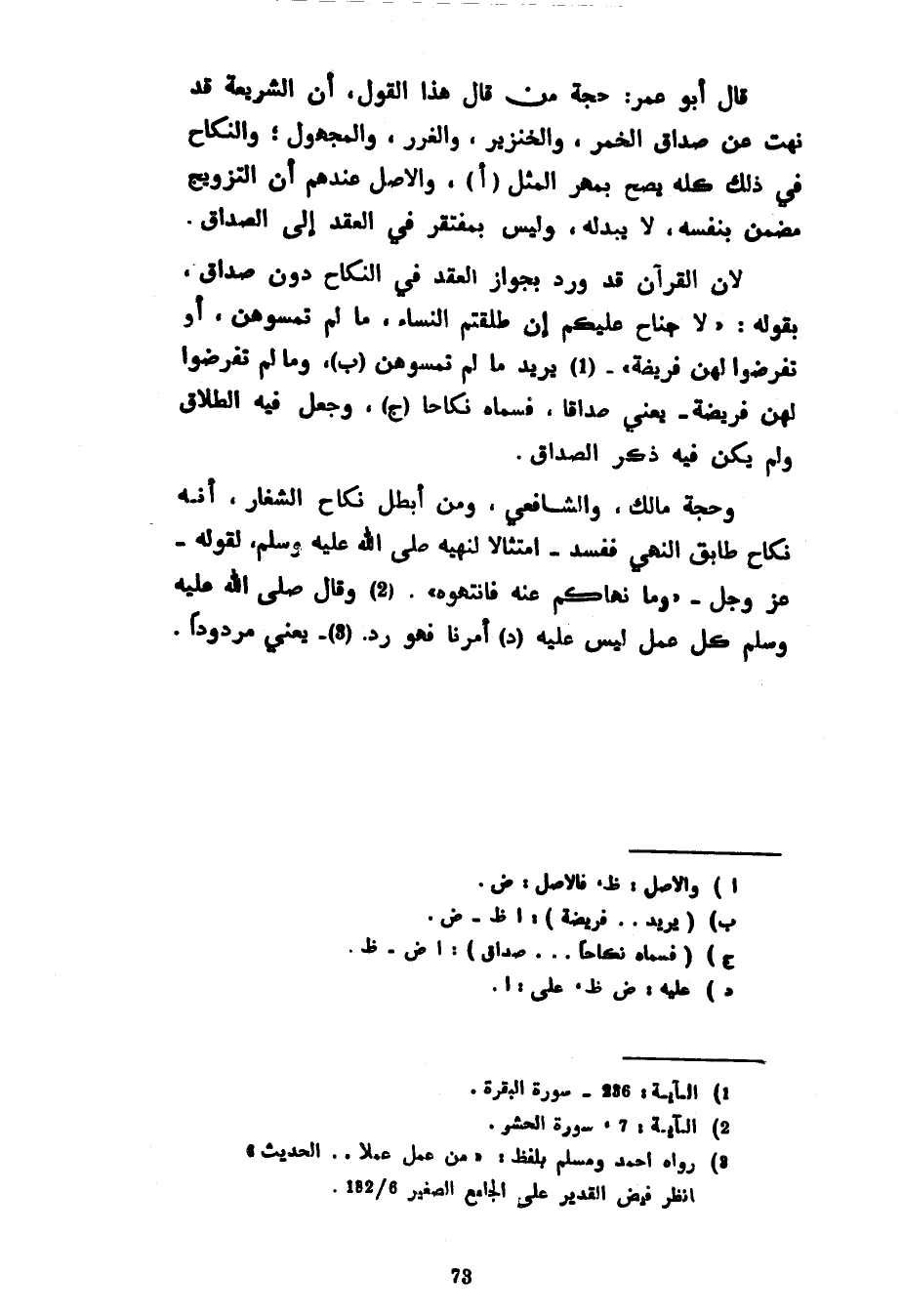 قَالَ أَبُو عُمَرَ حُجَّةُ مَنْ قَالَ هَذَا الْقَوْلَ أَنَّ الشَّرِيعَةَ قَدْ نَهَتْ عَنْ صَدَاقِ الْخَمْرِ وَالْخِنْزِيرِ وَالْغَرَرِ وَالْمَجْهُولِ وَالنِّكَاحُ فِي ذَلِكَ كُلِّهِ يَصِحُّ بِمَهْرِ الْمِثْلِ وَالْأَصْلُ عِنْدَهُمْ أَنَّ التَّزْوِيجَ مُضَمَّنٌ بِنَفْسِهِ لَا يُبَدِّلُهُ وَلَيْسَ بِمُفْتَقِرٍ فِي الْعَقْدِ إِلَى الصَّدَاقِ لِأَنَّ الْقُرْآنَ قَدْ وَرَدَ بِجَوَازِ الْعَقْدِ فِي النِّكَاحِ دُونَ صَدَاقٍ بِقَوْلِهِ لَا جُنَاحَ عَلَيْكُمْ إِنْ طَلَّقْتُمُ النِّسَاءَ مَا لَمْ تَمَسُّوهُنَّ أَوْ تَفْرِضُوا لَهُنَّ فَرِيضَةً يُرِيدُ مَا لَمْ تَمَسُّوهُنَّ وَمَا لَمْ تَفْرِضُوا لَهُنَّ فَرِيضَةً يَعْنِي صَدَاقًا فَسَمَّاهُ نِكَاحًا وَجَعْلَ فِيهِ الطَّلَاقَ وَلَمْ يَكُنْ فِيهِ ذِكْرُ الصَّدَاقِ وَحُجَّةُ مَالِكٍ وَالشَّافِعِيِّ وَمَنْ أَبْطَلَ نِكَاحَ الشِّغَارِ أَنَّهُ نِكَاحٌ طَابَقَ النَّهْيَ فَفَسَدَ امْتِثَالًا لِنَهْيِهِ صَلَّى اللَّهُ عَلَيْهِ وَسَلَّمَ لِقَوْلِهِ عَزَّ وَجَلَّ وَمَا نَهَاكُمْ عَنْهُ فَانْتَهُوا وَقَالَ صَلَّى اللَّهُ عَلَيْهِ وَسَلَّمَ كُلُّ عَمَلٍ لَيْسَ عَلَيْهِ أَمْرُنَا فَهُوَ رَدٌّ يَعْنِي مَرْدُودًا