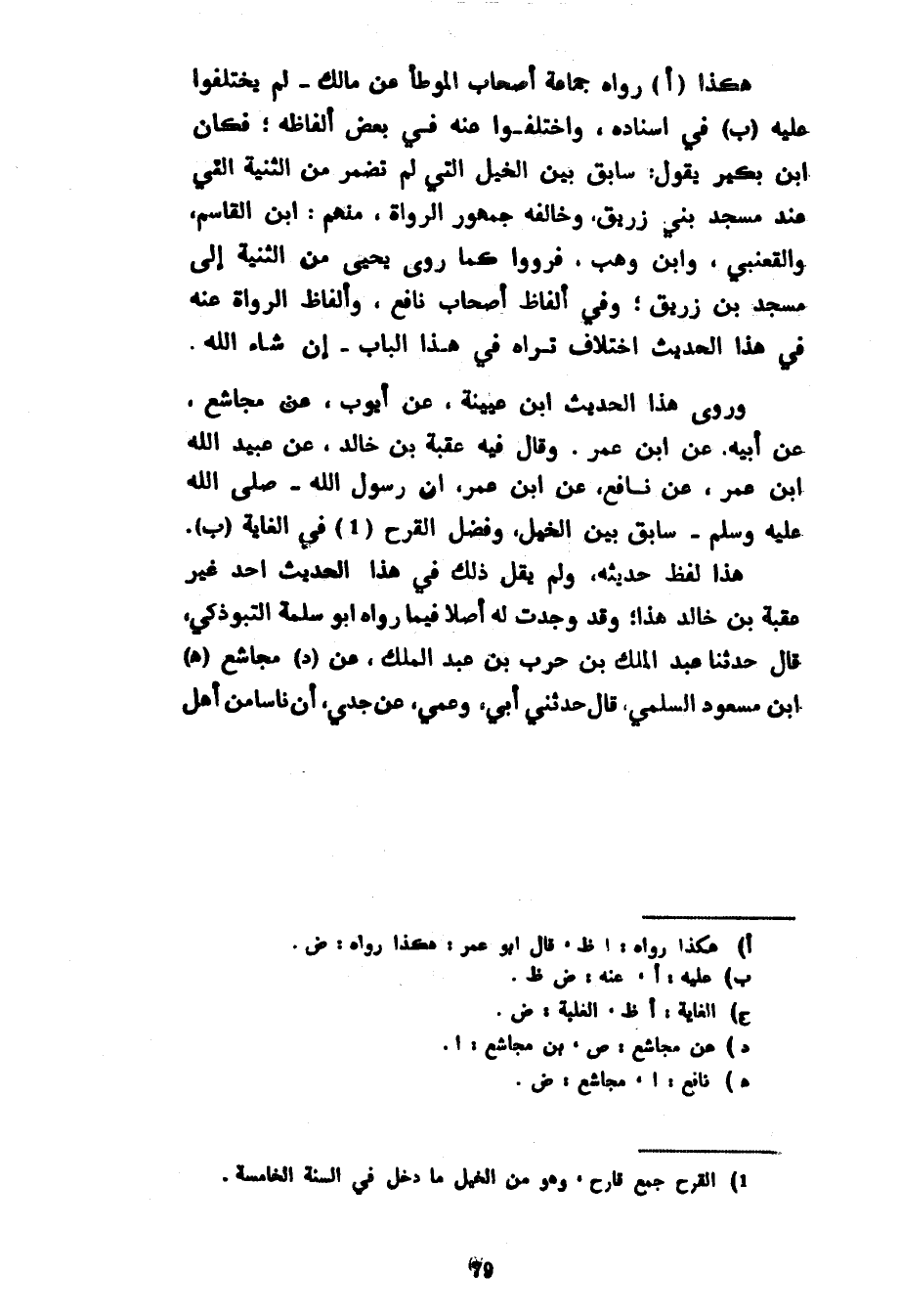 هَكَذَا رَوَاهُ جَمَاعَةُ أَصْحَابِ الْمُوَطَّأِ عَنْ مَالِكٍ لَمْ يَخْتَلِفُوا عَلَيْهِ فِي إِسْنَادِهِ وَاخْتَلَفُوا عَنْهُ فِي بَعْضِ أَلْفَاظِهِ فَكَانَ ابْنُ بُكَيْرٍ يَقُولُ سَابَقَ بَيْنَ الْخَيْلِ الَّتِي لَمْ تُضْمَرْ مِنَ الثَّنِيَّةِ الَّتِي عِنْدَ مَسْجِدِ بَنِي زُرَيْقٍ وَخَالَفَهُ جُمْهُورُ الرُّوَاةِ مِنْهُمْ ابْنُ الْقَاسِمِ وَالْقَعْنَبِيُّ وَابْنُ وَهْبٍ فَرَوَوْا كَمَا رَوَى يَحْيَى مَنِ الثَّنِيَّةِ إِلَى مَسْجِدِ بَنِي زُرَيْقٍ وَفِي أَلْفَاظِ أَصْحَابِ نَافِعٍ وَأَلْفَاظِ الرُّوَاةِ عَنْهُ فِي هَذَا الْحَدِيثِ اخْتِلَافٌ تَرَاهُ فِي هَذَا الْبَابِ إِنْ شَاءَ اللَّهُ وَرَوَى هَذَا الْحَدِيثَ ابْنُ عُيَيْنَةَ عَنْ أَيُّوبَ عَنْ مُجَاشِعٍ عَنْ أَبِيهِ عَنِ ابْنِ عُمَرَ وَقَالَ فِيهِ عُقْبَةُ بْنُ خَالِدٍ عَنْ عُبَيْدِ اللَّهِ بْنِ عُمَرَ عَنْ نَافِعٍ عَنِ ابْنِ عُمَرَ أَنَّ رَسُولَ اللَّهِ صَلَّى اللَّهُ عَلَيْهِ وَسَلَّمَ سَابَقَ بَيْنَ الْخَيْلِ وَفَضَّلَ الْقُرَّحَ فِي الْغَايَةِ هَذَا لَفْظُ حَدِيثِهِ وَلَمْ يَقُلْ ذلك في هذا الحديث أحد غير عُقْبَةُ بْنُ خَالِدٍ هَذَا وَقَدْ وَجَدْتُ لَهُ أَصْلًا فِيمَا رَوَاهُ أَبُو سَلَمَةَ التَّبُوذَكِيُّ قَالَ حَدَّثَنَا عَبْدُ الْمَلِكِ بْنُ حَرْبِ بْنِ عَبْدِ الملك عن مجاشع (هـ) بْنِ مَسْعُودٍ السُّلَمِيِّ قَالَ حَدَّثَنِي أَبِي وَعَمِّي عَنْ جَدِّي أَنَّ نَاسًا مِنْ أَهْلِ