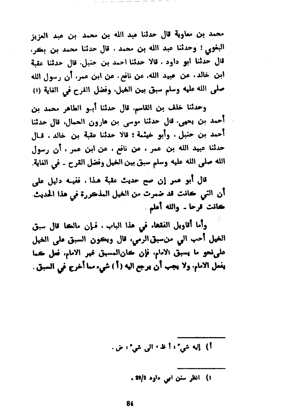 مُحَمَّدُ بْنُ مُعَاوِيَةَ قَالَ حَدَّثَنَا عَبْدُ اللَّهِ بْنُ مُحَمَّدِ بْنِ عبد العزيز البغوي وَحَدَّثَنَا عَبْدُ اللَّهِ بْنُ مُحَمَّدٍ قَالَ حَدَّثَنَا مُحَمَّدُ بْنُ بَكْرٍ قَالَ حَدَّثَنَا أَبُو دَاوُدَ قَالَا حَدَّثَنَا أَحْمَدُ بْنُ حَنْبَلٍ قَالَ حَدَّثَنَا عُقْبَةُ بْنُ خَالِدٍ عَنْ عُبَيْدُ اللَّهِ عَنْ نَافِعٍ عَنِ ابْنِ عُمَرَ أَنَّ رَسُولَ اللَّهِ صَلَّى اللَّهُ عَلَيْهِ وسلم سبق بَيْنَ الْخَيْلِ وَفَضَّلَ الْقُرَّحَ فِي الْغَايَةِ وَحَدَّثَنَا خَلَفُ بْنُ الْقَاسِمِ قَالَ حَدَّثَنَا أَبُو الطاهر مُحَمَّدُ بْنُ أَحْمَدَ بْنِ يَحْيَى قَالَ حَدَّثَنَا مُوسَى بْنُ هَارُونَ الْحَمَّالُ قَالَ حَدَّثَنَا أَحْمَدُ بْنُ حَنْبَلٍ وَأَبُو خَيْثَمَةَ قَالَا حَدَّثَنَا عُقْبَةُ بْنُ خَالِدٍ قَالَ حَدَّثَنَا عُبَيْدُ اللَّهِ بْنُ عُمَرَ عَنْ نَافِعٍ عَنِ ابْنِ عُمَرَ أَنَّ رَسُولَ اللَّهِ صلى الله عليه وسلم سبق بَيْنَ الْخَيْلِ وَفَضَّلَ الْقُرَّحَ فِي الْغَايَةِ قَالَ أَبُو عُمَرَ إِنْ صَحَّ حَدِيثُ عُقْبَةَ هَذَا فَفِيهِ دَلِيلٌ عَلَى أَنَّ الَّتِي كَانَتْ قَدْ ضَمُرَتْ مِنَ الْخَيْلِ الْمَذْكُورَةِ فِي هَذَا الْحَدِيثِ كَانَتْ قُرَّحًا وَاللَّهُ أَعْلَمُ وَأَمَّا أَقَاوِيلُ الْفُقَهَاءِ فِي هَذَا الْبَابِ فَإِنَّ مَالِكًا قَالَ سَبَقُ الْخَيْلِ أَحَبُّ إِلَيَّ مَنْ سَبَقِ الرَّمْيِ قَالَ وَيَكُونُ السَّبَقُ عَلَى الْخَيْلِ عَلَى نَحْوِ مَا يَسْبِقُ الْإِمَامُ فَإِنْ كَانَ الْمُسْبَقُ غَيْرَ الْإِمَامِ فَعَلَ كَمَا يَفْعَلُ الْإِمَامُ وَلَا يَجِبُ أَنْ يُرْجَعَ إِلَيْهِ شَيْءٌ مِمَّا أَخْرَجَ فِي السَّبَقِ