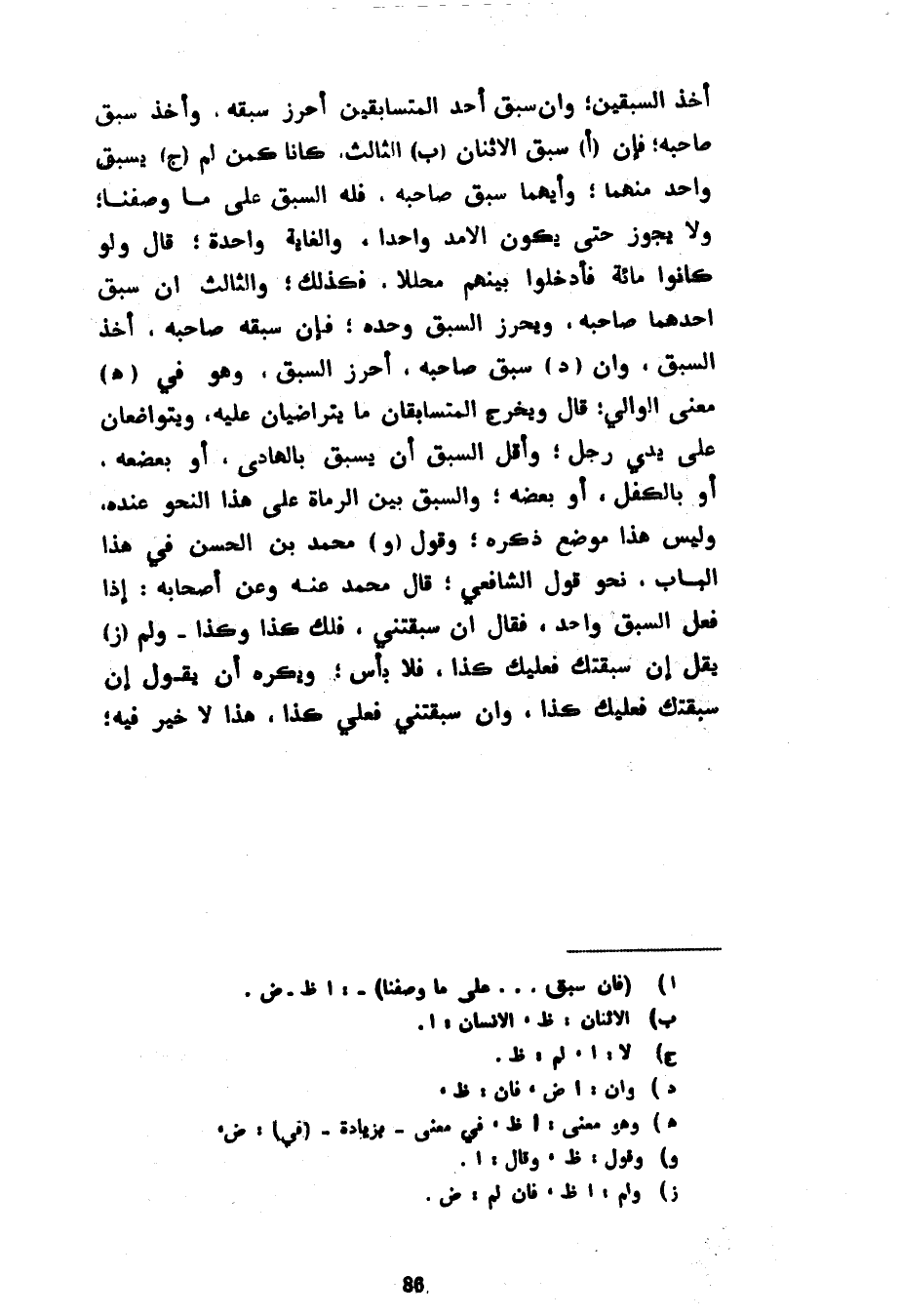 أَخَذَ السَّبَقَيْنِ وَإِنْ سَبَقَ أَحَدُ الْمُتَسَابِقِينَ أَحْرَزَ سَبْقَهُ وَأَخَذَ سَبْقَ صَاحِبِهِ فَإِنْ سَبَقَ الِاثْنَانِ الثَّالِثَ كَانَا كَمَنْ لَمْ يَسْبِقْ وَاحِدٌ مِنْهُمَا وأيهما سبقا صَاحِبَهُ فَلَهُ السَّبْقُ عَلَى مَا وَصَفْنَا وَلَا يَجُوزُ حَتَّى يَكُونَ الْأَمَدُ وَاحِدًا وَالْغَايَةُ وَاحِدَةً قَالَ وَلَوْ كَانُوا مِائَةً فَأَدْخَلُوا بَيْنَهُمْ مُحَلِّلًا فَكَذَلِكَ وَالثَّالِثُ إِنْ سَبَقَ أَحَدُهُمَا صَاحِبَهُ وَيُحْرِزُ السَّبْقَ وَحْدَهُ فَإِنْ سَبَقَهُ صَاحِبُهُ أَخَذَ السَّبْقَ وَإِنْ سَبَقَ صَاحِبَهُ أَحْرزَ السَّبْقَ وَهُوَ فِي (هـ) مَعْنَى الْوَالِي قَالَ وَيُخْرِجُ الْمُتَسَابِقَانِ مَا يَتَرَاضَيَانِ عَلَيْهِ وَيَتَوَاضَعَانِ عَلَى يَدَيْ رَجُلٍ وَأَقَلُّ السَّبْقِ أَنْ يَسْبِقَ بِالْهَادِي أَوْ بَعْضِهِ أَوْ بِالْكِفْلِ أَوْ بَعْضِهِ وَالسَّبَقُ بَيْنَ الرُّمَاةِ عَلَى هَذَا النَّحْوِ عِنْدَهُ وَلَيْسَ هَذَا مَوْضِعُ ذِكْرِهِ وَقَوْلُ مُحَمَّدِ بْنِ الْحَسَنِ فِي هَذَا الْبَابِ نَحْوَ قَوْلِ الشَّافِعِيِّ قَالَ مُحَمَّدٌ عَنْهُ وَعَنْ أَصْحَابِهِ إِذَا فَعَلَ السَّبَقَ وَاحِدٌ فَقَالَ إِنْ سَبَقْتَنِي فَلَكَ كَذَا وَكَذَا وَلَمْ يَقُلْ إِنْ سَبَقْتُكَ فَعَلَيْكَ كَذَا فَلَا بَأْسَ وَيُكْرَهُ أَنْ يَقُولَ إِنْ سَبَقْتُكَ فَعَلَيْكَ كَذَا وَإِنْ سَبَقْتَنِي فَعَلَيَّ كَذَا هَذَا لَا خَيْرَ فِيهِ
