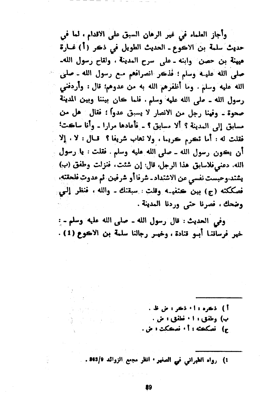 وَأَجَازَ الْعُلَمَاءُ فِي غَيْرِ الرِّهَانِ السَّبَقَ عَلَى الْأَقْدَامِ لِمَا فِي حَدِيثِ سَلَمَةَ بْنِ الْأَكْوَعِ الْحَدِيثَ الطَّوِيلَ فِي ذِكْرِ غَارَةِ عُيَيْنَةَ بْنِ حُصَيْنٍ وَابْنِهِ عَلَى سَرْحِ الْمَدِينَةِ وَلَقَاحِ رَسُولِ اللَّهِ صَلَّى اللَّهُ عَلَيْهِ وَسَلَّمَ فَذَكَرَ انْصِرَافَهُمْ مَعَ رَسُولِ اللَّهِ صَلَّى اللَّهُ عَلَيْهِ وَسَلَّمَ وَمَا أَظْفَرَهُمُ اللَّهُ بِهِ مِنْ عَدُوِّهِمْ قَالَ وَأَرْدَفَنِي رَسُولُ اللَّهِ صَلَّى اللَّهُ عَلَيْهِ وَسَلَّمَ فَلَمَّا كَانَ بَيْنَنَا وَبَيْنَ الْمَدِينَةِ صَحْوَةٌ وَفِينَا رَجُلٌ مِنَ الْأَنْصَارِ لَا يَسْبِقُ عَدُوًّا فَقَالَ هَلْ مِنْ مُسَابِقٍ إِلَى الْمَدِينَةِ ألَا مُسَابِقٌ فَأَعَادَهَا مِرَارًا وَأَنَا سَاكِتٌ فَقُلْتُ لَهُ أَمَا تُكْرِمُ كَرِيمًا وَلَا تَهَابُ شَرِيفًا قَالَ لَا إِلَّا أَنْ يَكُونَ رَسُولُ اللَّهِ صَلَّى اللَّهُ عَلَيْهِ وَسَلَّمَ فَقُلْتُ يَا رَسُولَ اللَّهِ دَعْنِي فَلْأُسَابِقْ هَذَا الرَّجُلَ قَالَ إِنْ شِئْتَ فَنَزَلْتُ وَطَفِقَ يَشْتَدُّ وَحَبَسْتُ نَفْسِي عَنِ الِاشْتِدَادِ شَرَفًا أَوْ شَرَفَيْنِ ثُمَّ عَدَوْتُ فَلَحِقْتُهُ فَصَكَكَتُهُ بَيْنَ كَتِفَيْهِ وَقُلْتُ سَبَقْتُكَ وَاللَّهِ فَنَظَرَ إِلَيَّ وَضَحِكَ فَصِرْنَا حَتَّى وَرَدْنَا الْمَدِينَةَ وَفِي الْحَدِيثِ قَالَ رَسُولُ اللَّهِ صَلَّى اللَّهُ عَلَيْهِ وَسَلَّمَ خَيْرُ فُرْسَانِنَا أَبُو قَتَادَةَ وَخَيْرُ رِجَالِنَا سَلَمَةُ بْنُ الأكوع