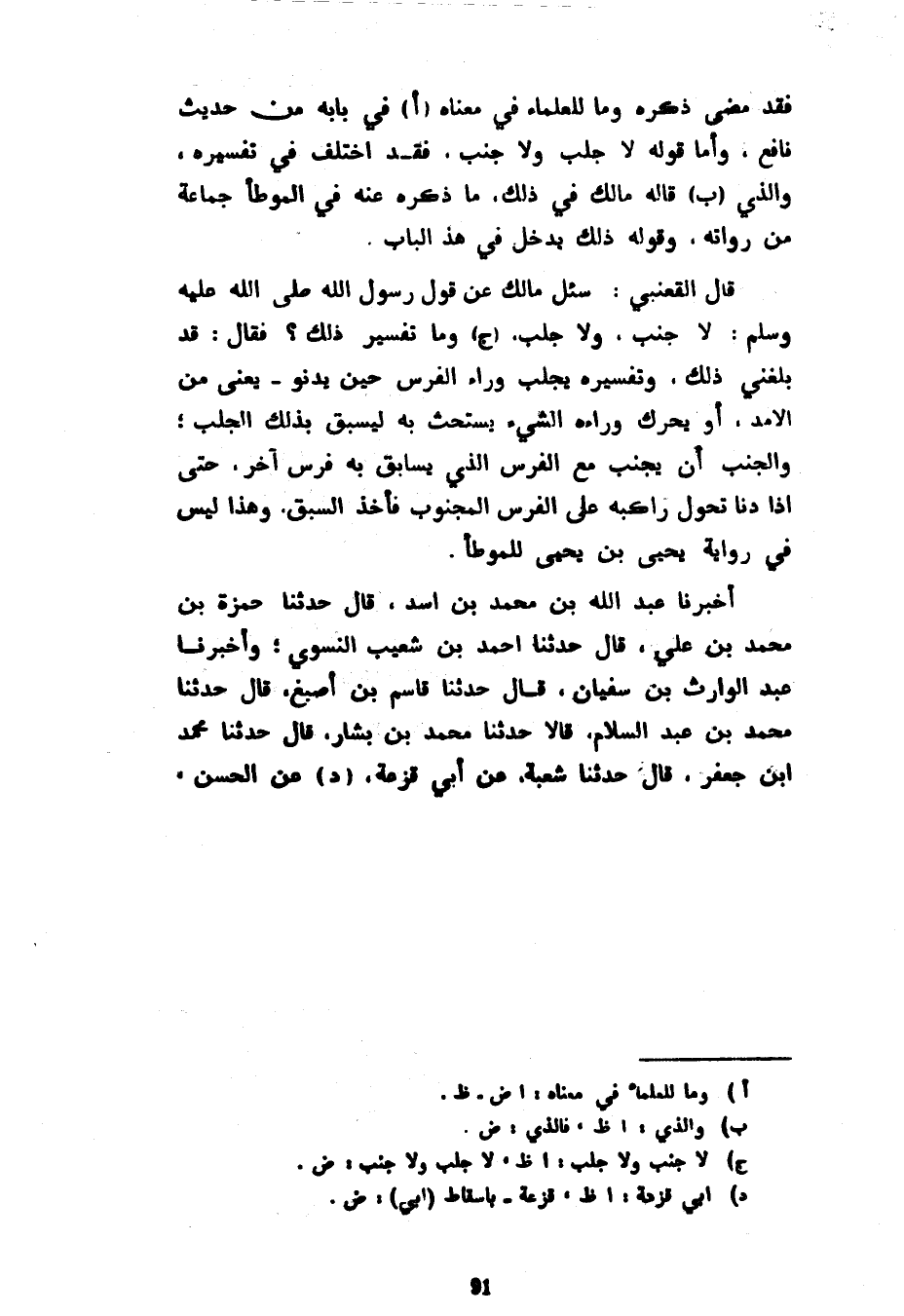 فَقَدْ مَضَى ذِكْرُهُ وَمَا لِلْعُلَمَاءِ فِي مَعْنَاهُ فِي بَابِهِ مِنْ حَدِيثِ نَافِعٍ وَأَمَّا قَوْلُهُ لَا جَلْبَ وَلَا جَنْبَ فَقَدِ اخْتُلِفَ فِي تَفْسِيرِهِ وَالَّذِي قَالَهُ مَالِكٌ فِي ذَلِكَ مَا ذَكَرَهُ عَنْهُ فِي الْمُوَطَّأِ جَمَاعَةٌ مِنْ رُوَاتِهِ وَقَوْلُهُ ذَلِكَ يَدْخُلُ فِي هَذَا الْبَابِ قَالَ الْقَعْنَبِيُّ سُئِلَ مَالِكٌ عَنْ قَوْلِ رَسُولِ اللَّهِ صَلَّى اللَّهُ عَلَيْهِ وَسَلَّمَ لَا جَنْبَ وَلَا جَلْبَ وَمَا تَفْسِيرُ ذَلِكَ فَقَالَ قَدْ بَلَغَنِي ذَلِكَ وَتَفْسِيرُهُ يَجْلِبُ وَرَاءَ الْفَرَسِ حِينَ يَدْنُو يَعْنِي مِنَ الْأَمَدِ أَوْ يُحَرِّكُ وَرَاءَهُ الشَّيْءَ يَسْتَحِثُّ بِهِ لِيَسْبِقَ بِذَلِكَ الْجَلْبِ وَالْجَنْبُ أَنْ يجنب مع الفرس الذي يسابق به فرس آخَرَ حَتَّى إِذَا دَنَا تَحَوَّلَ رَاكِبُهُ عَلَى الْفَرَسِ الْمَجْنُوبِ فَأَخَذَ السَّبْقَ وَهَذَا لَيْسَ فِي رِوَايَةِ يَحْيَى بْنِ يَحْيَى لِلْمُوَطَّأِ أَخْبَرَنَا عَبْدُ اللَّهِ بْنُ مُحَمَّدِ بْنِ أَسَدٍ قَالَ حَدَّثَنَا حَمْزَةُ بْنُ مُحَمَّدِ بْنِ عَلِيٍّ قَالَ حَدَّثَنَا أَحْمَدُ بْنُ شُعَيْبٍ النَّسَوِيُّ وَأَخْبَرَنَا عَبْدُ الْوَارِثِ بْنُ سُفْيَانَ قَالَ حَدَّثَنَا قَاسِمُ بْنُ أَصْبَغَ قَالَ حَدَّثَنَا مُحَمَّدُ بْنُ عَبْدِ السَّلَامِ قَالَا حَدَّثَنَا مُحَمَّدُ بْنُ بَشَّارٍ قَالَ حَدَّثَنَا مُحَمَّدُ بْنُ جَعْفَرٍ قَالَ حَدَّثَنَا شُعْبَةُ عَنْ أَبِي قَزْعَةَ عَنِ الْحَسَنِ