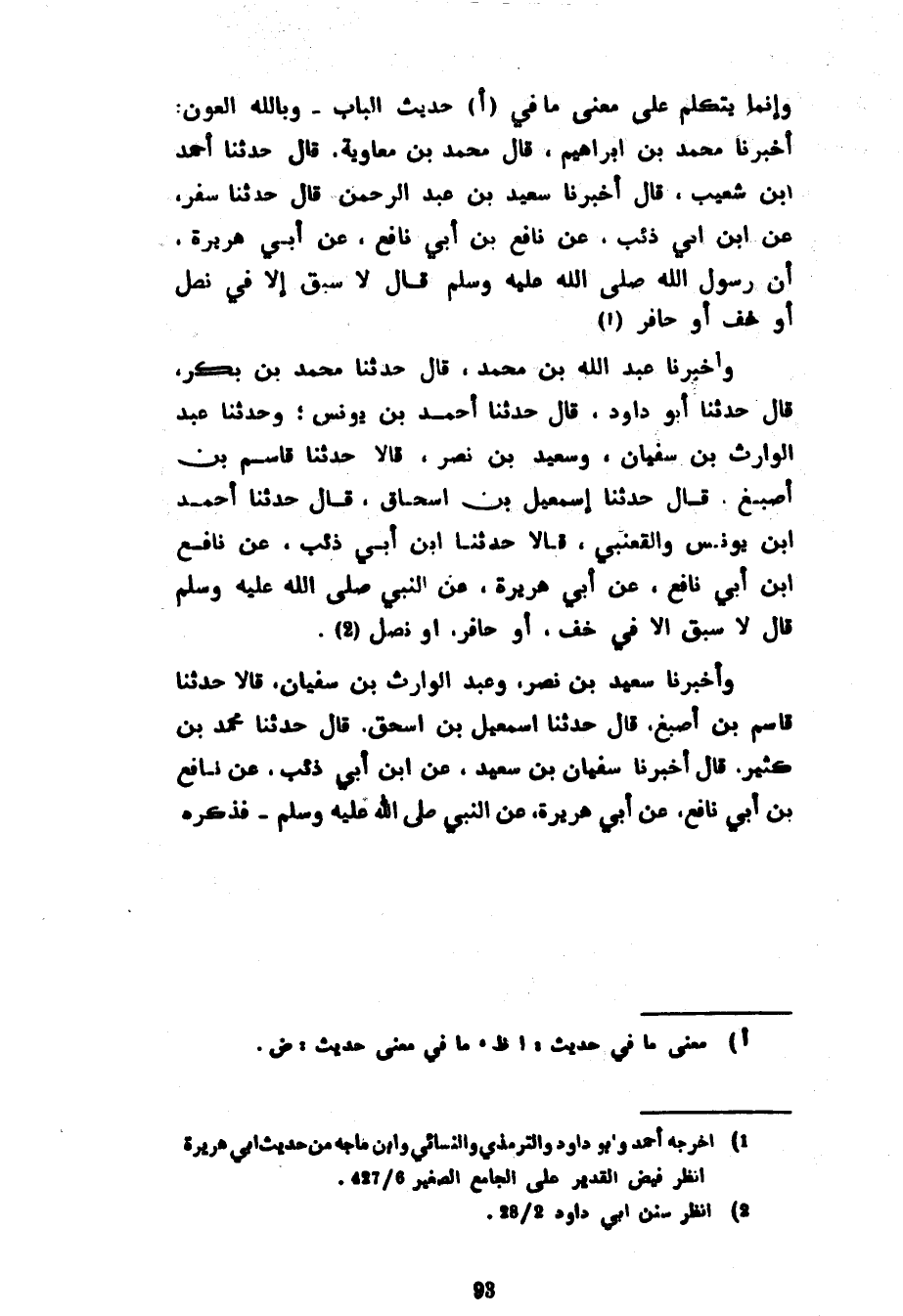 وَإِنَّمَا يَتَكَلَّمُ عَلَى مَعْنَى مَا فِي حَدِيثِ الْبَابِ وَبِاللَّهِ الْعَوْنُ أَخْبَرَنَا مُحَمَّدُ بْنُ إِبْرَاهِيمَ قَالَ مُحَمَّدُ بْنُ مُعَاوِيَةَ قَالَ حَدَّثَنَا أَحْمَدُ بْنُ شُعَيْبٍ قَالَ أَخْبَرَنَا سَعِيدُ بْنُ عَبْدِ الرَّحْمَنِ قَالَ حَدَّثَنَا سَفَرٌ عَنِ ابْنِ أَبِي ذِئْبٍ عَنْ نَافِعِ بْنِ أَبِي نَافِعٍ عَنْ أَبِي هُرَيْرَةَ أَنَّ رَسُولَ اللَّهِ صَلَّى اللَّهُ عَلَيْهِ وَسَلَّمَ قَالَ لَا سَبَقَ إِلَّا فِي نَصْلٍ أَوْ خُفٍّ أَوْ حَافِرٍ وَأَخْبَرَنَا عَبْدُ اللَّهِ بْنُ مُحَمَّدٍ قَالَ حَدَّثَنَا مُحَمَّدُ بْنُ بَكْرٍ قَالَ حَدَّثَنَا أَبُو دَاوُدَ قَالَ حدثنا أَحْمَدُ بْنُ يُونُسَ وَحَدَّثَنَا عَبْدُ الْوَارِثِ بْنُ سُفْيَانَ وَسَعِيدُ بْنُ نَصْرٍ قَالَا حَدَّثَنَا قَاسِمُ بْنُ أَصْبَغَ قَالَ حَدَّثَنَا إسمعيل بْنُ إِسْحَاقَ قَالَ حَدَّثَنَا أَحْمَدُ بْنُ يُونُسَ وَالْقَعْنَبِيُّ قَالَا حَدَّثَنَا ابْنُ أَبِي ذِئْبٍ عَنْ نَافِعِ بْنِ أَبِي نَافِعٍ عَنْ أَبِي هُرَيْرَةَ عَنِ النَّبِيِّ صَلَّى اللَّهُ عَلَيْهِ وَسَلَّمَ قَالَ لَا سَبَقَ إِلَّا فِي خُفٍّ أَوْ حَافِرٍ أَوْ نَصْلٍ وَأَخْبَرَنَا سَعِيدُ بْنُ نَصْرٍ وَعَبْدُ الْوَارِثِ بْنُ سُفْيَانَ قَالَا حَدَّثَنَا قَاسِمُ بْنُ أَصْبَغَ قَالَ حَدَّثَنَا إسمعيل بن إسحق قَالَ حَدَّثَنَا مُحَمَّدُ بْنُ كَثِيرٍ قَالَ أَخْبَرَنَا سُفْيَانُ بْنُ سَعِيدٍ عَنِ ابْنِ أَبِي ذِئْبٍ عَنِ نَافِعِ بْنِ أَبِي نَافِعٍ عَنْ أَبِي هُرَيْرَةَ عَنِ النَّبِيِّ صَلَّى اللَّهُ عَلَيْهِ وَسَلَّمَ فذكره
