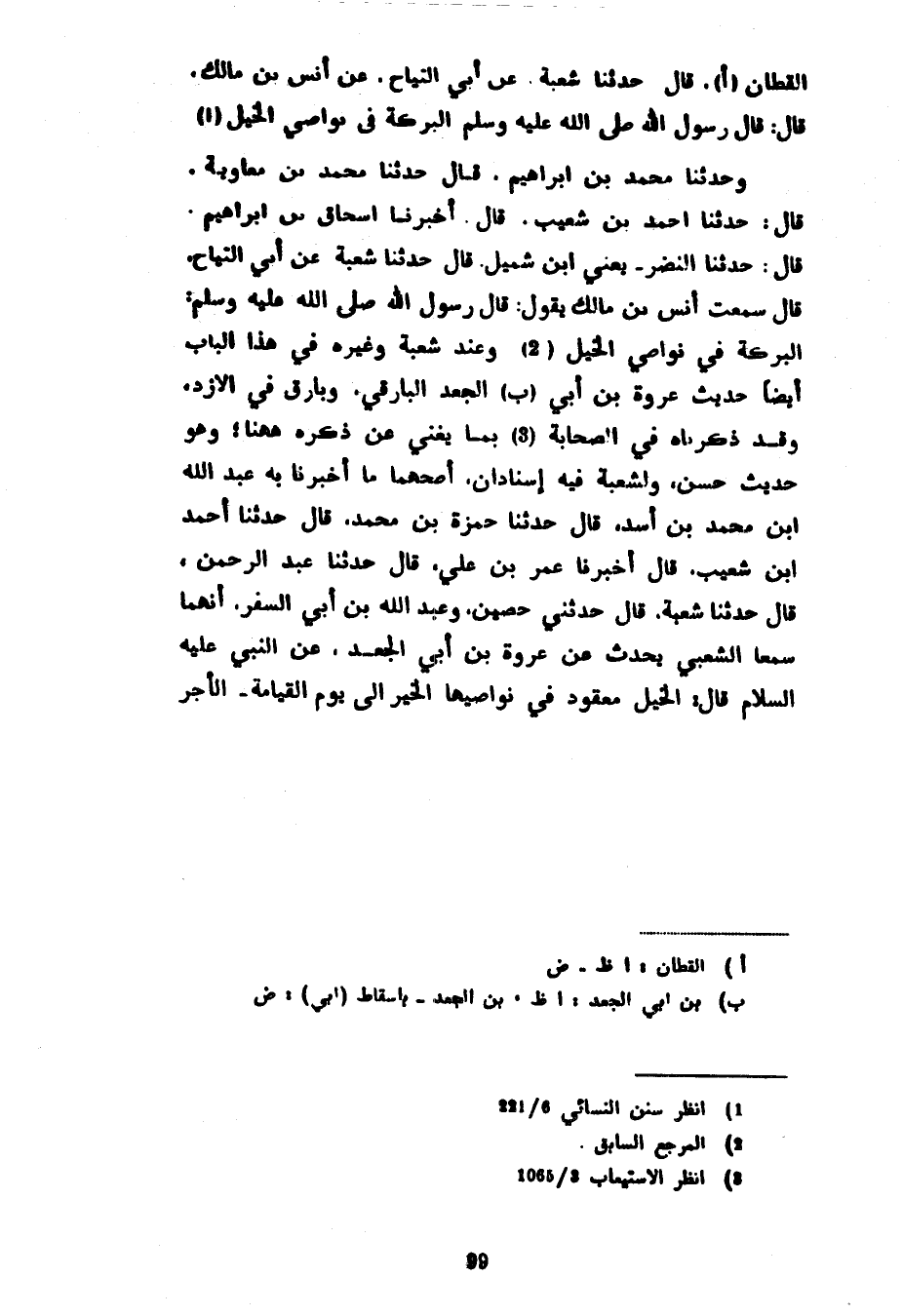 الْقَطَّانُ قَالَ حَدَّثَنَا شُعْبَةُ عَنْ أَبِي الْتَّيَّاحِ عَنْ أَنَسِ بْنِ مَالِكٍ قَالَ قَالَ رَسُولُ اللَّهِ صَلَّى اللَّهُ عَلَيْهِ وَسَلَّمَ الْبَرَكَةُ فِي نَوَاصِي الْخَيْلِ وَحَدَّثَنَا مُحَمَّدُ بْنُ إِبْرَاهِيمَ قَالَ حَدَّثَنَا مُحَمَّدُ بْنُ مُعَاوِيَةَ قَالَ حَدَّثَنَا أَحْمَدُ بْنُ شُعَيْبٍ قَالَ أَخْبَرَنَا إِسْحَاقُ بْنُ إِبْرَاهِيمَ قَالَ حَدَّثَنَا النَّضْرُ يَعْنِي ابْنَ شُمَيْلٍ قَالَ حَدَّثَنَا شُعْبَةُ عَنْ أَبِي التَّيَّاحِ قَالَ سَمِعْتُ أَنَسَ بْنَ مَالِكٍ يَقُولُ قَالَ رَسُولُ اللَّهِ صَلَّى اللَّهُ عَلَيْهِ وَسَلَّمَ الْبَرَكَةُ فِي نَوَاصِي الْخَيْلِ وَعِنْدَ شُعْبَةَ وَغَيْرِهِ فِي هَذَا الْبَابِ أَيْضًا حَدِيثُ عُرْوَةَ بْنِ أَبِي الْجَعْدِ الْبَارِقِيِّ وَبَارِقٌ فِي الْأزْدِ وَقَدْ ذَكَرْنَاهُ فِي الصَّحَابَةِ بِمَا يُغْنِي عَنْ ذِكْرِهِ هَهُنَا وَهُوَ حَدِيثٌ حَسَنٌ وَلِشُعْبَةَ فِيهِ إِسْنَادَانِ أَصَحُّهَمَا مَا أَخْبَرَنَا بِهِ عَبْدُ اللَّهِ بْنُ مُحَمَّدِ بْنِ أَسَدٍ قَالَ حَدَّثَنَا حَمْزَةُ بْنُ مُحَمَّدٍ قَالَ حَدَّثَنَا أَحْمَدُ بْنُ شُعَيْبٍ قَالَ أَخْبَرَنَا عُمَرُ بْنُ عَلِيٍّ قَالَ حَدَّثَنَا عَبْدُ الرَّحْمَنِ قَالَ حَدَّثَنَا شُعْبَةُ قَالَ حَدَّثَنِي حُصَيْنٌ وَعَبْدُ اللَّهِ بْنُ أَبِي السَّفَرَ أَنَّهُمَا سَمِعَا الشَّعْبِيَّ يُحَدِّثُ عَنْ عُرْوَةَ بْنِ أَبِي الْجَعْدِ عَنِ النَّبِيِّ عَلَيْهِ السَّلَامُ قَالَ الْخَيْلُ مَعْقُودٌ فِي نَوَاصِيهَا الْخَيْرُ إِلَى يَوْمِ الْقِيَامَةِ الْأَجْرُ
