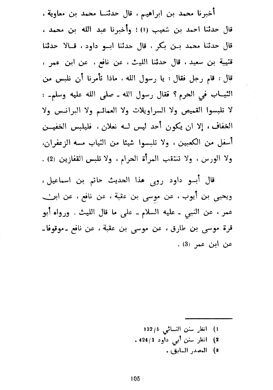 أَخْبَرَنَا مُحَمَّدُ بْنُ إِبْرَاهِيمَ قَالَ حَدَّثَنَا مُحَمَّدُ بْنُ مُعَاوِيَةَ قَالَ حَدَّثَنَا أَحْمَدُ بْنُ شُعَيْبٍ وَأَخْبَرَنَا عَبْدُ اللَّهِ بْنُ مُحَمَّدٍ قَالَ حَدَّثَنَا مُحَمَّدُ بْنُ بَكْرٍ قَالَ حَدَّثَنَا أَبُو دَاوُدَ قَالَا حَدَّثَنَا قُتَيْبَةُ بْنُ سَعِيدٍ قَالَ حَدَّثَنَا اللَّيْثُ عَنْ نَافِعٍ عَنِ ابْنِ عُمَرَ قَالَ قَامَ رَجُلٌ فَقَالَ يَا رَسُولَ اللَّهِ مَاذَا تَأْمُرُنَا أَنْ نَلْبَسَ مِنَ الثِّيَابِ فِي الْحَرَمِ فَقَالَ رَسُولُ اللَّهِ صَلَّى اللَّهُ عَلَيْهِ وَسَلَّمَ لَا تَلْبَسُوا الْقَمِيصَ وَلَا السَّرَاوِيلَاتِ وَلَا الْعَمَائِمَ وَلَا الْبَرَانِسَ وَلَا الْخِفَافَ إِلَّا أَنْ يَكُونَ أَحَدٌ لَيْسَ لَهُ نَعْلَانِ فَلْيَلْبَسِ الْخُفَّيْنِ أَسْفَلَ مِنَ الْكَعْبَيْنِ وَلَا تَلْبَسُوا شَيْئًا مِنَ الثِّيَابِ مَسَّهُ الزَّعْفَرَانُ وَلَا الْوَرْسُ وَلَا تَنْتَقِبُ الْمَرْأَةُ الْحَرَامُ وَلَا تَلْبَسُ الْقُفَّازَيْنِ قَالَ أَبُو دَاوُدَ رَوَى هَذَا الْحَدِيثَ حَاتِمُ بْنُ إِسْمَاعِيلَ وَيَحْيَى بْنُ أَيُّوبَ عَنْ مُوسَى بْنِ عُقْبَةَ عَنْ نَافِعٍ عَنِ ابْنِ عُمَرَ عَنِ النَّبِيِّ عَلَيْهِ السَّلَامُ عَلَى مَا قَالَ اللَّيْثُ وَرَوَاهُ أَبُو قُرَّةَ مُوسَى بْنُ طَارِقٍ عَنْ مُوسَى بْنِ عُقْبَةَ عَنْ نَافِعٍ مَوْقُوفًا عَنِ ابْنِ عُمَرَ