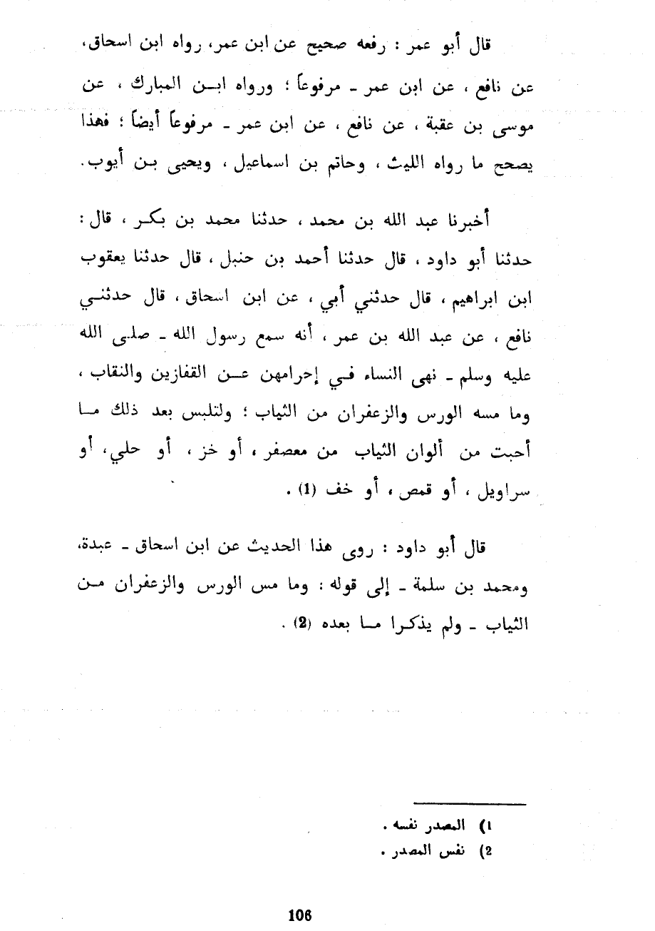 قَالَ أَبُو عُمَرَ رَفْعُهُ صَحِيحٌ عَنِ ابْنِ عُمَرَ رَوَاهُ ابْنُ إِسْحَاقَ عَنْ نَافِعٍ عَنِ ابْنِ عُمَرَ مَرْفُوعًا وَرَوَاهُ ابْنُ الْمُبَارَكِ عَنْ مُوسَى بْنِ عُقْبَةَ عَنْ نَافِعٍ عَنِ ابْنِ عُمَرَ مَرْفُوعًا أَيْضًا فَهَذَا يُصَحِّحُ مَا رَوَاهُ اللَّيْثُ وَحَاتِمُ بْنُ إِسْمَاعِيلَ وَيَحْيَى بْنُ أَيُّوبَ أَخْبَرَنَا عَبْدُ اللَّهِ بْنُ مُحَمَّدٍ حَدَّثَنَا مُحَمَّدُ بْنُ بَكْرٍ قَالَ حَدَّثَنَا أَبُو دَاوُدَ قَالَ حَدَّثَنَا أَحْمَدُ بْنُ حَنْبَلٍ قَالَ حَدَّثَنَا يَعْقُوبُ بْنُ إِبْرَاهِيمَ قَالَ حَدَّثَنِي أَبِي عَنِ ابْنِ إِسْحَاقَ قَالَ حَدَّثَنِي نَافِعٌ عَنْ عَبْدِ اللَّهِ بْنِ عُمَرَ أَنَّهُ سَمِعَ رَسُولَ اللَّهِ صَلَّى اللَّهُ عَلَيْهِ وَسَلَّمَ نَهَى النِّسَاءَ فِي إِحْرَامِهِنَّ عَنِ الْقُفَّازَيْنِ وَالنِّقَابِ وَمَا مَسَّهُ الْوَرْسُ وَالزَّعْفَرَانُ مِنَ الثِّيَابِ وَلْتَلْبَسْ بَعْدَ ذَلِكَ مَا أَحَبَّتْ مِنْ أَلْوَانِ الثِّيَابِ مِنْ مُعَصْفَرٍ أَوْ خَزٍّ أَوْ حُلِيٍّ أَوْ سَرَاوِيلَ أَوْ قُمُصٍ أَوْ خُفٍّ قَالَ أَبُو دَاوُدَ رَوَى هَذَا الْحَدِيثَ عَنِ ابْنِ إِسْحَاقَ عَبْدَةُ وَمُحَمَّدُ بْنُ سَلَمَةَ إِلَى قَوْلِهِ وَمَا مَسَّ الْوَرْسُ وَالزَّعْفَرَانُ مِنَ الثِّيَابِ وَلَمْ يَذْكُرَا مَا بَعْدَهُ