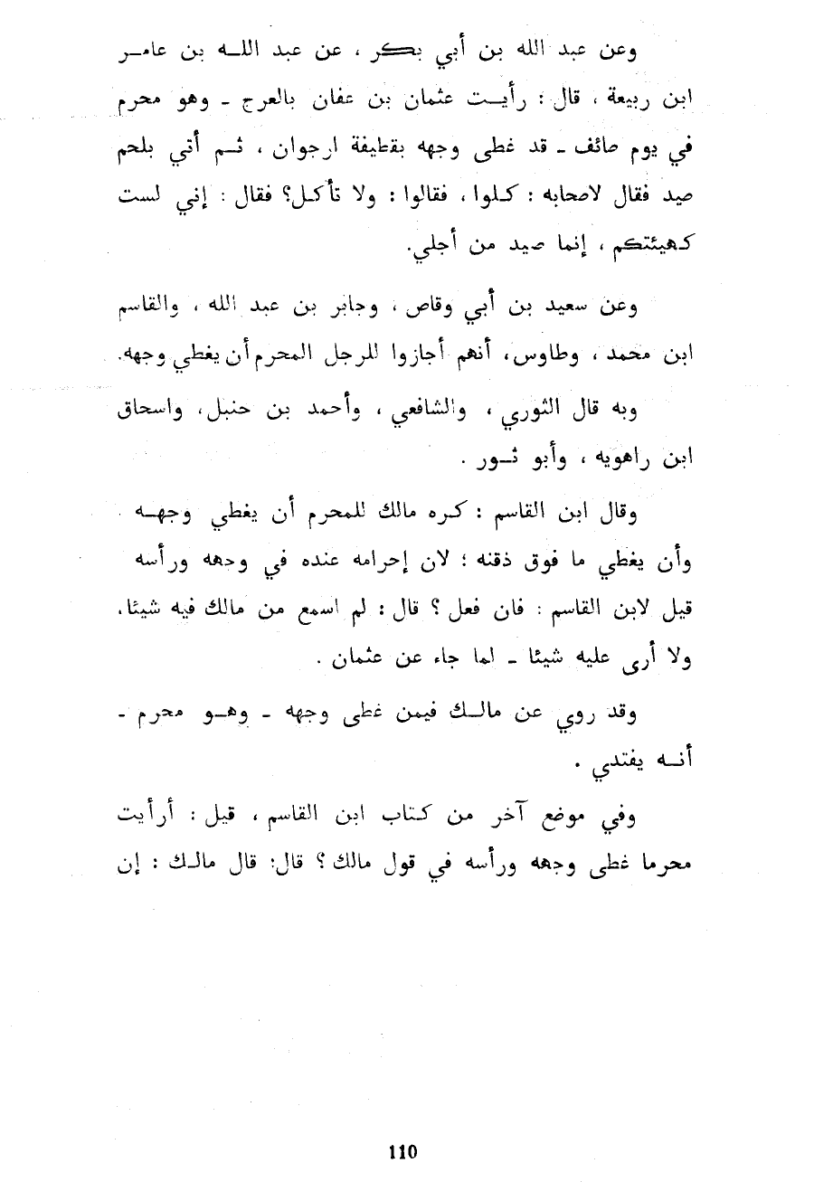 وَعَنْ عَبْدُ اللَّهِ بْنُ أَبِي بَكْرٍ عَنْ عَبْدِ اللَّهِ بْنِ عَامِرِ بْنِ رَبِيعَةَ قَالَ رَأَيْتُ عُثْمَانَ بْنَ عَفَّانَ بِالْعَرَجِ وَهُوَ مُحْرِمٌ فِي يَوْمٍ صَائِفٍ قَدْ غَطَّى وَجْهَهُ بِقَطِيفَةِ أُرْجُوَانٍ ثُمَّ أُتِيَ بِلَحْمِ صَيْدٍ فَقَالَ لِأَصْحَابِهِ كُلُوا فَقَالُوا وَلَا تَأْكُلُ فَقَالَ إِنِّي لَسْتُ كَهَيْئَتِكُمْ إِنَّمَا صِيدَ مِنْ أَجْلِي وَعَنْ سَعِيدِ بن أبي وقاص وجابر بن عبد الله وَالْقَاسِمِ بْنِ مُحَمَّدٍ وَطَاوُسٍ أَنَّهُمْ أَجَازُوا لِلرَّجُلِ الْمُحْرِمِ أَنْ يُغَطِّيَ وَجْهَهُ وَبِهِ قَالَ الثَّوْرِيُّ وَالشَّافِعِيُّ وَأَحْمَدُ بْنُ حَنْبَلٍ وَإِسْحَاقُ بْنُ رَاهَوَيْهِ وَأَبُو ثَوْرٍ وَقَالَ ابْنُ الْقَاسِمِ كَرِهَ مَالِكٌ لِلْمُحْرِمِ أَنْ يُغَطِّيَ وَجْهَهُ وَأَنْ يُغَطِّيَ مَا فَوْقَ ذَقْنِهِ لِأَنَّ إِحْرَامَهُ عِنْدَهُ فِي وَجْهِهِ وَرَأْسِهِ قِيلَ لِابْنِ الْقَاسِمِ فَإِنْ فَعَلَ قَالَ لَمْ أَسْمَعْ مِنْ مَالِكٍ فِيهِ شَيْئًا وَلَا أَرَى عَلَيْهِ شَيْئًا لِمَا جَاءَ عَنْ عُثْمَانَ وَقَدْ رُوِيَ عَنْ مَالِكٍ فَيَمَنْ غَطَّى وَجْهَهُ وَهُوَ مُحْرِمٌ أَنَّهُ يَفْتَدِي وَفِي مَوْضِعٍ آخَرَ مِنْ كِتَابِ ابْنِ الْقَاسِمِ قِيلَ أَرَأَيْتَ مُحْرِمًا غَطَّى وَجْهَهُ وَرَأْسَهُ فِي قَوْلِ مَالِكٍ قَالَ قَالَ مَالِكٌ إِنْ