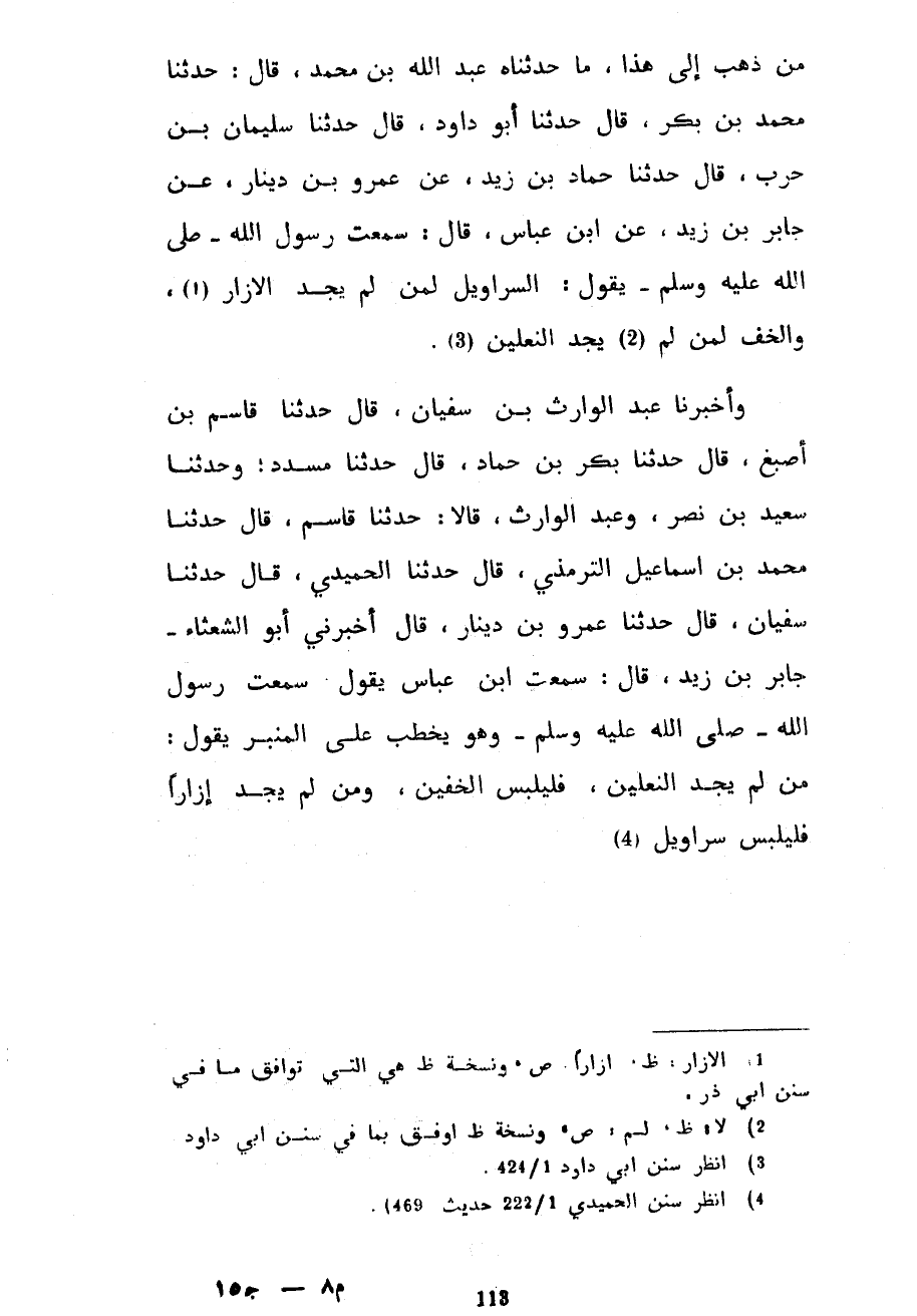 مَنْ ذَهَبَ إِلَى هَذَا مَا حَدَّثَنَاهُ عَبْدُ اللَّهِ بْنُ مُحَمَّدٍ قَالَ حَدَّثَنَا مُحَمَّدُ بْنُ بَكْرٍ قَالَ حَدَّثَنَا أَبُو دَاوُدَ قَالَ حَدَّثَنَا سُلَيْمَانُ بْنُ حَرْبٍ قَالَ حَدَّثَنَا حَمَّادُ بْنُ زَيْدٍ عَنْ عَمْرِو بْنِ دِينَارٍ عَنْ جَابِرِ بْنِ زَيْدٍ عَنِ ابْنِ عَبَّاسٍ قَالَ سَمِعْتُ رَسُولَ اللَّهِ صَلَّى اللَّهُ عَلَيْهِ وسلم يقول السَّرَاوِيلُ لِمَنْ لَمْ يَجِدِ الْإِزَارَ وَالْخُفُّ لِمَنْ لَمْ يَجِدِ النَّعْلَيْنِ وَأَخْبَرَنَا عَبْدُ الْوَارِثِ بْنُ سُفْيَانَ قَالَ حَدَّثَنَا قَاسِمُ بْنُ أَصْبَغَ قَالَ حَدَّثَنَا بَكْرُ بْنُ حَمَّادٍ قَالَ حَدَّثَنَا مُسَدَّدٌ وَحَدَّثَنَا سَعِيدُ بْنُ نَصْرٍ وَعَبْدُ الْوَارِثِ قَالَا حَدَّثَنَا قَاسِمٌ قَالَ حَدَّثَنَا مُحَمَّدُ بْنُ إِسْمَاعِيلَ التِّرْمِذِيُّ قَالَ حَدَّثَنَا الْحُمَيْدِيُّ قَالَ حَدَّثَنَا سُفْيَانُ قَالَ حَدَّثَنَا عَمْرُو بْنُ دِينَارٍ قَالَ أَخْبَرَنِي أَبُو الشَّعْثَاءِ جَابِرُ بْنُ زَيْدٍ قَالَ سَمِعْتُ ابْنَ عَبَّاسٍ يَقُولُ سَمِعْتُ رَسُولَ اللَّهِ صَلَّى اللَّهُ عَلَيْهِ وَسَلَّمَ وَهُوَ يَخْطُبُ عَلَى الْمِنْبَرِ يَقُولُ مَنْ لَمْ يَجِدِ النَّعْلَيْنِ فَلْيَلْبَسِ الْخُفَّيْنِ وَمَنْ لَمْ يَجِدْ إِزَارًا فَلْيَلْبَسْ سَرَاوِيلَ