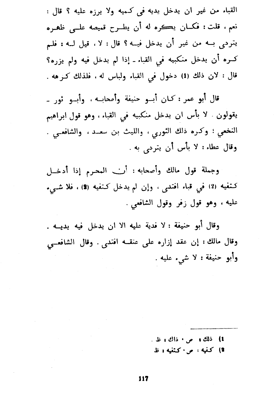 الْقَبَاءِ مِنْ غَيْرِ أَنْ يُدْخِلَ يَدَيْهِ فِي كُمَّيْهِ وَلَا يَزِرَهُ عَلَيْهِ قَالَ نَعَمْ قُلْتُ فَكَانَ يُكْرَهُ لَهُ أَنْ يَطْرَحَ قَمِيصَهُ عَلَى ظَهْرِهِ يَتَرَدَّى بِهِ مِنْ غَيْرِ أَنْ يَدْخُلَ فِيهِ قَالَ لَا قِيلَ لَهُ فَلِمَ كَرِهَ أَنْ يَدْخُلَ مَنْكِبَيْهِ فِي الْقَبَاءِ إِذَا لَمْ يَدْخُلْ فِيهِ وَلَمْ يَزِرْهُ قَالَ لِأَنَّ ذَلِكَ دُخُولٌ فِي الْقَبَاءِ وَلِبَاسٌ لَهُ فَلِذَلِكَ كَرِهَهُ قَالَ أَبُو عُمَرَ كَانَ أَبُو حَنِيفَةَ وَأَصْحَابُهُ وَأَبُو ثَوْرٍ يَقُولُونَ لَا بَأْسَ أَنْ يُدْخِلَ مَنْكِبَيْهِ فِي الْقَبَاءِ وَهُوَ قَوْلُ إِبْرَاهِيمَ النَّخَعِيِّ وَكَرِهَ ذَلِكَ الثَّوْرِيُّ وَاللَّيْثُ بْنُ سَعْدٍ وَالشَّافِعِيُّ وَقَالَ عَطَاءٌ لَا بَأْسَ أَنْ يَتَرَدَّى بِهِ وَجُمْلَةُ قَوْلِ مَالِكٍ وَأَصْحَابِهِ أَنَّ الْمُحْرِمَ إِذَا أَدْخَلَ كَتِفَيْهِ فِي قَبَاءٍ افْتَدَى وَإِنْ لَمْ يُدْخِلْ كَتِفَيْهِ فَلَا شَيْءَ عَلَيْهِ وَهُوَ قَوْلُ زُفَرَ وَقَوْلُ الشَّافِعِيِّ وَقَالَ أَبُو حَنِيفَةَ لَا فِدْيَةَ عَلَيْهِ إِلَّا أَنْ يُدْخِلَ فِيهِ يَدَيْهِ وَقَالَ مَالِكٌ إِنْ عَقَدَ إِزَارَهُ عَلَى عُنُقِهِ افْتَدَى وَقَالَ الشَّافِعِيُّ وَأَبُو حَنِيفَةَ لَا شَيْءَ عليه