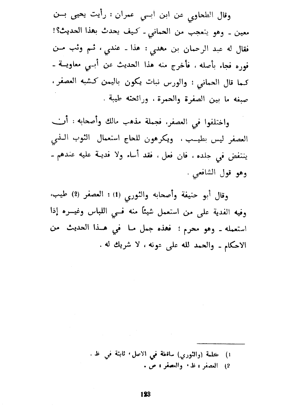 وَقَالَ الطَّحَاوِيُّ عَنِ ابْنِ أَبِي عِمْرَانَ رَأَيْتُ يَحْيَى بْنَ مَعِينٍ وَهُوَ يَتَعَجَّبُ مِنَ الْحِمَّانِيِّ كَيْفَ يُحَدِّثُ بِهَذَا الْحَدِيثِ فَقَالَ لَهُ عَبْدُ الرحمان بْنُ مَهْدِيٍّ هَذَا عِنْدِي ثُمْ وَثَبَ مِنْ فَوْرِهِ فَجَاءَ بِأَصْلِهِ فَأَخْرَجَ مِنْهُ هَذَا الْحَدِيثَ عَنْ أَبِي مُعَاوِيَةَ كَمَا قَالَ الْحِمَّانِيُّ وَالْوَرْسُ نبات يكون باليمن كَشِبْهِ الْعُصْفُرِ صَبْغُهُ مَا بَيْنَ الصُّفْرَةِ وَالْحُمْرَةِ وَرَائِحَتُهُ طَيِّبَةٌ وَاخْتَلَفُوا فِي الْعُصْفُرِ فَجُمْلَةُ مَذْهَبِ مَالِكٍ وَأَصْحَابِهِ أَنَّ الْعُصْفُرَ لَيْسَ بِطِيبٍ وَيَكْرَهُونَ لِلْحَاجِّ اسْتِعْمَالَ الثَّوْبِ الَّذِي يُنْتَفَضُ فِي جِلْدِهِ فَإِنْ فَعَلَ فَقَدْ أَسَاءَ وَلَا فِدْيَةَ عَلَيْهِ عِنْدَهُمْ وَهُوَ قَوْلُ الشَّافِعِيِّ وَقَالَ أَبُو حَنِيفَةَ وَأَصْحَابُهُ وَالثَّوْرِيُّ الْعُصْفُرُ طِيبٌ وَفِيهِ الْفِدْيَةُ عَلَى مَنِ اسْتَعْمَلَ شَيْئًا مِنْهُ فِي اللِّبَاسِ وَغَيْرِهِ إِذَا اسْتَعْمَلَهُ وَهُوَ مُحْرِمٌ فَهَذِهِ جُمَلُ مَا فِي هَذَا الْحَدِيثِ مِنَ الْأَحْكَامِ وَالْحَمْدُ لِلَّهِ على عونه لا شريك له