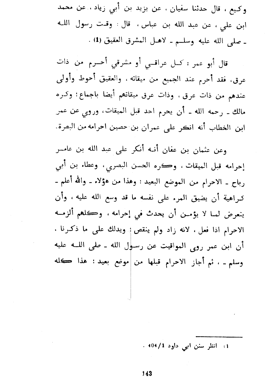 وَكِيعٌ قَالَ حَدَّثَنَا سُفْيَانُ عَنْ يَزِيدَ بْنِ أَبِي زِيَادٍ عَنْ مُحَمَّدِ بْنِ عَلِيٍّ عَنْ عَبْدِ اللَّهِ بْنِ عَبَّاسٍ قَالَ وَقَّتَ رَسُولِ اللَّهِ صَلَّى اللَّهُ عَلَيْهِ وَسَلَّمَ لِأَهْلِ الْمَشْرِقِ الْعَقِيقَ قَالَ أَبُو عُمَرَ كُلُّ عِرَاقِيٍّ أَوْ مَشْرِقِيٍّ أَحْرَمَ مِنْ ذَاتِ عِرْقٍ فَقَدْ أَحْرَمَ عِنْدَ الْجَمِيعِ مِنْ مِيقَاتِهِ وَالْعَقِيقُ أَحْوَطُ وَأَوْلَى عِنْدَهُمْ مِنْ ذَاتِ عِرْقٍ وَذَاتُ عِرْقٍ مِيقَاتُهُمْ أَيْضًا بِإِجْمَاعٍ وَكَرِهَ مَالِكٌ رَحِمَهُ اللَّهُ أَنْ يُحْرِمَ أَحَدٌ قَبْلَ الْمِيقَاتِ وَرُوِيَ عَنْ عُمَرَ بْنِ الْخَطَّابِ أَنَّهُ أَنْكَرَ عَلَى عِمْرَانَ بْنِ حُصَيْنٍ إِحْرَامَهُ مِنَ الْبَصْرَةِ وَعَنْ عُثْمَانَ بْنِ عَفَّانَ أَنَّهُ أَنْكَرَ عَلَى عَبْدِ اللَّهِ بْنِ عَامِرٍ إِحْرَامَهُ قَبْلَ الْمِيقَاتِ وَكَرِهَ الْحَسَنُ الْبَصْرِيُّ وَعَطَاءُ بْنُ أَبِي رَبَاحٍ الْإِحْرَامَ مِنَ الْمَوْضِعِ الْبَعِيدِ وَهَذَا مِنْ هَؤُلَاءِ وَاللَّهُ أَعْلَمُ كَرَاهِيَةَ أَنْ يُضَيِّقَ الْمَرْءُ عَلَى نَفْسِهِ مَا قَدْ وَسَّعَ اللَّهُ عَلَيْهِ وَأَنْ يَتَعَرَّضَ لِمَا لَا يُؤْمَنُ أَنْ يَحْدُثَ فِي إِحْرَامِهِ وَكُلُّهُمْ أَلْزَمَهُ الْإِحْرَامَ إِذَا فَعَلَ لِأَنَّهُ زَادَ وَلَمْ يَنْقُصْ وَيَدُلُّكَ عَلَى مَا ذَكَرْنَا أَنَّ ابْنَ عُمَرَ رَوَى الْمَوَاقِيتَ عَنْ رَسُولِ اللَّهِ صَلَّى اللَّهُ عَلَيْهِ وَسَلَّمَ ثُمَّ أَجَازَ الْإِحْرَامَ قَبْلَهَا مِنْ مَوْضِعٍ بَعِيدٍ هَذَا كُلُّهُ