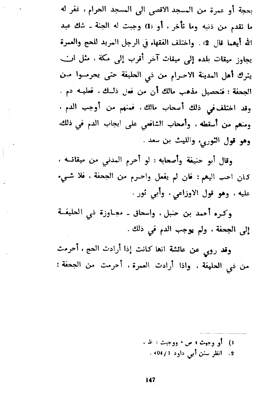 بِحَجَّةٍ أَوْ عُمْرَةٍ مِنَ الْمَسْجِدِ الْأَقْصَى إِلَى الْمَسْجِدِ الْحَرَامِ غُفِرَ لَهُ مَا تَقَدَّمَ مِنْ ذَنْبِهِ وَمَا تَأَخَّرَ أَوْ وَجَبَتْ لَهُ الْجَنَّةُ شَكَّ عَبْدُ اللَّهِ أَيُّهُمَا قَالَ وَاخْتَلَفَ الْفُقَهَاءُ فِي الرَّجُلِ الْمُرِيدِ لِلْحَجِّ وَالْعُمْرَةِ يُجَاوِزُ مِيقَاتَ بَلَدِهِ إِلَى مِيقَاتٍ آخَرَ أَقْرَبَ إِلَى مَكَّةَ مِثْلَ أَنْ يَتْرُكَ أَهْلُ الْمَدِينَةِ الْإِحْرَامَ مِنْ ذِي الْحُلَيْفَةِ حَتَّى يُحْرِمُوا مِنَ الْجُحْفَةِ فَتَحْصِيلُ مَذْهَبِ مَالِكٍ أَنَّ مَنْ فَعَلَ ذَلِكَ فَعَلَيْهِ دَمٌ وَقَدِ اخْتَلَفَ فِي ذَلِكَ أَصْحَابُ مَالِكٍ فَمِنْهُمْ مَنْ أَوْجَبَ الدَّمَ وَمِنْهُمْ مَنْ أَسْقَطَهُ وَأَصْحَابُ الشَّافِعِيِّ عَلَى إِيجَابِ الدَّمِ فِي ذَلِكَ وَهُوَ قَوْلُ الثَّوْرِيِّ وَاللَّيْثِ بْنِ سَعْدٍ وَقَالَ أَبُو حَنِيفَةَ وَأَصْحَابُهُ لَوْ أَحْرَمَ الْمَدَنِيُّ مِنْ مِيقَاتِهِ كَانَ أَحَبَّ إِلَيْهِمْ فَإِنْ لَمْ يَفْعَلْ وَأَحْرَمَ مِنَ الْجُحْفَةِ فَلَا شَيْءَ عَلَيْهِ وَهُوَ قَوْلُ الْأَوْزَاعِيِّ وَأَبِي ثَوْرٍ وَكَرِهَ أَحْمَدُ بْنُ حَنْبَلٍ وَإِسْحَاقُ مُجَاوَزَةَ ذِي الْحُلَيْفَةِ إِلَى الْجُحْفَةِ وَلَمْ يُوجِبِ الدَّمَ فِي ذَلِكَ وَقَدْ رُوِيَ عَنْ عَائِشَةَ أَنَّهَا كَانَتْ إِذَا أَرَادَتِ الْحَجَّ أَحْرَمَتْ مِنْ ذِي الْحُلَيْفَةِ وَإِذَا أَرَادَتِ الْعُمْرَةَ أَحْرَمَتْ مِنَ الْجُحْفَةِ