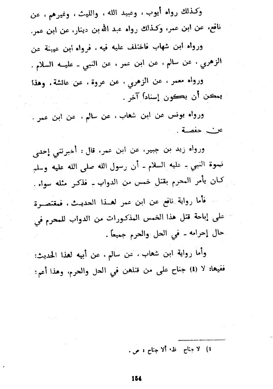 وكذلك رواه أيوب وعبيد الله والليث وَغَيْرُهُمْ عَنْ نَافِعٍ عَنِ ابْنِ عُمَرَ وَكَذَلِكَ رَوَاهُ عَبْدِ اللَّهِ بْنِ دِينَارٍ عَنِ ابْنِ عُمَرَ وَرَوَاهُ ابْنُ شِهَابٍ فَاخْتُلِفَ عَلَيْهِ فِيهِ فَرَوَاهُ ابْنُ عُيَيْنَةَ عَنِ الزُّهْرِيِّ عَنْ سَالِمٍ عَنِ ابْنِ عُمَرَ عَنِ النَّبِيِّ عَلَيْهِ السَّلَامُ وَرَوَاهُ مَعْمَرٍ عَنِ الزُّهْرِيِّ عَنْ عُرْوَةَ عَنْ عَائِشَةَ وَهَذَا يُمْكِنُ أَنْ يَكُونَ إِسْنَادًا آخَرَ وَرَوَاهُ يُونُسُ عَنِ ابْنِ شِهَابٍ عَنْ سَالِمٍ عَنِ ابْنِ عُمَرَ عَنْ حَفْصَةَ وَرَوَاهُ زَيْدُ بْنُ جُبَيْرٍ عَنِ ابْنِ عُمَرَ قَالَ أَخْبَرَتْنِي إِحْدَى نِسْوَةِ النَّبِيِّ عَلَيْهِ السَّلَامُ أَنَّ رَسُولَ اللَّهِ صَلَّى اللَّهُ عَلَيْهِ وَسَلَّمَ كَانَ يَأْمُرُ الْمُحْرِمَ بِقَتْلِ خَمْسٍ مِنَ الدَّوَابِّ فَذَكَرَ مِثْلَهُ سَوَاءً فَأَمَّا رِوَايَةُ نَافِعٍ عَنِ ابْنِ عُمَرَ لهذا الحديث فمقتصرة على إباحة قتل هذا الْخَمْسِ الْمَذْكُورَاتِ مِنَ الدَّوَابِّ لِلْمُحْرِمِ فِي حَالِ إِحْرَامِهِ فِي الْحِلِّ وَالْحَرَمِ جَمِيعًا وَأَمَّا رِوَايَةُ ابْنِ شِهَابٍ عَنْ سَالِمٍ عَنْ أَبِيهِ لِهَذَا الْحَدِيثِ فَفِيهَا لَا جُنَاحَ عَلَى مَنْ قَتَلَهُنَّ فِي الْحِلِّ وَالْحَرَمِ وَهَذَا أَعَمُّ