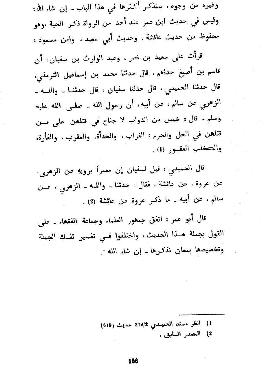 وَغَيْرِهِ مِنْ وُجُوهٍ سَنَذْكُرُ أَكْثَرَهَا فِي هَذَا الْبَابِ إِنْ شَاءَ اللَّهُ وَلَيْسَ فِي حَدِيثِ ابْنِ عُمَرَ عِنْدَ أَحَدٍ مِنَ الرُّوَاةِ ذِكْرُ الْحَيَّةِ وَهُوَ مَحْفُوظٌ مِنْ حَدِيثِ عَائِشَةَ وَحَدِيثِ أَبِي سَعِيدٍ وَابْنِ مَسْعُودٍ قَرَأْتُ عَلَى سَعِيدُ بْنُ نَصْرٍ وَعَبْدُ الْوَارِثِ بْنُ سُفْيَانَ أَنَّ قَاسِمَ بْنَ أَصْبَغَ حَدَّثَهُمْ قَالَ حَدَّثَنَا مُحَمَّدُ بْنُ إِسْمَاعِيلَ التِّرْمِذِيُّ قَالَ حَدَّثَنَا الْحُمَيْدِيُّ قَالَ حَدَّثَنَا سُفْيَانُ قَالَ حَدَّثَنَا وَاللَّهِ الزُّهْرِيُّ عَنْ سَالِمٍ عَنْ أَبِيهِ أَنَّ رَسُولَ اللَّهِ صَلَّى اللَّهُ عَلَيْهِ وَسَلَّمَ قَالَ خَمْسٌ مِنَ الدَّوَابِّ لَا جُنَاحَ فِي قَتْلِهِنَّ عَلَى مَنْ قَتَلَهُنَّ فِي الْحِلِّ وَالْحَرَمِ الْغُرَابُ وَالْحِدَأَةُ وَالْعَقْرَبُ وَالْفَأْرَةُ وَالْكَلْبُ الْعَقُورُ قَالَ الْحُمَيْدِيُّ قِيلَ لِسُفْيَانَ إِنَّ مَعْمَرًا يَرْوِيهِ عَنِ الزُّهْرِيِّ عَنْ عُرْوَةَ عَنْ عَائِشَةَ فَقَالَ حَدَّثَنَا وَاللَّهِ الزُّهْرِيُّ عَنْ سَالِمٍ عَنْ أَبِيهِ مَا ذَكَرَ عُرْوَةُ عَنْ عَائِشَةَ قَالَ أَبُو عُمَرَ اتَّفَقَ جُمْهُورُ الْعُلَمَاءِ وَجَمَاعَةُ الْفُقَهَاءِ عَلَى الْقَوْلِ بِجُمْلَةِ هَذَا الْحَدِيثِ وَاخْتَلَفُوا فِي تَفْسِيرِ تِلْكَ الْجُمْلَةِ وَتَخْصِيصِهَا بِمَعَانٍ نَذْكُرُهَا إِنْ شَاءَ اللَّهُ