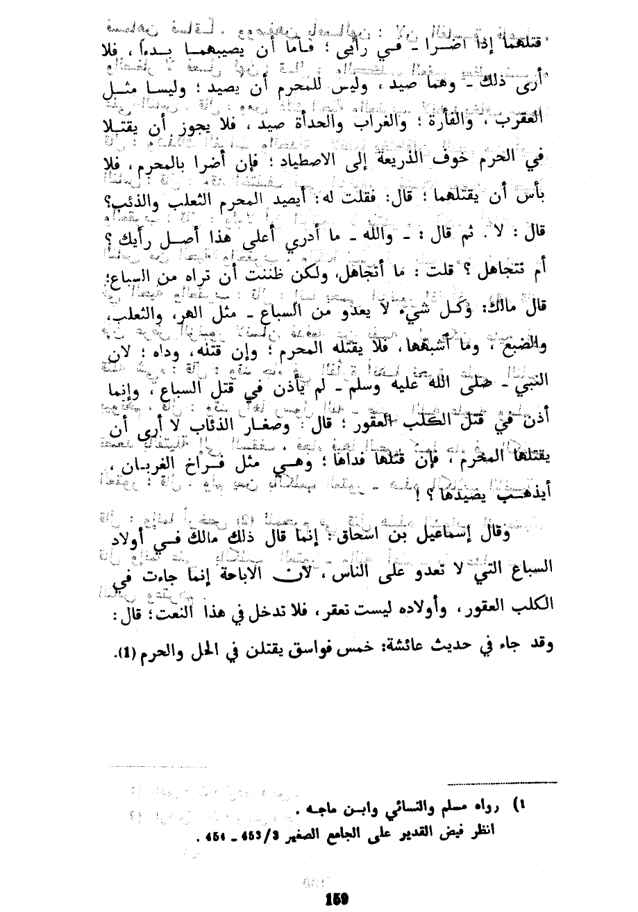قَتْلِهِمَا إِذَا أَضَرَّا فِي رَأْيِي فَأَمَّا أَنْ يُصِيبَهُمَا بَدْءًا فَلَا أَرَى ذَلِكَ وَهُمَا صَيْدٌ وَلَيْسَ لِلْمُحْرِمِ أَنْ يَصِيدَ وَلَيْسَا مِثْلَ الْعَقْرَبِ وَالْفَأْرَةِ وَالْغُرَابِ وَالْحِدَأَةِ صَيْدٌ فَلَا يَجُوزُ أَنْ يَقْتُلَا فِي الْحَرَمِ خَوْفَ الذَّرِيعَةِ إِلَى الِاصْطِيَادِ فَإِنْ أَضَرَّا بِالْمُحْرِمِ فَلَا بَأْسَ أَنْ يَقْتُلَهُمَا قَالَ فَقُلْتُ لَهُ أَيَصِيدُ الْمُحْرِمُ الثَّعْلَبَ وَالذِّئْبَ قَالَ لَا ثُمَّ قَالَ وَاللَّهِ مَا أَدْرِي أَعَلَى هَذَا أَصْلُ رَأْيِكَ أَمْ تَتَجَاهَلُ قُلْتُ مَا أَتَجَاهَلُ وَلَكِنْ ظَنَنْتُ أَنْ تَرَاهُ مِنَ السِّبَاعِ قَالَ مَالِكٌ وَكُلُّ شَيْءٍ لَا يَعْدُو مِنَ السِّبَاعِ مِثْلُ الْهِرِّ وَالثَّعْلَبِ وَالضَّبْعِ وَمَا أَشْبَهَهَا فَلَا يَقْتُلُهُ الْمُحْرِمُ وَإِنْ قَتَلَهُ وَدَاهُ لِأَنَّ النَّبِيَّ صَلَّى اللَّهُ عَلَيْهِ وَسَلَّمَ لَمْ يَأْذَنْ فِي قَتْلِ السِّبَاعِ وَإِنَّمَا أَذِنَ فِي قَتْلِ الْكَلْبِ الْعَقُورِ قَالَ وَصِغَارُ الذِّئَابِ لَا أَرَى أَنْ يَقْتُلَهَا الْمُحْرِمُ فَإِنْ قَتَلَهَا فَدَاهَا وَهِيَ مِثْلُ فِرَاخِ الْغِرْبَانِ أَيَذْهَبُ يَصِيدُهَا وَقَالَ إِسْمَاعِيلُ بْنُ إِسْحَاقَ إِنَّمَا قَالَ ذَلِكَ مَالِكٌ فِي أَوْلَادِ السِّبَاعِ الَّتِي لَا تَعْدُو عَلَى النَّاسِ لِأَنَّ الْإِبَاحَةَ إِنَّمَا جَاءَتْ فِي الْكَلْبِ العقور وأولاده لست تَعْقِرُ فَلَا تَدْخُلُ فِي هَذَا النَّعْتِ قَالَ وَقَدْ جَاءَ فِي حَدِيثِ عَائِشَةَ خَمْسٌ فَوَاسَقُ يُقْتَلْنَ فِي الْحِلِّ وَالْحَرَمِ