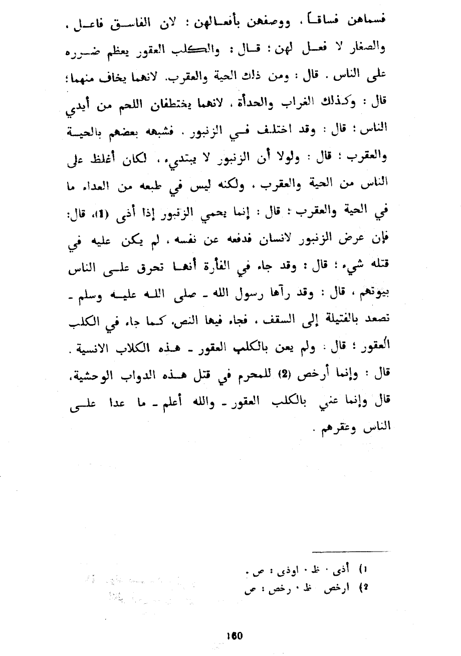فَسَمَّاهُنَّ فُسَّاقَا وَوَصَفَهُنَّ بِأَفْعَالِهِنَّ لِأَنَّ الْفَاسِقَ فَاعِلٌ وَالصِّغَارُ لَا فِعْلَ لَهُنَّ قَالَ وَالْكَلْبُ الْعَقُورُ يَعْظُمُ ضَرَرُهُ عَلَى النَّاسِ قَالَ وَمِنْ ذَلِكَ الْحَيَّةُ وَالْعَقْرَبُ لِأَنَّهُمَا يُخَافُ مِنْهُمَا قَالَ وَكَذَلِكَ الْغُرَابُ وَالْحِدَأَةُ لِأَنَّهُمَا يَخْتَطِفَانِ اللَّحْمَ مِنْ أَيْدِي النَّاسِ قَالَ وَقَدِ اخْتُلِفَ فِي الزُّنْبُورِ فَشَبَّهَهُ بَعْضُهُمْ بِالْحَيَّةِ وَالْعَقْرَبِ قَالَ وَلَوْلَا أَنَّ الزُّنْبُورَ لَا يَبْتَدِئُ لَكَانَ أَغْلَظَ عَلَى النَّاسِ مِنَ الْحَيَّةِ وَالْعَقْرَبِ وَلَكِنَّهُ لَيْسَ فِي طَبْعِهِ مِنَ الْعَدَاءِ مَا فِي الْحَيَّةِ وَالْعَقْرَبِ قَالَ إِنَّمَا يَحْمِي الزُّنْبُورُ إِذَا أَذِيَ قَالَ فَإِنْ عَرَضَ الزُّنْبُورُ لِإِنْسَانٍ فَدَفَعَهُ عَنْ نَفْسِهِ لَمْ يَكُنْ عَلَيْهِ فِي قَتْلِهِ شَيْءٌ قَالَ وَقَدْ جَاءَ فِي الْفَأْرَةِ أَنَّهَا تُحَرَّقُ عَلَى النَّاسِ بُيُوتَهُمْ قَالَ وَقَدْ رَآهَا رَسُولُ اللَّهِ صَلَّى اللَّهُ عَلَيْهِ وَسَلَّمَ تَصْعَدُ بِالْفَتِيلَةِ إِلَى السَّقْفِ فَجَاءَ فيها النص كما جاء في الكب الْعَقُورِ قَالَ وَلَمْ يُعْنِ بِالْكَلْبِ الْعَقُورِ هَذِهِ الْكِلَابَ الْإِنْسِيَّةَ قَالَ وَإِنَّمَا أُرْخِصَ لِلْمُحْرِمِ فِي قَتْلِ هَذِهِ الدَّوَابِّ الْوَحْشِيَّةِ قَالَ وَإِنَّمَا عَنَى بِالْكَلْبِ الْعَقُورِ وَاللَّهُ أَعْلَمُ مَا عَدَا عَلَى الناس وعقرهم