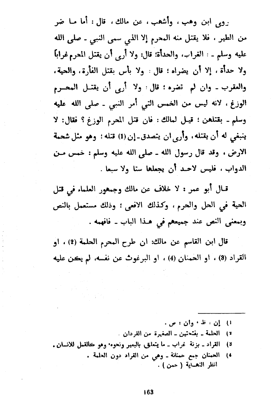 رَوَى ابْنُ وَهْبٍ وَأَشْهَبُ عَنْ مَالِكٍ قَالَ أَمَّا مَا ضَرَّ مِنَ الطَّيْرِ فَلَا يَقْتُلُ مِنْهُ الْمُحْرِمُ إِلَّا الَّذِي سَمَّى النَّبِيُّ صَلَّى اللَّهُ عَلَيْهِ وَسَلَّمَ الْغُرَابَ وَالْحِدَأَةَ قَالَ وَلَا أَرَى أَنْ يَقْتُلَ الْمُحْرِمُ غُرَابًا وَلَا حِدَأَةً إِلَّا أَنْ يَضُرَّاهُ قَالَ وَلَا بَأْسَ بِقَتْلِ الْفَأْرَةِ وَالْحَيَّةِ وَالْعَقْرَبِ وَإِنْ لَمْ تَضُرَّهُ قَالَ وَلَا أَرَى أَنْ يَقْتُلَ الْمُحْرِمُ الْوَزَغَ لِأَنَّهُ لَيْسَ مِنَ الْخَمْسِ الَّتِي أَمَرَ النَّبِيُّ صَلَّى الله عليه وسلم بقتلهن قيل لمالك فَإِنْ قَتَلَ الْمُحْرِمُ الْوَزَغَ فَقَالَ لَا يَنْبَغِي لَهُ أَنْ يَقْتُلَهُ وَأَرَى أَنْ يَتَصَدَّقَ إِنْ قَتَلَهُ وَهُوَ مِثْلُ شَحْمَةِ الْأَرْضِ وَقَدْ قَالَ رَسُولُ اللَّهِ صَلَّى اللَّهُ عَلَيْهِ وَسَلَّمَ خَمْسٌ مِنَ الدَّوَابِّ فَلَيْسَ لِأَحَدٍ أَنْ يَجْعَلَهَا سِتًّا وَلَا سَبْعًا قَالَ أَبُو عُمَرَ لَا خِلَافَ عَنْ مَالِكٍ وَجُمْهُورِ الْعُلَمَاءِ فِي قَتْلِ الْحَيَّةِ فِي الْحِلِّ وَالْحَرَمِ وَكَذَلِكَ الْأَفْعَى وَذَلِكَ مُسْتَعْمَلٌ بِالنَّصِّ وَبِمَعْنَى النَّصِّ عِنْدَ جَمِيعِهِمْ فِي هَذَا الْبَابِ فَافْهَمْهُ قَالَ ابْنُ الْقَاسِمِ عَنْ مَالِكٍ إِنْ طَرَحَ الْمُحْرِمُ الْحَلَمَةَ أَوِ الْقُرَادَ أَوِ الْحُمْنَانَ أَوِ الْبُرْغُوثَ عَنْ نَفْسِهِ لَمْ يَكُنْ عليه