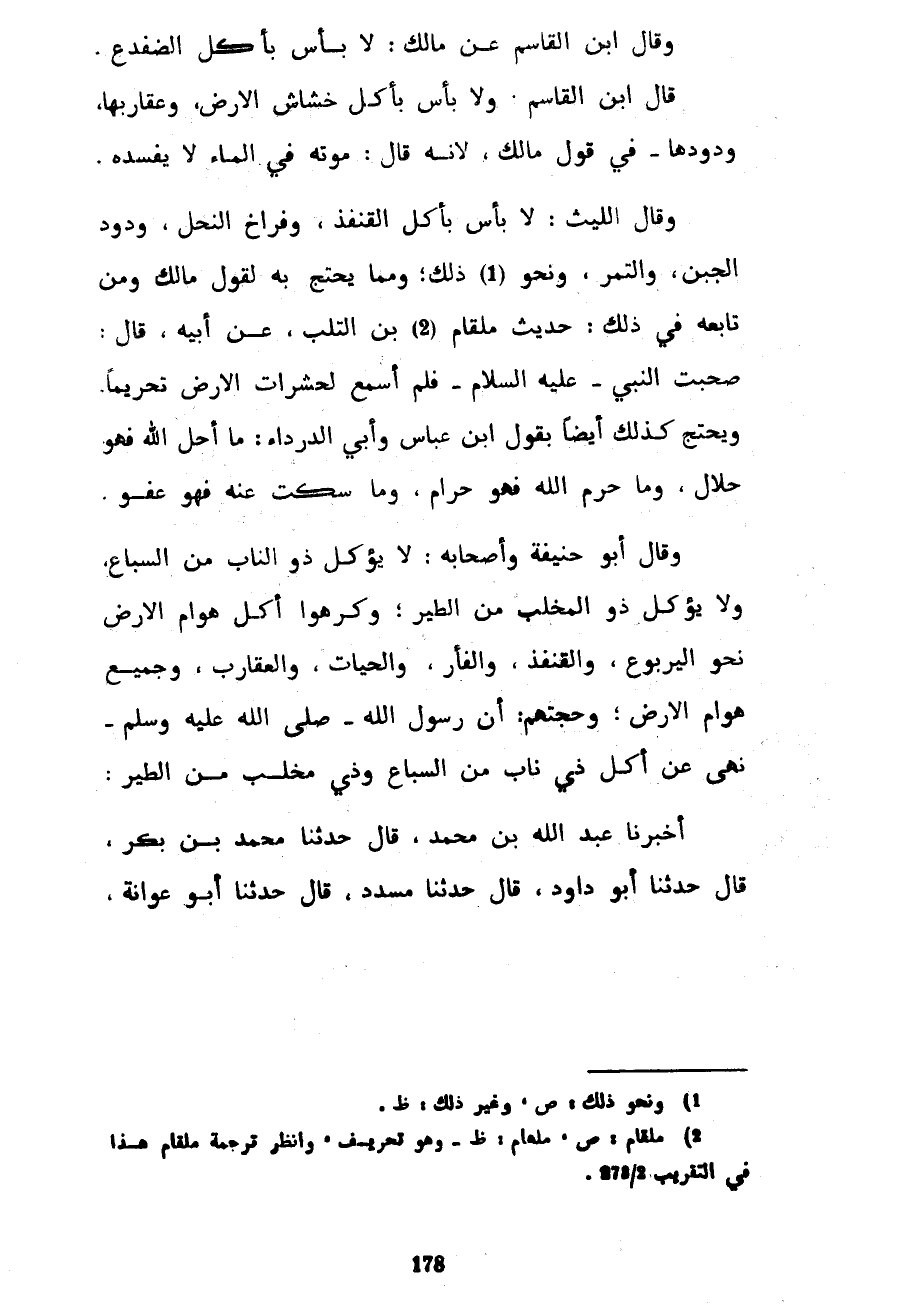 وَقَالَ ابْنُ الْقَاسِمِ عَنْ مَالِكٍ لَا بَأْسَ بِأَكْلِ الضِّفْدَعِ قَالَ ابْنُ الْقَاسِمِ وَلَا بِأْسَ بِأَكْلِ خَشَاشِ الْأَرْضِ وَعَقَارِبِهَا وَدُودِهَا فِي قَوْلِ مَالِكٍ لِأَنَّهُ قَالَ مَوْتُهُ فِي الْمَاءِ لَا يُفْسِدُهُ وَقَالَ اللَّيْثُ لَا بَأْسَ بِأَكْلِ الْقُنْفُذِ وَفِرَاخِ النَّحْلِ وَدُودِ الْجُبْنِ وَالتَّمْرِ وَنَحْوِ ذَلِكَ وَمِمَّا يُحْتَجُّ بِهِ لِقَوْلِ مَالِكٍ وَمَنْ تَابَعَهُ فِي ذَلِكَ حَدِيثُ مِلْقَامِ بْنِ التَّلِبِّ عَنْ أَبِيهِ قَالَ صَحِبْتُ النَّبِيَّ عَلَيْهِ السَّلَامُ فَلَمْ أَسْمَعْ لِحَشَرَاتِ الْأَرْضِ تَحْرِيمًا وَيُحْتَجُّ كَذَلِكَ أَيْضًا بِقَوْلِ ابْنِ عَبَّاسٍ وَأَبِي الدَّرْدَاءِ مَا أَحَلَّ اللَّهُ فَهُوَ حَلَالٌ وَمَا حَرَّمَ اللَّهُ فَهُوَ حَرَامٌ وَمَا سَكَتَ عَنْهُ فَهُوَ عَفْوٌ وَقَالَ أَبُو حَنِيفَةَ وَأَصْحَابُهُ لَا يُؤْكَلُ ذُو النَّابِ مِنَ السِّبَاعِ وَلَا يُؤْكَلُ ذُو الْمِخْلَبِ مِنَ الطَّيْرِ وَكَرِهُوا أَكْلَ هَوَامِّ الْأَرْضِ نَحْوِ الْيَرْبُوعِ والقنفذ والفأر والحيات والعقارب وَجَمِيعِ هَوَامِّ الْأَرْضِ وَحُجَّتُهُمْ أَنَّ رَسُولَ اللَّهِ صَلَّى اللَّهُ عَلَيْهِ وَسَلَّمَ نَهَى عَنْ أَكْلِ ذِي نَابٍ مِنَ السِّبَاعِ وَذِي مِخْلَبٍ مِنَ الطَّيْرِ أَخْبَرَنَا عَبْدُ اللَّهِ بْنُ مُحَمَّدٍ قَالَ حَدَّثَنَا مُحَمَّدُ بْنُ بَكْرٍ قَالَ حَدَّثَنَا أَبُو دَاوُدَ قَالَ حَدَّثَنَا مُسَدَّدٌ قَالَ حَدَّثَنَا أَبُو عَوَانَةَ