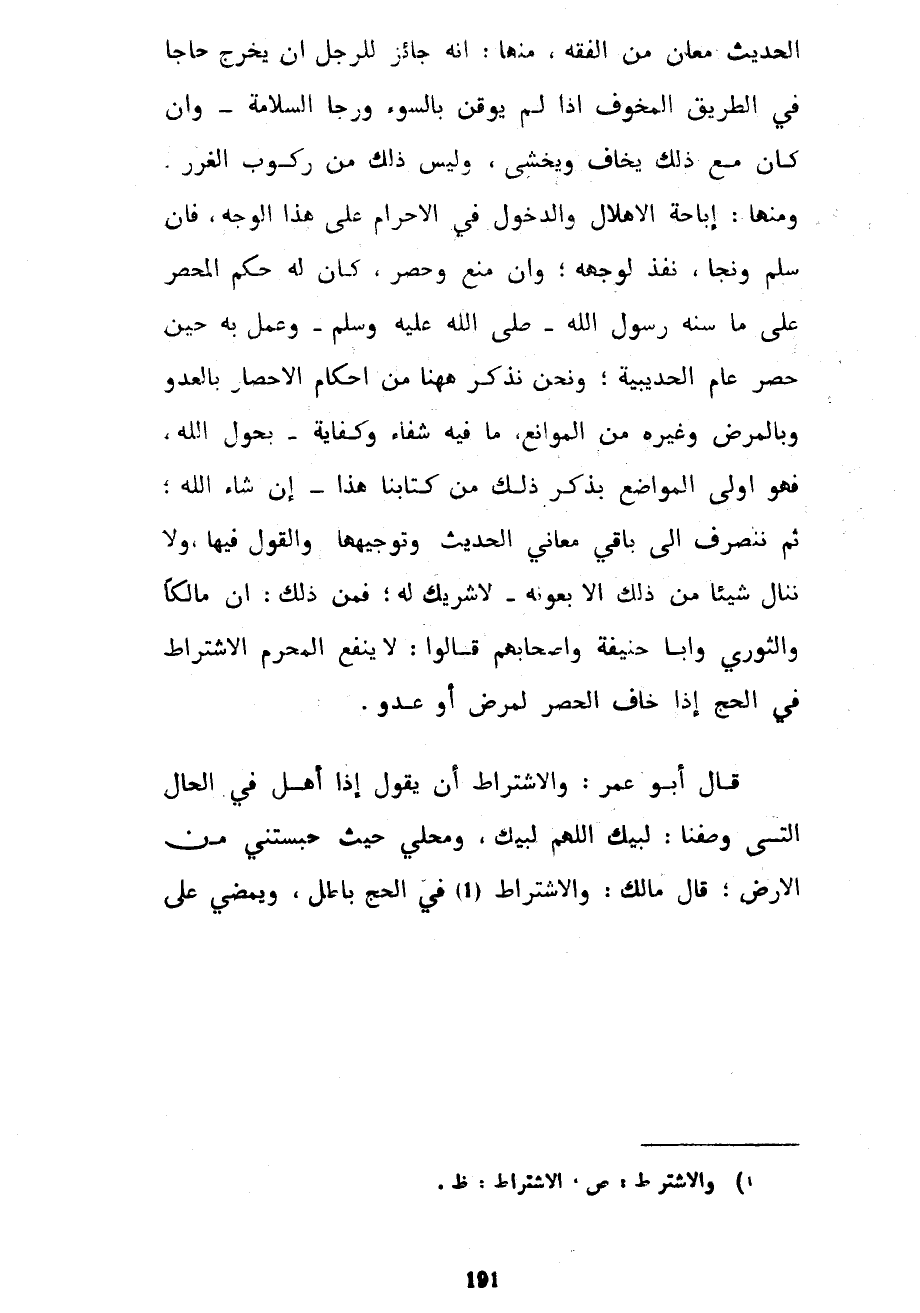 الْحَدِيثِ مَعَانٍ مِنَ الْفِقْهِ مِنْهَا أَنَّهُ جَائِزٌ لِلرَّجُلِ أَنْ يَخْرُجَ حَاجًّا فِي الطَّرِيقِ الْمَخُوفِ إِذَا لَمْ يُوقِنْ بِالسُّوءِ وَرَجَا السَّلَامَةَ وَإِنْ كَانَ مَعَ ذَلِكَ يَخَافُ وَيَخْشَى وَلَيْسَ ذَلِكَ مِنْ رُكُوبِ الْغَرَرِ وَمِنْهَا إِبَاحَةُ الْإِهْلَالِ وَالدُّخُولِ فِي الْإِحْرَامِ عَلَى هَذَا الْوَجْهِ فَإِنْ سَلِمَ وَنَجَا نَفَذَ لِوَجْهِهِ وَإِنْ مُنِعَ وَحُصِرَ كَانَ لَهُ حُكْمُ الْمُحْصَرِ عَلَى مَا سُنَّةُ رَسُولِ اللَّهِ صَلَّى اللَّهُ عَلَيْهِ وَسَلَّمَ وَعَمِلَ بِهِ حين حصر عام الحديبية ونحن نذكر ههنا مِنْ أَحْكَامِ الْإِحْصَارِ بِالْعَدُوِّ وَبِالْمَرَضِ وَغَيْرِهِ مِنَ الْمَوَانِعِ مَا فِيهِ شِفَاءٌ وَكِفَايَةٌ بِحَوْلِ اللَّهِ فَهُوَ أَوْلَى الْمَوَاضِعِ بِذِكْرِ ذَلِكَ مِنْ كِتَابِنَا هَذَا إِنْ شَاءَ اللَّهُ ثُمَّ نَنْصَرِفُ إِلَى بَاقِي مَعَانِي الْحَدِيثِ وَتَوْجِيهِهَا وَالْقَوْلِ فِيهَا وَلَا نَنَالُ شَيْئًا مِنْ ذَلِكَ إِلَّا بِعَوْنِهِ لَا شَرِيكَ لَهُ فَمِنْ ذَلِكَ أَنَّ مَالِكًا وَالثَّوْرِيَّ وَأَبَا حَنِيفَةَ وَأَصْحَابَهُمْ قَالُوا لَا يَنْفَعُ الْمُحْرِمَ الِاشْتِرَاطُ فِي الْحَجِّ إِذَا خَافَ الْحَصْرَ لِمَرَضٍ أَوْ عَدُوٍّ قَالَ أَبُو عُمَرَ وَالِاشْتِرَاطُ أَنْ يَقُولَ إِذَا أَهَلَّ فِي الْحَالِ الَّتِي وَصَفْنَا لَبَّيْكَ اللَّهُمَّ لَبَّيْكَ وَمَحِلِّي حَيْثُ حَبَسْتَنِي مِنَ الْأَرْضِ قَالَ مَالِكٌ وَالِاشْتِرَاطُ فِي الْحَجِّ بَاطِلٌ ويمضي على
