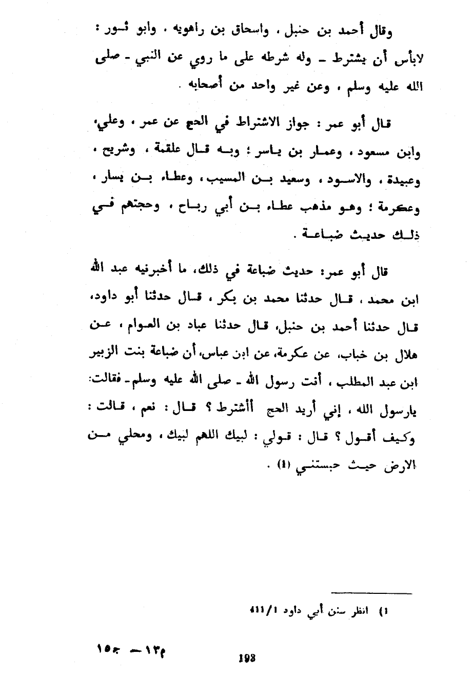 وَقَالَ أَحْمَدُ بْنُ حَنْبَلٍ وَإِسْحَاقُ بْنُ رَاهَوَيْهِ وَأَبُو ثَوْرٍ لَا بَأْسَ أَنْ يَشْتَرِطَ وَلَهُ شَرْطُهُ عَلَى مَا رُوِيَ عَنِ النَّبِيِّ صَلَّى اللَّهُ عَلَيْهِ وَسَلَّمَ وَعَنْ غَيْرِ وَاحِدٍ مِنْ أَصْحَابِهِ قَالَ أَبُو عُمَرَ جَوَازُ الِاشْتِرَاطِ فِي الْحَجِّ عَنْ عُمَرَ وَعَلِيٍّ وَابْنِ مَسْعُودٍ وَعَمَّارِ بْنِ يَاسِرٍ وَبِهِ قَالَ عَلْقَمَةُ وَشُرَيْحٌ وَعُبَيْدَةُ وَالْأَسْوَدُ وَسَعِيدُ بْنُ الْمُسَيَّبِ وَعَطَاءُ بْنُ يَسَارٍ وَعِكْرِمَةُ وَهُوَ مَذْهَبُ عَطَاءِ بْنِ أَبِي رَبَاحٍ وَحُجَّتُهُمْ فِي ذَلِكَ حَدِيثُ ضُبَاعَةَ قَالَ أَبُو عُمَرَ حَدِيثُ ضُبَاعَةَ فِي ذَلِكَ مَا أَخْبَرَنِيهِ عَبْدُ اللَّهِ بْنُ مُحَمَّدٍ قَالَ حَدَّثَنَا مُحَمَّدُ بْنُ بَكْرٍ قَالَ حَدَّثَنَا أَبُو دَاوُدَ قَالَ حَدَّثَنَا أَحْمَدُ بْنُ حَنْبَلٍ قَالَ حَدَّثَنَا عَبَّادُ بْنُ الْعَوَّامِ عَنْ هِلَالِ بْنِ خَبَّابٍ عَنْ عِكْرِمَةَ عَنِ ابْنِ عَبَّاسٍ أَنَّ ضُبَاعَةَ بِنْتَ الزُّبَيْرِ بْنِ عَبْدِ الْمُطَّلِبِ أَتَتْ رَسُولَ اللَّهِ صَلَّى اللَّهُ عَلَيْهِ وَسَلَّمَ فَقَالَتْ يَا رَسُولَ اللَّهِ إِنِّي أُرِيدُ الْحَجَّ أَأَشْتَرِطُ قَالَ نَعَمْ قَالَتْ وَكَيْفَ أَقُولُ قَالَ قُولِي لَبَّيْكَ اللَّهُمَّ لَبَّيْكَ وَمَحِلِّي مِنَ الْأَرْضِ حَيْثُ حَبَسْتَنِي