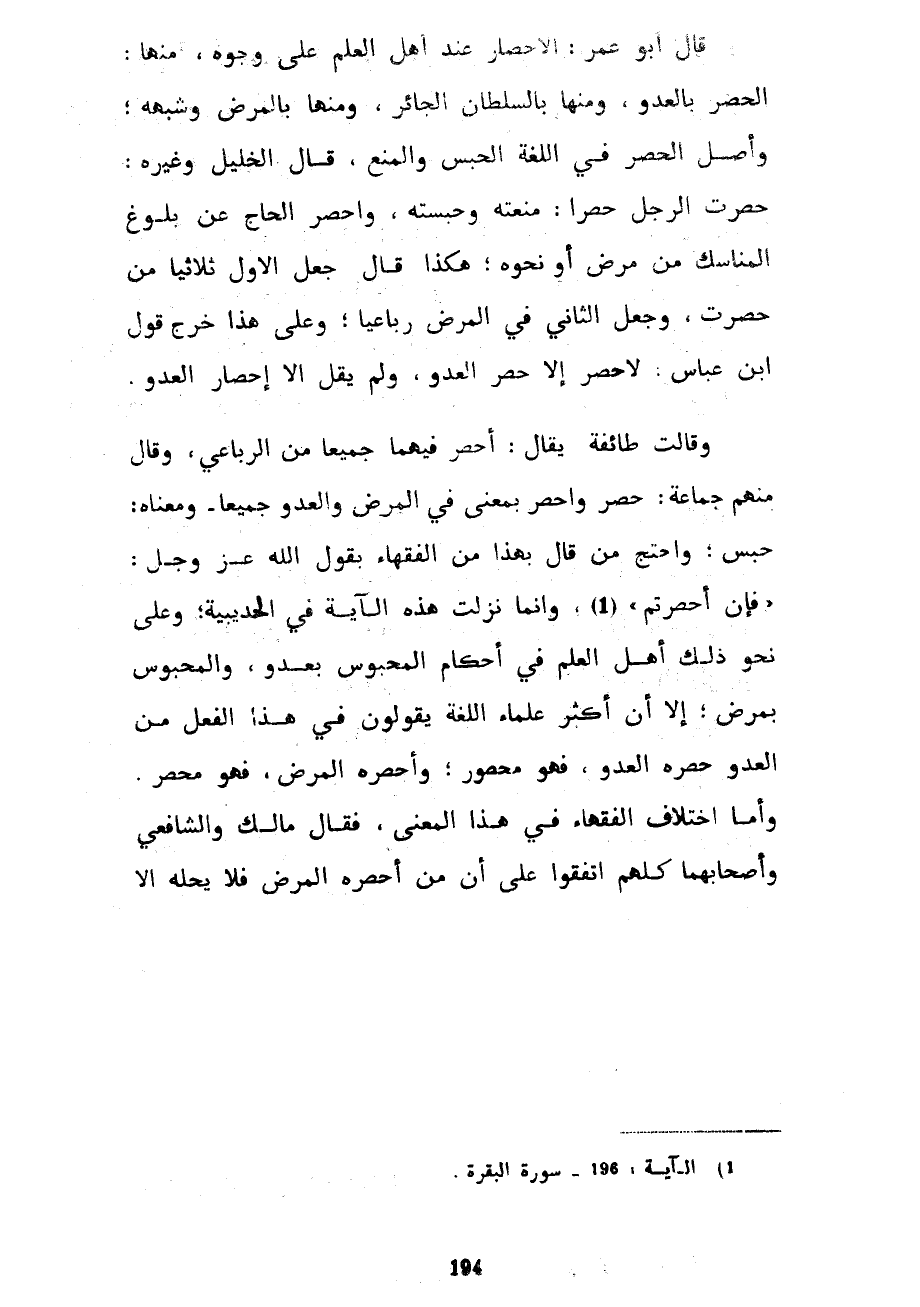 قَالَ أَبُو عُمَرَ الْإِحْصَارُ عِنْدَ أَهْلِ الْعِلْمِ عَلَى وُجُوهٍ مِنْهَا الْحَصْرُ بِالْعَدُوِّ وَمِنْهَا بِالسُّلْطَانِ الْجَائِرِ وَمِنْهَا بِالْمَرَضِ وَشِبْهِهِ وَأَصْلُ الْحَصْرِ فِي اللُّغَةِ الْحَبْسُ وَالْمَنْعُ قَالَ الْخَلِيلُ وَغَيْرُهُ حَصَرْتُ الرَّجُلَ حَصْرًا مَنَعْتُهُ وَحَبَسْتُهُ وَأُحْصِرَ الْحَاجُّ عَنْ بُلُوغِ الْمَنَاسِكِ مِنْ مَرَضٍ أَوْ نَحْوِهِ هَكَذَا قَالَ جَعَلَ الْأَوَّلَ ثُلَاثِيًّا مِنْ حَصَرْتُ وَجَعَلَ الثَّانِي فِي الْمَرَضِ رُبَاعِيًّا وَعَلَى هَذَا خَرَجَ قَوْلُ ابْنِ عَبَّاسٍ لَا حَصْرَ إِلَّا حَصْرَ الْعَدُوِّ وَلَمْ يَقُلْ إِلَّا إِحْصَارَ الْعَدُوِّ وَقَالَتْ طَائِفَةٌ يُقَالُ أُحْصِرَ فِيهِمَا جَمِيعًا مِنَ الرُّبَاعِيِّ وَقَالَ مِنْهُمْ جَمَاعَةٌ حُصِرَ وَأُحْصِرَ بِمَعْنًى فِي الْمَرَضِ وَالْعَدُوِّ جَمِيعًا وَمَعْنَاهُ حُبِسَ وَاحْتَجَّ مَنْ قَالَ بِهَذَا مِنَ الْفُقَهَاءِ بِقَوْلِ اللَّهِ عَزَّ وَجَلَّ فَإِنْ أُحْصِرْتُمْ وَإِنَّمَا نَزَلَتْ هَذِهِ الْآيَةُ فِي الْحُدَيْبِيَةِ وَعَلَى نَحْوِ ذَلِكَ أَهْلُ الْعِلْمِ فِي أَحْكَامِ الْمَحْبُوسِ بِعَدُوٍّ وَالْمَحْبُوسِ بِمَرَضٍ إِلَّا أَنَّ أَكْثَرَ عُلَمَاءِ اللُّغَةِ يَقُولُونَ فِي هَذَا الْفِعْلِ مِنَ الْعَدُوِّ حَصَرَهُ الْعَدُوُّ فَهُوَ مَحْصُورٌ وَأَحْصَرَهُ الْمَرَضُ فَهُوَ مُحْصَرٌ وَأَمَّا اخْتِلَافُ الْفُقَهَاءِ فِي هَذَا الْمَعْنَى فَقَالَ مَالِكٌ وَالشَّافِعِيُّ وَأَصْحَابُهُمَا كُلُّهُمُ اتَّفَقُوا عَلَى أَنَّ مَنْ أَحْصَرَهُ الْمَرَضُ فَلَا يُحِلُّهُ إِلَّا