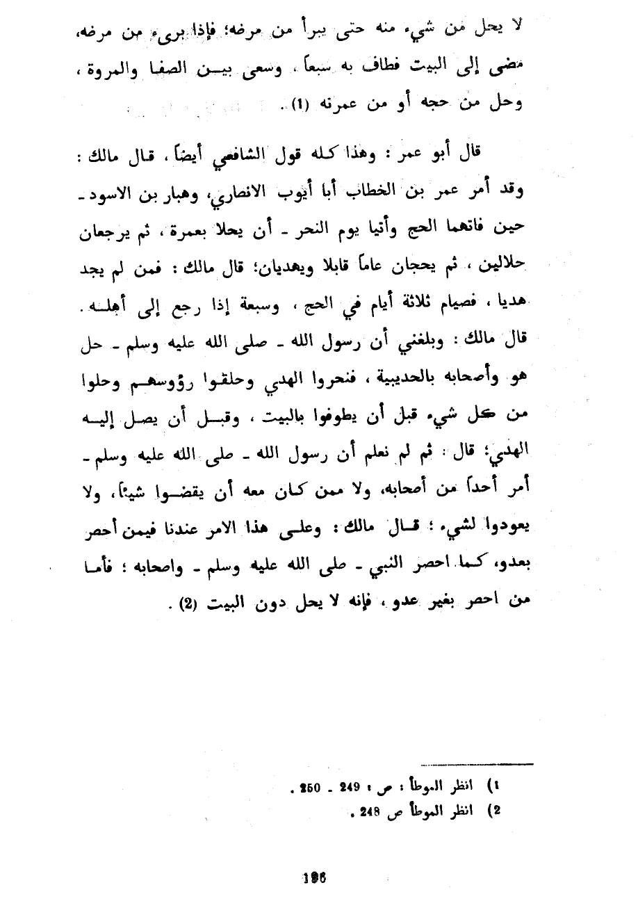 لَا يَحِلُّ مِنْ شَيْءٍ مِنْهُ حَتَّى يَبْرَأَ مِنْ مَرَضِهِ فَإِذَا بَرِئَ مِنْ مَرَضِهِ مَضَى إِلَى الْبَيْتِ فَطَافَ بِهِ سَبْعًا وَسَعَى بَيْنَ الصَّفَا وَالْمَرْوَةِ وَحَلَّ مِنْ حَجِّهِ أَوْ مِنْ عُمْرَتِهِ قَالَ أَبُو عُمَرَ وَهَذَا كُلُّهُ قَوْلُ الشَّافِعِيِّ أَيْضًا قَالَ مَالِكٌ وَقَدْ أَمَرَ عُمَرُ بْنُ الْخَطَّابِ أَبَا أَيُّوبَ الْأَنْصَارِيَّ وَهَبَّارَ بْنَ الْأَسْوَدِ حِينَ فَاتَهُمَا الْحَجُّ وَأَتَيَا يَوْمَ النَّحْرِ أَنْ يَحِلَّا بِعُمْرَةٍ ثُمَّ يَرْجِعَانِ حَلَالَيْنِ ثُمَّ يحجان عاما قابلا ويهديان قال مَالِكٌ فَمَنْ لَمْ يَجِدْ هَدْيًا فَصِيَامُ ثَلَاثَةَ أَيَّامٍ فِي الْحَجِّ وَسَبْعَةً إِذَا رَجَعَ إِلَى أَهْلِهِ قَالَ مَالِكٌ وَبَلَغَنِي أَنَّ رَسُولَ اللَّهِ صَلَّى اللَّهُ عَلَيْهِ وَسَلَّمَ حَلَّ هُوَ وَأَصْحَابُهُ بالحديبية فنحروا الهدي وحلقوا رؤوسهم وَحَلُّوا مِنْ كُلِّ شَيْءٍ قَبْلَ أَنْ يَطُوفُوا بِالْبَيْتِ وَقَبْلَ أَنْ يَصِلَ إِلَيْهِ الْهَدْيُ قَالَ ثُمَّ لَمْ نَعْلَمْ أَنَّ رَسُولَ اللَّهِ صَلَّى اللَّهُ عَلَيْهِ وَسَلَّمَ أَمَرَ أَحَدًا مِنْ أَصْحَابِهِ وَلَا مِمَّنْ كَانَ مَعَهُ أَنْ يَقْضُوا شَيْئًا وَلَا يَعُودُوا لِشَيْءٍ قَالَ مَالِكٌ وَعَلَى هَذَا الْأَمْرِ عِنْدَنَا فِيمَنْ أُحْصِرَ بِعَدُوٍّ كَمَا أُحْصِرَ النَّبِيُّ صَلَّى اللَّهُ عَلَيْهِ وَسَلَّمَ وَأَصْحَابُهُ فَأَمَّا مَنْ أُحْصِرَ بِغَيْرِ عَدُوٍّ فَإِنَّهُ لَا يَحِلُّ دون البيت