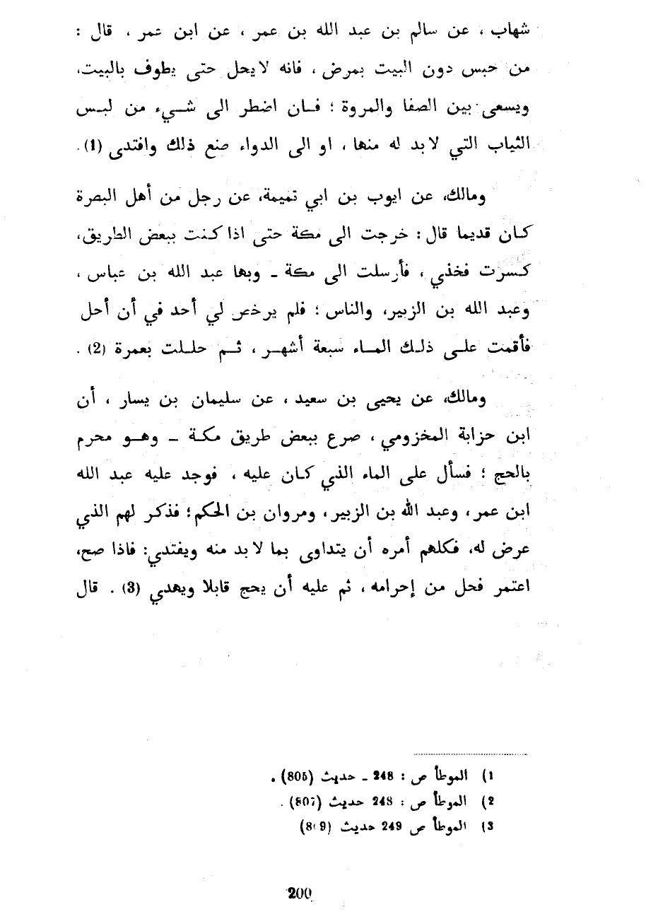 شِهَابٍ عَنْ سَالِمِ بْنِ عَبْدِ اللَّهِ بْنِ عُمَرَ عَنِ ابْنِ عُمَرَ قَالَ مَنْ حُبِسَ دُونَ الْبَيْتِ بِمَرَضٍ فَإِنَّهُ لَا يَحِلُّ حَتَّى يَطُوفَ بِالْبَيْتِ وَيَسْعَى بَيْنَ الصَّفَا وَالْمَرْوَةِ فَإِنِ اضْطُرَّ إِلَى شَيْءٍ مِنْ لُبْسِ الثِّيَابِ الَّتِي لا بد لَهُ مِنْهَا أَوْ إِلَى الدَّوَاءِ صَنَعَ ذَلِكَ وَافْتَدَى وَمَالِكٌ عَنْ أَيُّوبَ بْنِ أَبِي تَمِيمَةَ عَنْ رَجُلٍ مِنْ أَهْلِ الْبَصْرَةِ كَانَ قَدِيمًا قَالَ خَرَجْتُ إِلَى مَكَّةَ حَتَّى إِذَا كُنْتُ بِبَعْضِ الطَّرِيقِ كُسِرَتْ فَخِذِي فَأَرْسَلْتُ إِلَى مَكَّةَ وَبِهَا عَبْدُ اللَّهِ بْنُ عَبَّاسٍ وَعَبْدُ اللَّهِ بْنُ الزُّبَيْرِ وَالنَّاسُ فَلَمْ يُرَخِّصْ لِي أَحَدٌ فِي أَنْ أَحِلَّ فَأَقَمْتُ عَلَى ذَلِكَ الْمَاءِ سَبْعَةَ أَشْهُرٍ ثُمَّ حَلَلْتُ بِعُمْرَةٍ وَمَالِكٌ عَنْ يَحْيَى بْنِ سَعِيدٍ عَنْ سُلَيْمَانَ بْنِ يَسَارٍ أَنَّ ابْنَ حُزَابَةَ الْمَخْزُومِيَّ صُرِعَ بِبَعْضِ طَرِيقِ مَكَّةَ وَهُوَ مُحْرِمٌ بِالْحَجِّ فَسَأَلَ عَلَى الْمَاءِ الَّذِي كَانَ عَلَيْهِ فَوُجِدَ عَلَيْهِ عَبْدُ اللَّهِ بْنُ عُمَرَ وَعَبْدُ اللَّهِ بْنُ الزُّبَيْرِ وَمَرْوَانُ بْنُ الْحَكَمِ فَذُكِرَ لَهُمُ الَّذِي عَرَضَ لَهُ فكلهم أمره أن يتداوى بما لا بد مِنْهُ وَيَفْتَدِيَ فَإِذَا صَحَّ اعْتَمَرَ فَحَلَّ مِنْ إِحْرَامِهِ ثُمَّ عَلَيْهِ أَنْ يَحُجَّ قَابِلًا وَيَهْدِيَ قال