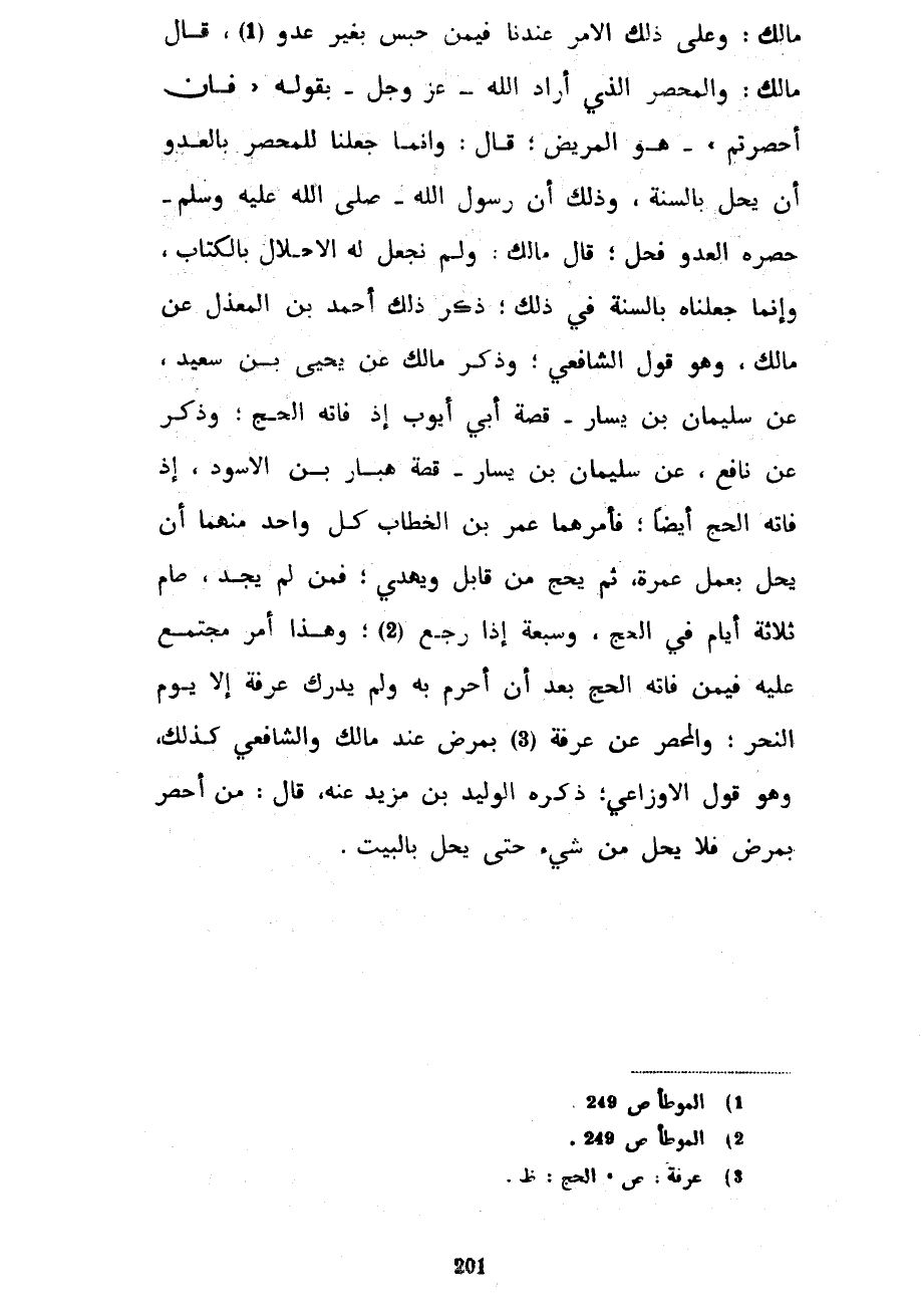 مَالِكٌ وَعَلَى ذَلِكَ الْأَمْرِ عِنْدَنَا فِيمَنْ حُبِسَ بِغَيْرِ عَدُوٍّ قَالَ مَالِكٌ وَالْمُحْصَرُ الَّذِي أَرَادَ اللَّهُ عَزَّ وَجَلَّ بِقَوْلِهِ فَإِنْ أُحْصِرْتُمْ هُوَ الْمَرِيضُ قَالَ وَإِنَّمَا جَعَلْنَا لِلْمُحْصَرِ بِالْعَدُوِّ أَنْ يَحِلَّ بِالسُّنَّةِ وَذَلِكَ أَنَّ رَسُولَ اللَّهِ صَلَّى اللَّهُ عَلَيْهِ وَسَلَّمَ حَصَرَهُ الْعَدُوُّ فَحَلَّ قَالَ مَالِكٌ وَلَمْ نَجْعَلْ لَهُ الْإِحْلَالَ بِالْكِتَابِ وَإِنَّمَا جَعَلْنَاهُ بِالسُّنَّةِ فِي ذَلِكَ ذَكَرَ ذَلِكَ أَحْمَدُ بْنُ الْمُعَذَّلِ عَنْ مَالِكٍ وَهُوَ قَوْلُ الشَّافِعِيِّ وَذَكَرَ مَالِكٌ عَنْ يَحْيَى بْنِ سَعِيدٍ عَنْ سُلَيْمَانَ بْنِ يَسَارٍ قِصَّةَ أَبِي أَيُّوبَ إِذْ فَاتَهُ الْحَجُّ وَذَكَرَ عَنْ نَافِعٍ عَنْ سُلَيْمَانَ بْنِ يَسَارٍ قِصَّةَ هَبَّارِ بْنِ الْأَسْوَدِ إِذْ فَاتَهُ الْحَجُّ أَيْضًا فَأَمَرَهُمَا عُمَرُ بْنُ الْخَطَّابِ كُلَّ وَاحِدٍ مِنْهُمَا أَنْ يَحِلَّ بِعَمَلِ عُمْرَةٍ ثُمَّ يَحُجَّ مِنْ قَابِلٍ وَيَهْدِيَ فَمَنْ لَمْ يَجِدْ صَامَ ثَلَاثَةَ أَيَّامٍ فِي الْحَجِّ وَسَبْعَةً إِذَا رَجَعَ وَهَذَا أَمْرٌ مُجْتَمَعٌ عَلَيْهِ فِيمَنْ فَاتَهُ الْحَجُّ بَعْدَ أَنْ أَحْرَمَ بِهِ وَلَمْ يُدْرِكْ عَرَفَةَ إِلَّا يَوْمَ النَّحْرِ وَالْمُحْصَرُ عَنْ عَرَفَةَ بِمَرَضٍ عِنْدَ مَالِكٍ وَالشَّافِعِيِّ كَذَلِكَ وَهُوَ قَوْلُ الْأَوْزَاعِيِّ ذَكَرَهُ الْوَلِيدُ بْنُ مَزْيَدٍ عَنْهُ قَالَ مَنْ أُحْصِرَ بِمَرَضٍ فَلَا يَحِلُّ مِنْ شَيْءٍ حَتَّى يَحِلَّ بِالْبَيْتِ