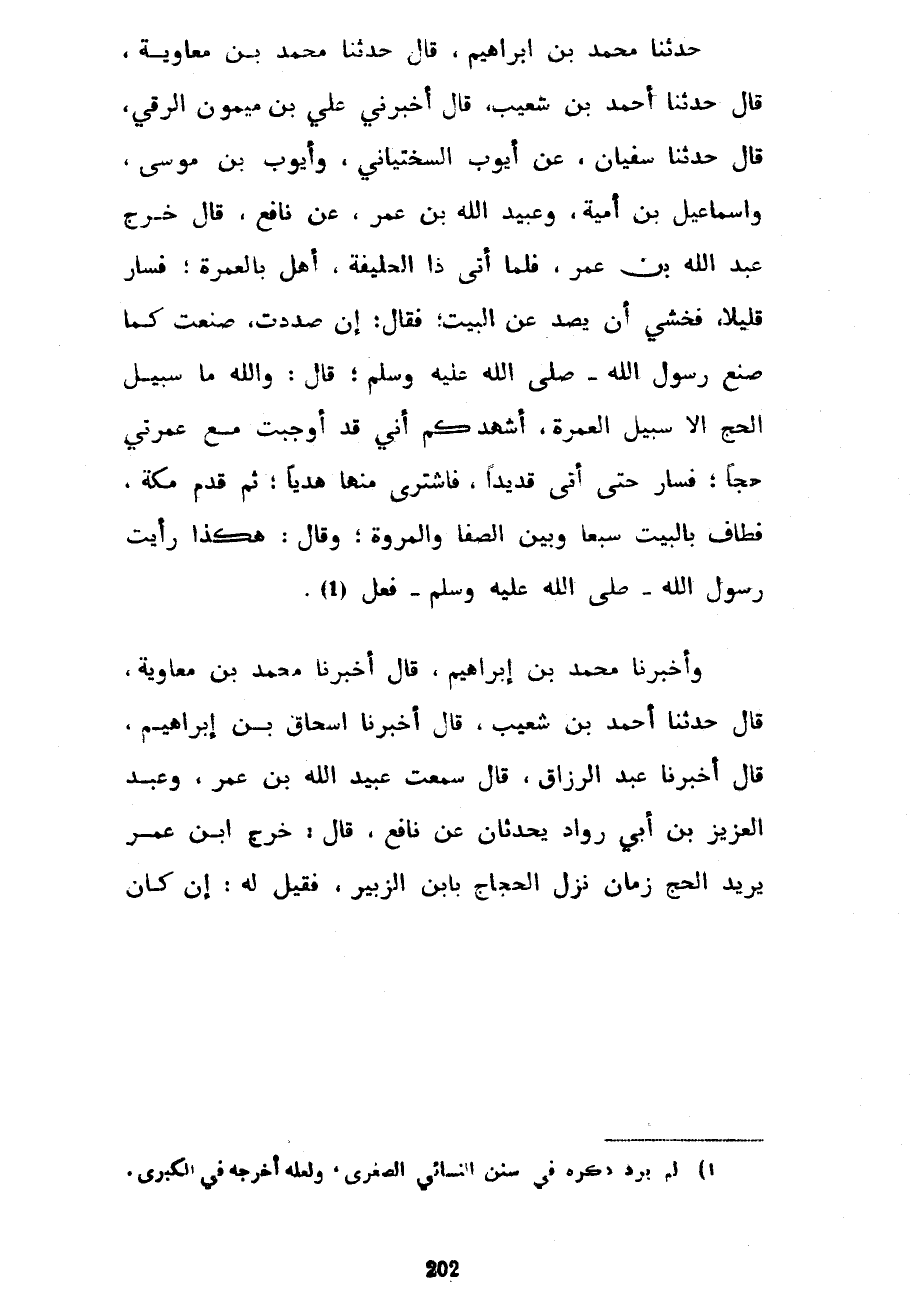 حَدَّثَنَا مُحَمَّدُ بْنُ إِبْرَاهِيمَ قَالَ حَدَّثَنَا مُحَمَّدُ بْنُ مُعَاوِيَةَ قَالَ حَدَّثَنَا أَحْمَدُ بْنُ شُعَيْبٍ قَالَ أَخْبَرَنِي عَلِيُّ بْنُ مَيْمُونٍ الرَّقِيُّ قَالَ حَدَّثَنَا سُفْيَانُ عَنْ أَيُّوبَ السَّخْتِيَانِيِّ وَأَيُّوبَ بْنِ مُوسَى وَإِسْمَاعِيلَ بْنِ أُمَيَّةَ وَعُبَيْدِ اللَّهِ بْنُ عُمَرَ عَنْ نَافِعٍ قَالَ خَرَجَ عَبْدُ اللَّهِ بن عمر فلما أتى ذا الحليفة أهل بالعمرة فَسَارَ قَلِيلًا فَخَشِيَ أَنْ يُصَدَّ عَنِ الْبَيْتِ فَقَالَ إِنْ صُدِدْتُ صَنَعْتُ كَمَا صَنَعَ رَسُولُ اللَّهِ صَلَّى اللَّهُ عَلَيْهِ وَسَلَّمَ قَالَ وَاللَّهِ مَا سَبِيلُ الْحَجِّ إِلَّا سَبِيلَ الْعُمْرَةِ أُشْهِدُكُمْ أَنِّي قَدْ أَوْجَبْتُ مَعَ عُمْرَتِي حَجًّا فَسَارَ حَتَّى أَتَى قَدِيدًا فَاشْتَرَى مِنْهَا هَدْيًا ثُمَّ قَدِمَ مَكَّةَ فَطَافَ بِالْبَيْتِ سَبْعًا وَبَيْنَ الصَّفَا وَالْمَرْوَةِ وَقَالَ هَكَذَا رَأَيْتُ رَسُولَ اللَّهِ صَلَّى اللَّهُ عَلَيْهِ وَسَلَّمَ فَعَلَ وَأَخْبَرَنَا مُحَمَّدُ بْنُ إِبْرَاهِيمَ قَالَ أَخْبَرَنَا مُحَمَّدُ بْنُ مُعَاوِيَةَ قَالَ حَدَّثَنَا أَحْمَدُ بْنُ شُعَيْبٍ قَالَ أَخْبَرَنَا إِسْحَاقُ بْنُ إِبْرَاهِيمَ قَالَ أَخْبَرَنَا عَبْدُ الرَّزَّاقِ قَالَ سَمِعْتُ عُبَيْدَ اللَّهِ بْنَ عُمَرَ وَعَبْدَ الْعَزِيزِ بْنَ أَبِي رَوَّادٍ يُحَدِّثَانِ عَنْ نَافِعٍ قَالَ خَرَجَ ابْنُ عُمَرَ يُرِيدُ الْحَجَّ زَمَانَ نَزَلَ الْحُجَّاجُ بِابْنِ الزُّبَيْرِ فَقِيلَ لَهُ إِنْ كَانَ