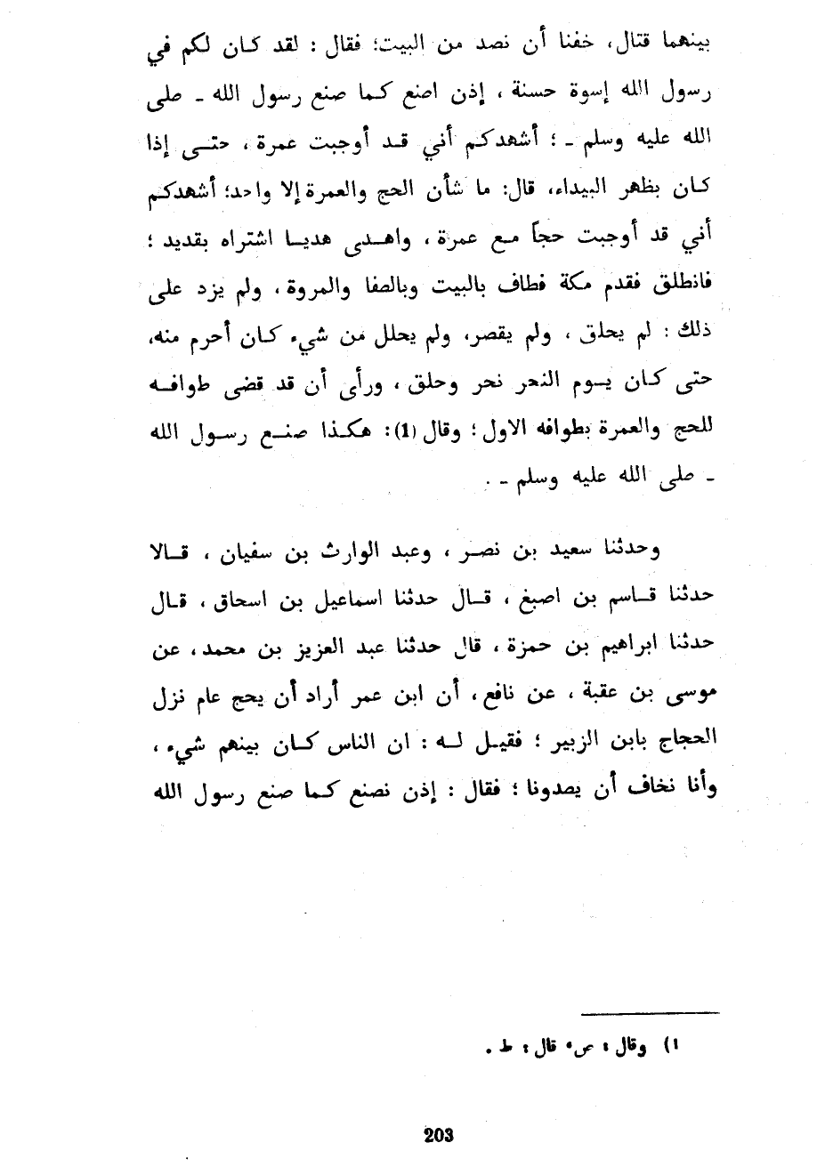 بَيْنَهُمَا قِتَالٌ خِفْنَا أَنْ نُصَدَّ عَنِ الْبَيْتِ فَقَالَ لَقَدْ كَانَ لَكُمْ فِي رَسُولِ اللَّهِ أُسْوَةٌ حَسَنَةٌ إِذَنْ أَصْنَعَ كَمَا صَنَعَ رَسُولُ اللَّهِ صَلَّى اللَّهُ عَلَيْهِ وَسَلَّمَ أُشْهِدُكُمْ أَنِّي قَدْ أَوْجَبْتُ عُمْرَةً حَتَّى إِذَا كَانَ بِظَهْرِ الْبَيْدَاءِ قَالَ مَا شَأْنُ الْحَجِّ وَالْعُمْرَةِ إِلَّا وَاحِدٌ أُشْهِدُكُمْ أَنِّي قَدْ أَوْجَبْتُ حَجًّا مَعَ عُمْرَةٍ وَأَهْدَى هَدْيًا اشْتَرَاهُ بِقَدِيدٍ فَانْطَلَقَ فَقَدِمَ مَكَّةَ فَطَافَ بِالْبَيْتِ وَبِالصَّفَا وَالْمَرْوَةِ وَلَمْ يَزِدْ عَلَى ذَلِكَ لَمْ يَحْلِقْ وَلَمْ يُقَصِّرْ وَلَمْ يَحْلِلْ مِنْ شَيْءٍ كَانَ أَحْرَمَ مِنْهُ حَتَّى كَانَ يَوْمُ النَّحْرِ نَحَرَ وَحَلَقَ وَرَأَى أَنْ قَدْ قَضَى طَوَافَهُ لِلْحَجِّ وَالْعُمْرَةِ بِطَوَافِهِ الْأَوَّلِ وَقَالَ هَكَذَا صَنَعَ رَسُولُ اللَّهِ صَلَّى اللَّهُ عَلَيْهِ وَسَلَّمَ وَحَدَّثَنَا سَعِيدُ بْنُ نَصْرٍ وَعَبْدُ الْوَارِثِ بْنُ سُفْيَانَ قَالَا حَدَّثَنَا قَاسِمُ بْنُ أَصْبَغَ قَالَ حَدَّثَنَا إِسْمَاعِيلُ بْنُ إِسْحَاقَ قَالَ حَدَّثَنَا إِبْرَاهِيمُ بْنُ حَمْزَةَ قَالَ حَدَّثَنَا عَبْدُ الْعَزِيزِ بْنُ مُحَمَّدٍ عَنْ مُوسَى بْنِ عُقْبَةَ عَنْ نَافِعٍ أَنَّ ابْنَ عُمَرَ أَرَادَ أَنْ يَحُجَّ عَامَ نَزَلَ الْحُجَّاجُ بِابْنِ الزُّبَيْرِ فَقِيلَ لَهُ إِنَّ النَّاسَ كَانَ بَيْنَهُمْ شَيْءٌ وَإِنَّا نَخَافُ أَنْ يَصُدُّونَا فَقَالَ إِذَنْ نَصْنَعُ كَمَا صَنَعَ رَسُولُ اللَّهِ