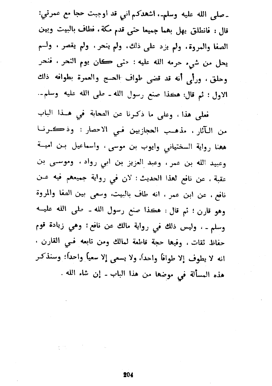صَلَّى اللَّهُ عَلَيْهِ وَسَلَّمَ أُشْهِدُكُمْ أَنِّي قَدْ أَوْجَبْتُ حَجًّا مَعَ عُمْرَتِي قَالَ فَانْطَلَقَ يُهِلُّ بِهِمَا جَمِيعًا حَتَّى قَدِمَ مَكَّةَ فَطَافَ بِالْبَيْتِ وَبَيْنَ الصَّفَا وَالْمَرْوَةِ وَلَمْ يَزِدْ عَلَى ذَلِكَ وَلَمْ يَنْحَرْ وَلَمْ يُقَصِّرْ وَلَمْ يَحِلَّ مِنْ شَيْءٍ حَرَّمَهُ اللَّهُ عَلَيْهِ حَتَّى كَانَ يَوْمُ النَّحْرِ فَنَحَرَ وَحَلَقَ وَرَأَى أَنَّهُ قَدْ قَضَى طَوَافَ الْحَجِّ وَالْعُمْرَةِ بِطَوَافِهِ ذَلِكَ الْأَوَّلِ ثُمَّ قَالَ هَكَذَا صَنَعَ رَسُولُ اللَّهِ صَلَّى اللَّهُ عَلَيْهِ وَسَلَّمَ فَعَلَى هَذَا وَعَلَى مَا ذَكَرْنَا عَنِ الصَّحَابَةِ فِي هَذَا الْبَابِ مِنَ الْآثَارِ مذهب الحجازيين في الإحصار وذكرنا ههنا رِوَايَةَ السَّخْتِيَانِيِّ وَأَيُّوبَ بْنِ مُوسَى وَإِسْمَاعِيلَ بْنِ أُمَيَّةَ وَعُبَيْدِ اللَّهِ بْنِ عُمَرَ وَعَبْدِ الْعَزِيزِ بْنِ أَبِي رَوَّادٍ وَمُوسَى بْنِ عُقْبَةَ عَنْ نَافِعٍ لِهَذَا الْحَدِيثِ لِأَنَّ فِي رِوَايَةِ جَمِيعِهِمْ فِيهِ عَنْ نَافِعٍ عَنِ ابْنِ عُمَرَ أَنَّهُ طَافَ بِالْبَيْتِ وَسَعَى بَيْنَ الصَّفَا وَالْمَرْوَةِ وَهُوَ قَارِنٌ ثُمَّ قَالَ هَكَذَا صَنَعَ رَسُولُ اللَّهِ صَلَّى اللَّهُ عَلَيْهِ وَسَلَّمَ وَلَيْسَ ذَلِكَ فِي رِوَايَةِ مَالِكٍ عَنْ نَافِعٍ وَهِيَ زِيَادَةُ قَوْمٍ حفاظ ثقات وفيها حجة قاطعة لمالك وَمَنْ تَابَعَهُ فِي الْقَارِنِ أَنَّهُ لَا يَطُوفُ إِلَّا طَوَافًا وَاحِدًا وَلَا يَسْعَى إِلَّا سَعْيًا وَاحِدًا وَسَنَذْكُرُ هَذِهِ الْمَسْأَلَةَ فِي مَوْضِعِهَا مِنْ هَذَا الْبَابِ إِنْ شَاءَ اللَّهُ