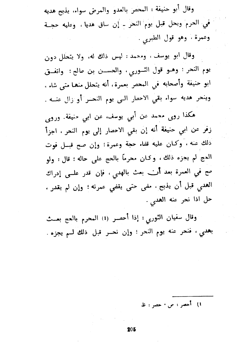 وَقَالَ أَبُو حَنِيفَةَ المحصر بالعدو والمرض صواء يَذْبَحُ هَدْيَهُ فِي الْحَرَمِ وَيَحِلُّ قَبْلَ يَوْمِ النَّحْرِ إِنْ سَاقَ هَدْيًا وَعَلَيْهِ حَجَّةٌ وَعُمْرَةٌ وهو قول الطبري وقال أبو يوسف ومحمد لَيْسَ ذَلِكَ لَهُ وَلَا يَتَحَلَّلُ دُونَ يَوْمِ النَّحْرِ وَهُوَ قَوْلُ الثَّوْرِيِّ وَالْحَسَنِ بْنِ صَالِحٍ وَاتَّفَقَ أَبُو حَنِيفَةَ وَأَصْحَابُهُ فِي الْمُحْصَرِ بِعُمْرَةٍ يَتَحَلَّلُ مِنْهَا مَتَى شَاءَ وَيَنْحَرُ هَدْيَهُ سَوَاءٌ بَقِيَ الْإِحْصَارُ إِلَى يَوْمِ النَّحْرِ أَوْ زَالَ عَنْهُ هَكَذَا رَوَى مُحَمَّدٌ عَنْ أَبِي يُوسُفَ عَنْ أَبِي حَنِيفَةَ وَرَوَى زُفَرُ عَنْ أَبِي حَنِيفَةَ أَنَّهُ إِنْ بَقِيَ الْإِحْصَارُ إِلَى يَوْمِ النَّحْرِ أَجْزَأَ ذَلِكَ عَنْهُ وَكَانَ عَلَيْهِ قَضَاءُ حَجَّةٍ وَعُمْرَةٍ وَإِنْ صَحَّ قَبْلَ فَوْتِ الْحَجِّ لَمْ يُجْزِهِ ذَلِكَ وَكَانَ مُحْرِمًا بِالْحَجِّ عَلَى حَالِهِ قَالَ وَلَوْ صَحَّ فِي الْعُمْرَةِ بَعْدَ أَنْ بَعَثَ بِالْهَدْيِ فَإِنْ قَدَرَ عَلَى إِدْرَاكِ الْهَدْيِ قَبْلَ أَنْ يَذْبَحَ مَضَى حَتَّى يَقْضِيَ عُمْرَتَهُ وَإِنْ لَمْ يَقْدِرْ حَلَّ إِذَا نُحِرَ عَنْهُ الْهَدْيُ وَقَالَ سُفْيَانُ الثَّوْرِيُّ إِذَا أُحْصِرَ الْمُحْرِمُ بِالْحَجِّ بَعَثَ بِهَدْيٍ فَنُحِرَ عَنْهُ يَوْمَ النَّحْرِ وَإِنْ نُحِرَ قَبْلَ ذَلِكَ لَمْ يُجْزِهِ
