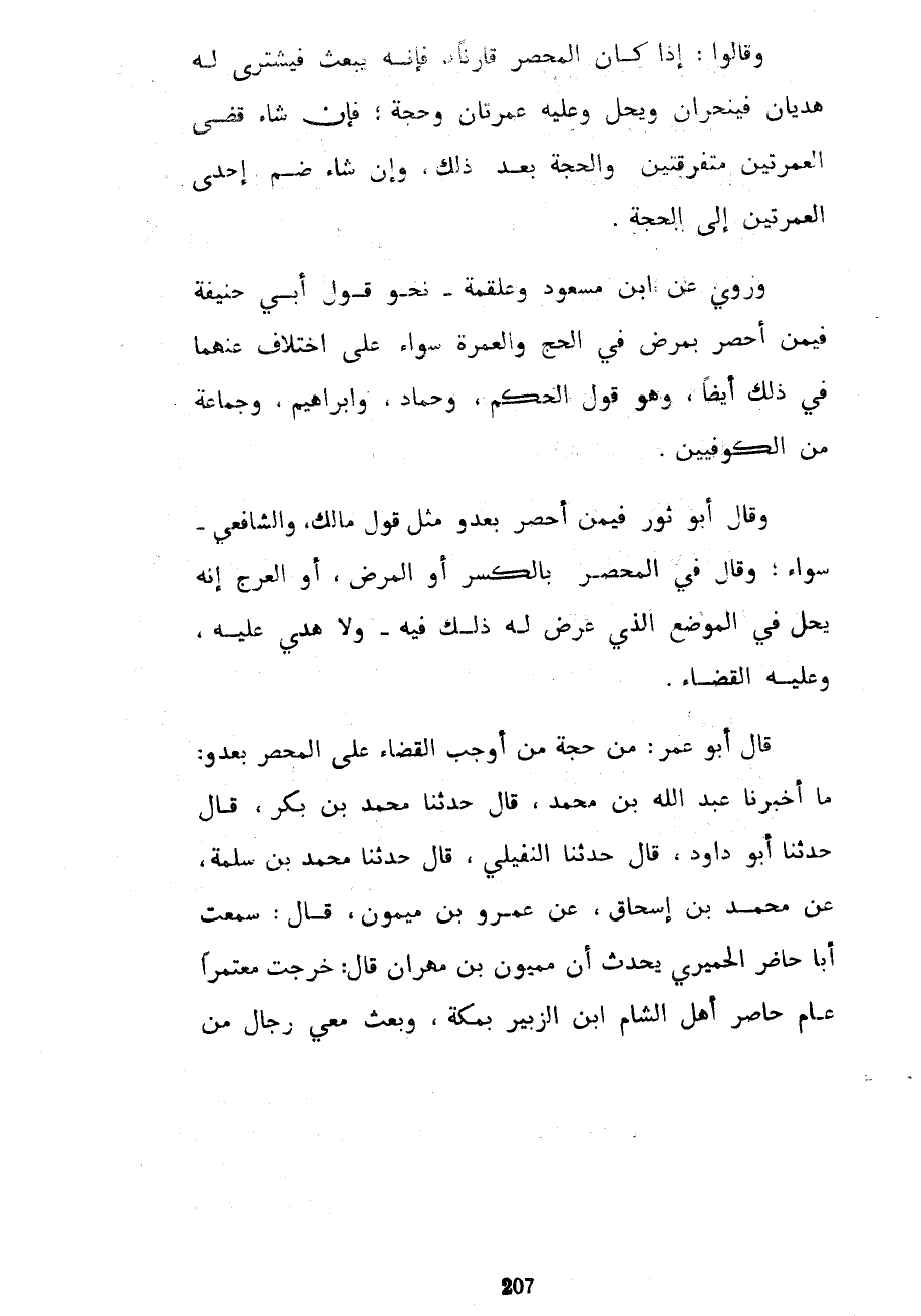 وَقَالُوا إِذَا كَانَ الْمُحْصَرُ قَارِنًا فَإِنَّهُ يَبْعَثُ فَيُشْتَرَى لَهُ هَدْيَانِ فَيُنْحَرَانِ وَيَحِلُّ وَعَلَيْهِ عُمْرَتَانِ وَحَجَّةٌ فَإِنْ شَاءَ قَضَى الْعُمْرَتَيْنِ مُتَفَرِّقَتَيْنِ وَالْحَجَّةَ بَعْدَ ذَلِكَ وَإِنْ شَاءَ ضَمَّ إِحْدَى الْعُمْرَتَيْنِ إِلَى الْحَجَّةِ وَرُوِيَ عَنِ ابْنِ مَسْعُودٍ وَعَلْقَمَةَ نَحْوُ قَوْلِ أَبِي حَنِيفَةَ فِيمَنْ أُحْصِرَ بِمَرَضٍ فِي الْحَجِّ وَالْعُمْرَةِ سَوَاءٌ عَلَى اخْتِلَافٍ عَنْهُمَا فِي ذَلِكَ أَيْضًا وَهُوَ قَوْلُ الْحَكَمِ وَحَمَّادٍ وَإِبْرَاهِيمَ وَجَمَاعَةٍ مِنَ الْكُوفِيِّينَ وَقَالَ أَبُو ثَوْرٍ فِيمَنْ أُحْصِرَ بِعَدُوٍّ مِثْلَ قَوْلِ مَالِكٍ وَالشَّافِعِيِّ سَوَاءً وَقَالَ فِي الْمُحْصَرِ بِالْكَسْرِ أَوِ الْمَرَضِ أَوِ الْعَرَجِ إِنَّهُ يَحِلُّ فِي الْمَوْضِعِ الَّذِي عَرَضَ لَهُ ذَلِكَ فِيهِ وَلَا هَدْيَ عَلَيْهِ وَعَلَيْهِ الْقَضَاءُ قَالَ أَبُو عُمَرَ مِنْ حُجَّةِ مَنْ أَوْجَبَ الْقَضَاءَ عَلَى الْمُحْصَرِ بِعَدُوٍّ مَا أَخْبَرَنَا عَبْدُ اللَّهِ بْنُ مُحَمَّدٍ قَالَ حَدَّثَنَا مُحَمَّدُ بْنُ بَكْرٍ قَالَ حَدَّثَنَا أَبُو دَاوُدَ قَالَ حَدَّثَنَا النُّفَيْلِيُّ قَالَ حَدَّثَنَا مُحَمَّدُ بْنُ سَلَمَةَ عَنْ مُحَمَّدِ بْنِ إِسْحَاقَ عَنْ عَمْرِو بْنِ مَيْمُونٍ قَالَ سَمِعْتُ أَبَا حَاضِرٍ الْحِمْيَرِيَّ يُحَدِّثُ أَنَّ مَيْمُونَ بْنَ مِهْرَانَ قَالَ خَرَجْتُ مُعْتَمِرًا عَامَ حَاصَرَ أَهْلُ الشَّامِ ابْنَ الزُّبَيْرِ بِمَكَّةَ وَبَعَثَ مَعِي رِجَالٌ مِنْ