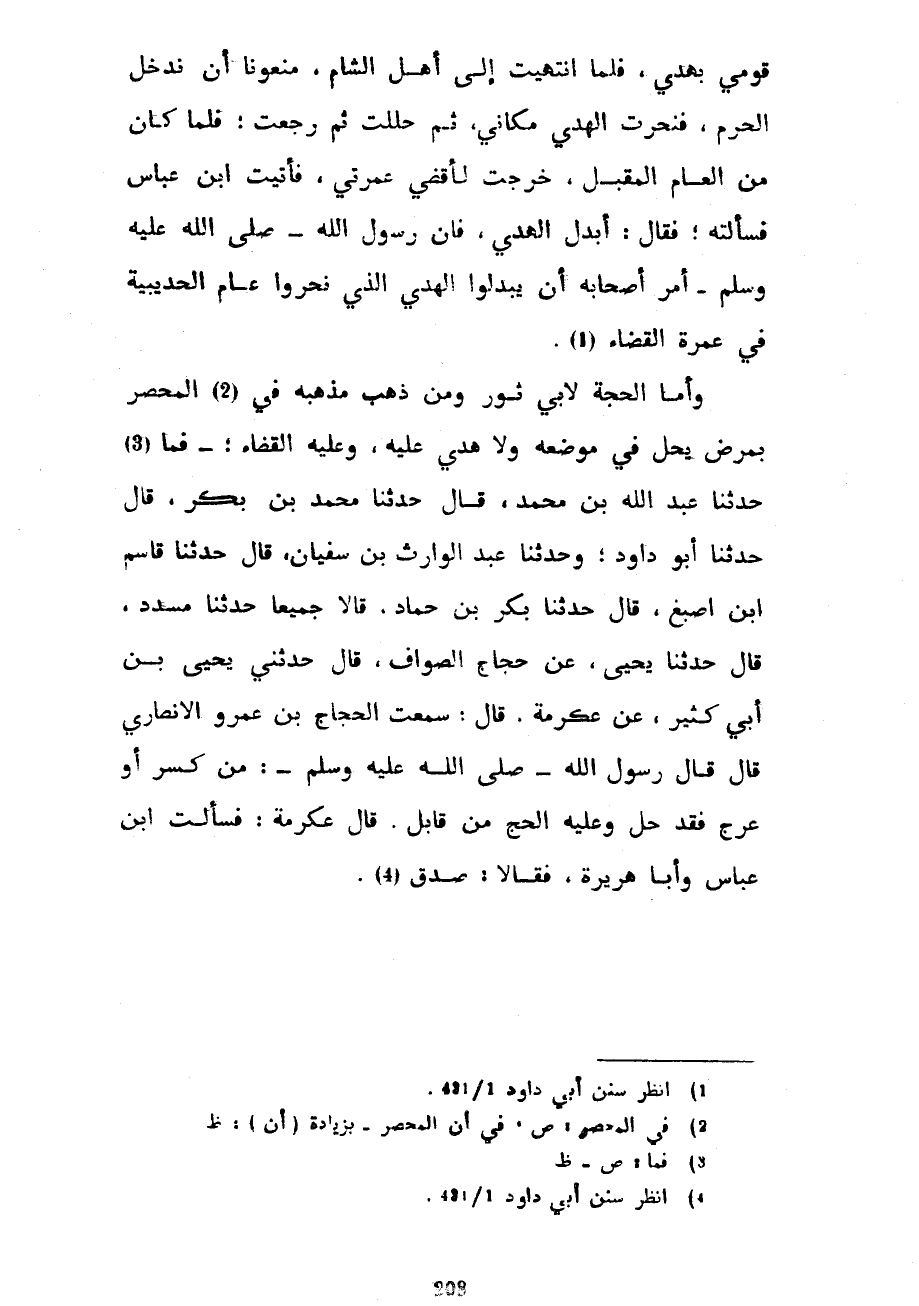 قَوْمِي بِهَدْيٍ فَلَمَّا انْتَهَيْتُ إِلَى أَهْلِ الشَّامِ مَنَعُونَا أَنْ نَدْخُلَ الْحَرَمَ فَنَحَرْتُ الْهَدْيَ مَكَانِي ثُمَّ حَلَلْتُ ثُمَّ رَجَعْتُ فَلَمَّا كَانَ مِنَ الْعَامِ الْمُقْبِلِ خَرَجْتُ لِأَقْضِيَ عُمْرَتِي فَأَتَيْتُ ابْنَ عَبَّاسٍ فَسَأَلْتُهُ فَقَالَ أَبْدِلِ الْهَدْيَ فَإِنَّ رَسُولَ اللَّهِ صَلَّى اللَّهُ عَلَيْهِ وَسَلَّمَ أَمَرَ أَصْحَابَهُ أَنْ يُبَدِّلُوا الْهَدْيَ الَّذِي نَحَرُوا عَامَ الْحُدَيْبِيَةِ فِي عُمْرَةِ الْقَضَاءِ وَأَمَّا الْحُجَّةُ لِأَبِي ثَوْرٍ وَمَنْ ذَهَبَ مَذْهَبَهُ فِي الْمُحْصَرِ بِمَرَضٍ يَحِلُّ فِي مَوْضِعِهِ وَلَا هَدْيَ عَلَيْهِ وَعَلَيْهِ الْقَضَاءُ فَمَا حَدَّثَنَا عَبْدُ اللَّهِ بْنُ مُحَمَّدٍ قَالَ حَدَّثَنَا مُحَمَّدُ بْنُ بَكْرٍ قَالَ حَدَّثَنَا أَبُو دَاوُدَ وَحَدَّثَنَا عَبْدُ الْوَارِثِ بْنُ سُفْيَانَ قَالَ حَدَّثَنَا قَاسِمُ بْنُ أَصْبَغَ قَالَ حَدَّثَنَا بَكْرُ بْنُ حَمَّادٍ قَالَا جَمِيعًا حَدَّثَنَا مُسَدَّدٌ قَالَ حَدَّثَنَا يَحْيَى عَنْ حَجَّاجٍ الصَّوَّافِ قَالَ حَدَّثَنِي يَحْيَى بْنُ أَبِي كَثِيرٍ عَنْ عكرمة قال سَمِعْتُ الْحَجَّاجَ بْنَ عَمْرٍو الْأَنْصَارِيِّ قَالَ قَالَ رَسُولُ اللَّهِ صَلَّى اللَّهُ عَلَيْهِ وسلم من كُسِرَ أَوْ عَرِجَ فَقَدْ حَلَّ وَعَلَيْهِ الْحَجُّ مِنْ قَابِلٍ قَالَ عِكْرِمَةُ فَسَأَلْتُ ابْنَ عَبَّاسٍ وَأَبَا هُرَيْرَةَ فَقَالَا صَدَقَ