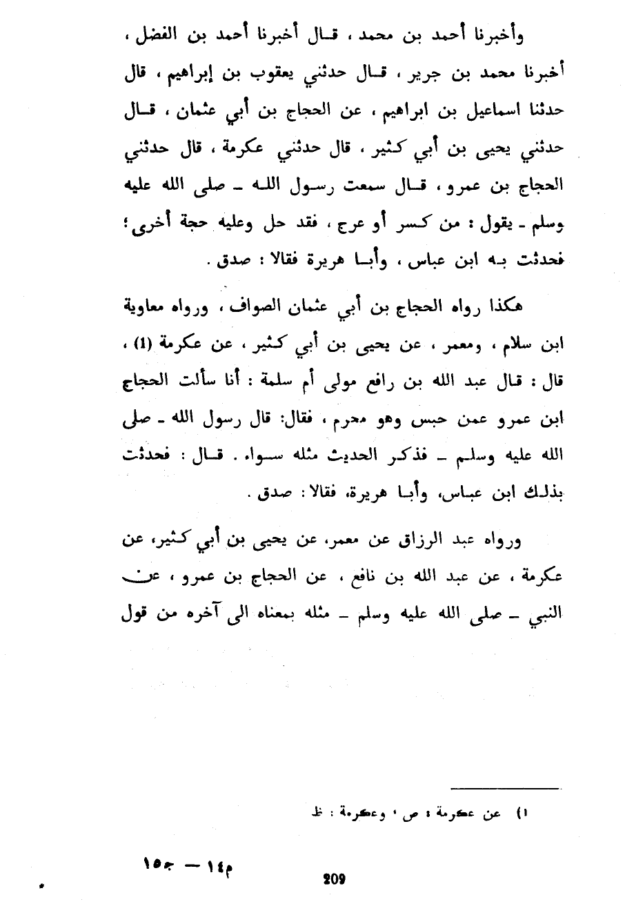 وَأَخْبَرَنَا أَحْمَدُ بْنُ مُحَمَّدٍ قَالَ أَخْبَرَنَا أَحْمَدُ بْنُ الْفَضْلِ أَخْبَرَنَا مُحَمَّدُ بْنُ جَرِيرٍ قَالَ حَدَّثَنِي يَعْقُوبُ بْنُ إِبْرَاهِيمَ قَالَ حَدَّثَنَا إِسْمَاعِيلُ بْنُ إِبْرَاهِيمَ عَنِ الْحَجَّاجِ بْنِ أَبِي عُثْمَانَ قَالَ حَدَّثَنِي يَحْيَى بْنُ أَبِي كَثِيرٍ قَالَ حَدَّثَنِي عِكْرِمَةُ قَالَ حَدَّثَنِي الْحَجَّاجُ بْنُ عَمْرٍو قَالَ سَمِعْتُ رَسُولَ اللَّهِ صَلَّى اللَّهُ عَلَيْهِ وَسَلَّمَ يَقُولُ مَنْ كُسِرَ أَوْ عَرِجَ فَقَدْ حَلَّ وَعَلَيْهِ حُجَّةٌ أُخْرَى فَحَدَّثْتُ بِهِ ابْنَ عَبَّاسٍ وَأَبَا هُرَيْرَةَ فَقَالَا صَدَقَ هَكَذَا رَوَاهُ الْحَجَّاجُ بْنُ أَبِي عُثْمَانَ الصَّوَّافُ وَرَوَاهُ مُعَاوِيَةُ بْنُ سَلَّامٍ وَمَعْمَرٌ عَنْ يَحْيَى بْنِ أَبِي كَثِيرٍ عَنْ عِكْرِمَةَ قَالَ قَالَ عَبْدِ اللَّهِ بْنِ رَافِعٍ مَوْلَى أُمِّ سَلَمَةَ أَنَا سَأَلْتُ الْحَجَّاجَ بْنَ عَمْرٍو عَمَّنْ حُبِسَ وَهُوَ مُحْرِمٌ فَقَالَ قَالَ رَسُولُ اللَّهِ صَلَّى اللَّهُ عَلَيْهِ وَسَلَّمَ فَذَكَرَ الْحَدِيثَ مِثْلَهُ سَوَاءً قَالَ فَحَدَّثْتُ بِذَلِكَ ابْنَ عَبَّاسٍ وَأَبَا هُرَيْرَةَ فَقَالَا صَدَقَ وَرَوَاهُ عَبْدُ الرَّزَّاقِ عَنْ مَعْمَرٌ عَنْ يَحْيَى بْنِ أَبِي كَثِيرٍ عَنْ عِكْرِمَةَ عَنْ عَبْدِ اللَّهِ بْنِ نَافِعٍ عَنِ الْحَجَّاجِ بْنِ عَمْرٍو عَنِ النَّبِيِّ صَلَّى اللَّهُ عَلَيْهِ وسلم مثله بمعناه إِلَى آخِرِهِ مِنْ قَوْلِ