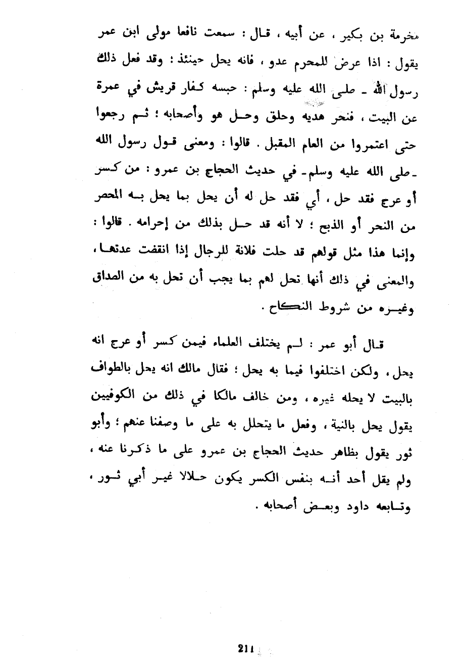 مَخْرَمَةُ بْنُ بُكَيْرٍ عَنْ أَبِيهِ قَالَ سَمِعْتُ نَافِعًا مَوْلَى ابْنِ عُمَرَ يَقُولُ إِذَا عَرَضَ لِلْمُحْرِمِ عَدُوٌّ فَإِنَّهُ يَحِلُّ حِينَئِذٍ وَقَدْ فَعَلَ ذَلِكَ رَسُولُ اللَّهِ صَلَّى اللَّهُ عَلَيْهِ وَسَلَّمَ حَبَسَهُ كُفَّارُ قُرَيْشٍ فِي عُمْرَةٍ عَنِ الْبَيْتِ فَنَحَرَ هَدْيَهُ وَحَلَقَ وَحَلَّ هُوَ وَأَصْحَابُهُ ثُمَّ رَجَعُوا حَتَّى اعْتَمَرُوا مِنَ الْعَامِ الْمُقْبِلِ قَالُوا وَمَعْنَى قَوْلِ رَسُولِ اللَّهِ صَلَّى اللَّهُ عَلَيْهِ وَسَلَّمَ فِي حَدِيثِ الْحَجَّاجِ بْنِ عَمْرٍو مَنْ كُسِرَ أَوْ عَرِجَ فَقَدْ حَلَّ أَيْ فَقَدْ حَلَّ لَهُ أَنْ يَحِلَّ بِمَا يَحِلُّ بِهِ الْمُحْصَرُ مِنَ النَّحْرِ أَوِ الذَّبْحِ لَا أَنَّهُ قد حل بذل مِنْ إِحْرَامِهِ قَالُوا وَإِنَّمَا هَذَا مِثْلُ قَوْلِهِمْ قَدْ حَلَّتْ فُلَانَةُ لِلرِّجَالِ إِذَا انْقَضَتْ عِدَّتُهَا وَالْمَعْنَى فِي ذَلِكَ أَنَّهَا تَحِلُّ لَهُمْ بِمَا يَجِبُ أَنْ تَحِلَّ بِهِ مِنَ الصَّدَاقِ وَغَيْرِهِ مِنْ شُرُوطِ النِّكَاحِ قَالَ أَبُو عُمَرَ لَمْ يَخْتَلِفِ الْعُلَمَاءُ فِيمَنْ كُسِرَ أَوْ عَرِجَ أَنَّهُ يَحِلُّ وَلَكِنِ اخْتَلَفُوا فِيمَا بِهِ يَحِلُّ فَقَالَ مَالِكٌ إِنَّهُ يَحِلُّ بِالطَّوَافِ بِالْبَيْتِ لَا يَحِلُّهُ غَيْرُهُ وَمَنْ خَالَفَ مَالِكًا فِي ذَلِكَ مِنَ الْكُوفِيِّينَ يَقُولُ يَحِلُّ بِالنِّيَّةِ وَفِعْلِ مَا يُتَحَلَّلُ بِهِ عَلَى مَا وَصَفْنَا عَنْهُمْ وَأَبُو ثَوْرٍ يَقُولُ بِظَاهِرِ حَدِيثِ الْحَجَّاجِ بْنِ عَمْرٍو عَلَى مَا ذَكَرْنَا عَنْهُ وَلَمْ يَقُلْ أَحَدٌ أَنَّهُ بِنَفْسِ الْكَسْرِ يَكُونُ حَلَالًا غَيْرُ أَبِي ثَوْرٍ وَتَابَعَهُ دَاوُدُ وَبَعْضُ أَصْحَابِهِ