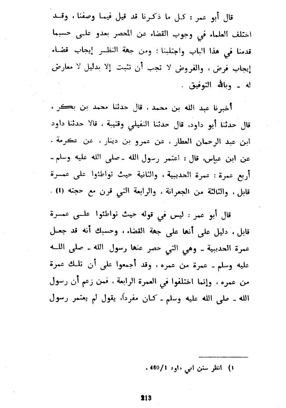 قَالَ أَبُو عُمَرَ كُلُّ مَا ذَكَرْنَا قَدْ قِيلَ فِيمَا وَصَفْنَا وَقَدِ اخْتَلَفَ الْعُلَمَاءُ فِي وُجُوبِ الْقَضَاءِ عَنِ الْمُحْصَرِ بِعَدُوٍّ عَلَى حَسْبَمَا قَدَّمْنَا فِي هَذَا الْبَابِ وَاجْتَلَبْنَا وَمِنْ جِهَةِ النَّظَرِ إِيجَابُ قَضَاءٍ إِيجَابُ فَرْضٍ وَالْفُرُوضُ لَا تَجِبُ أَنْ تَثْبُتَ إِلَّا بِدَلِيلٍ لَا مُعَارِضَ لَهُ وَبِاللَّهِ التَّوْفِيقِ أَخْبَرَنَا عَبْدُ اللَّهِ بْنُ مُحَمَّدٍ قَالَ حَدَّثَنَا مُحَمَّدُ بْنُ بَكْرٍ قَالَ حَدَّثَنَا أَبُو دَاوُدَ قَالَ حَدَّثَنَا النُّفَيْلِيُّ وَقُتَيْبَةُ قالا حدثنا داود بن عبد الرحمان الْعَطَّارُ عَنْ عَمْرِو بْنِ دِينَارٍ عَنْ عِكْرِمَةَ عَنِ ابْنِ عَبَّاسٍ قَالَ اعْتَمَرَ رَسُولُ اللَّهِ صَلَّى اللَّهُ عَلَيْهِ وسلم أربع عمرة عُمْرَةُ الْحُدَيْبِيَةِ وَالثَّانِيَةُ حَيْثُ تَوَاطَئُوا عَلَى عُمْرَةِ قَابِلٍ وَالثَّالِثَةُ مِنَ الْجِعِرَّانَةِ وَالرَّابِعَةُ الَّتِي قَرَنَ مَعَ حَجَّتِهِ قَالَ أَبُو عُمَرَ لَيْسَ فِي قَوْلِهِ حَيْثُ تَوَاطَئُوا عَلَى عُمْرَةِ قَابِلٍ دَلِيلٌ عَلَى أَنَّهَا عَلَى جِهَةِ الْقَضَاءِ وَحَسْبُكَ أَنَّهُ قَدْ جَعَلَ عُمْرَةَ الْحُدَيْبِيَةِ وَهِيَ الَّتِي حُصِرَ عَنْهَا رَسُولَ اللَّهِ صَلَّى اللَّهُ عَلَيْهِ وَسَلَّمَ عُمْرَةً مِنْ عُمَرِهِ وَقَدْ أَجْمَعُوا عَلَى أَنَّ تِلْكَ عُمْرَةٌ مِنْ عُمَرِهِ وَإِنَّمَا اخْتَلَفُوا فِي الْعُمْرَةِ الرَّابِعَةِ فَمَنْ زَعَمَ أَنَّ رَسُولَ اللَّهِ صَلَّى اللَّهُ عَلَيْهِ وَسَلَّمَ كَانَ مُفْرِدًا يَقُولُ لَمْ يَعْتَمِرْ رَسُولُ